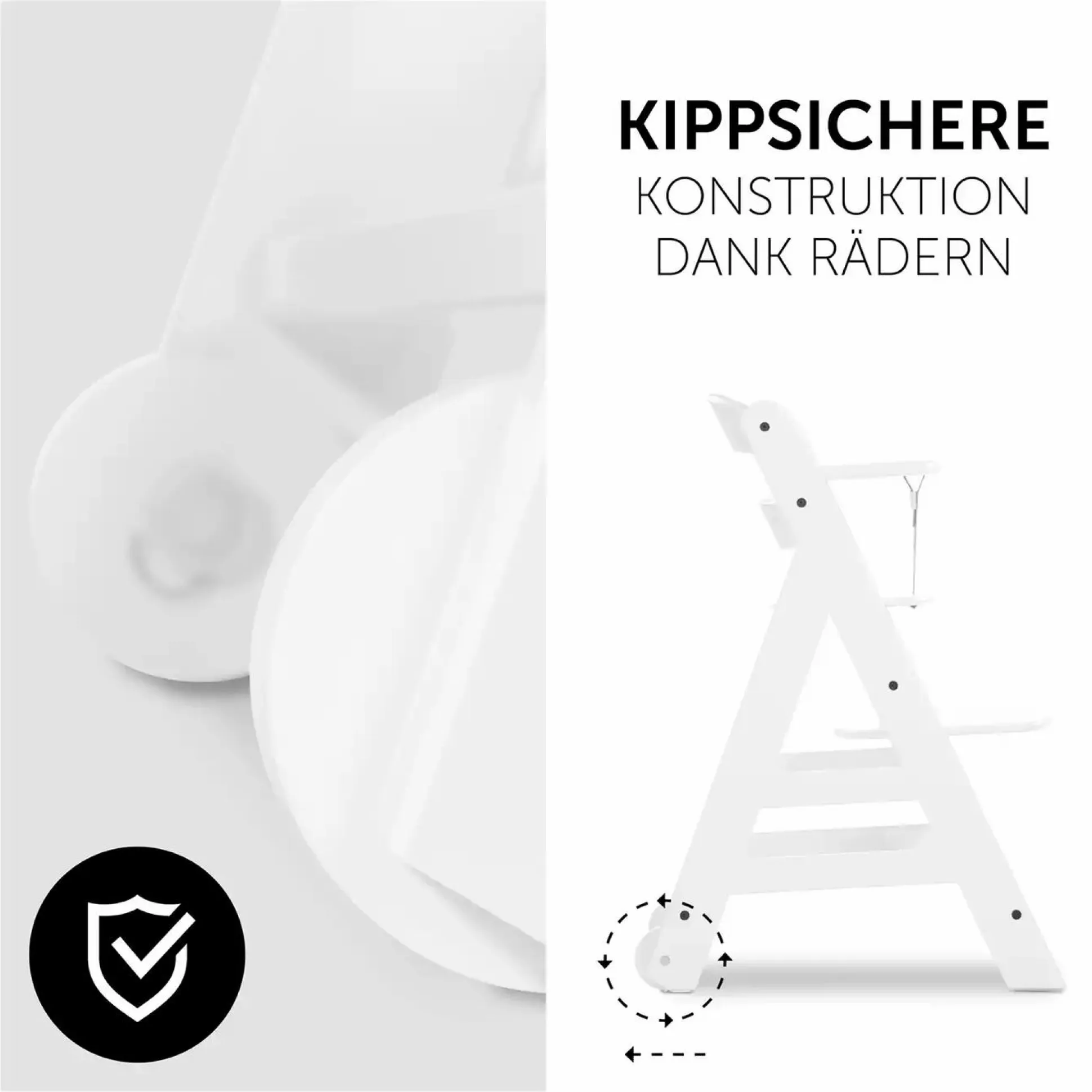 - besonders kippsichere Konstruktion durch integrierte Holzräder