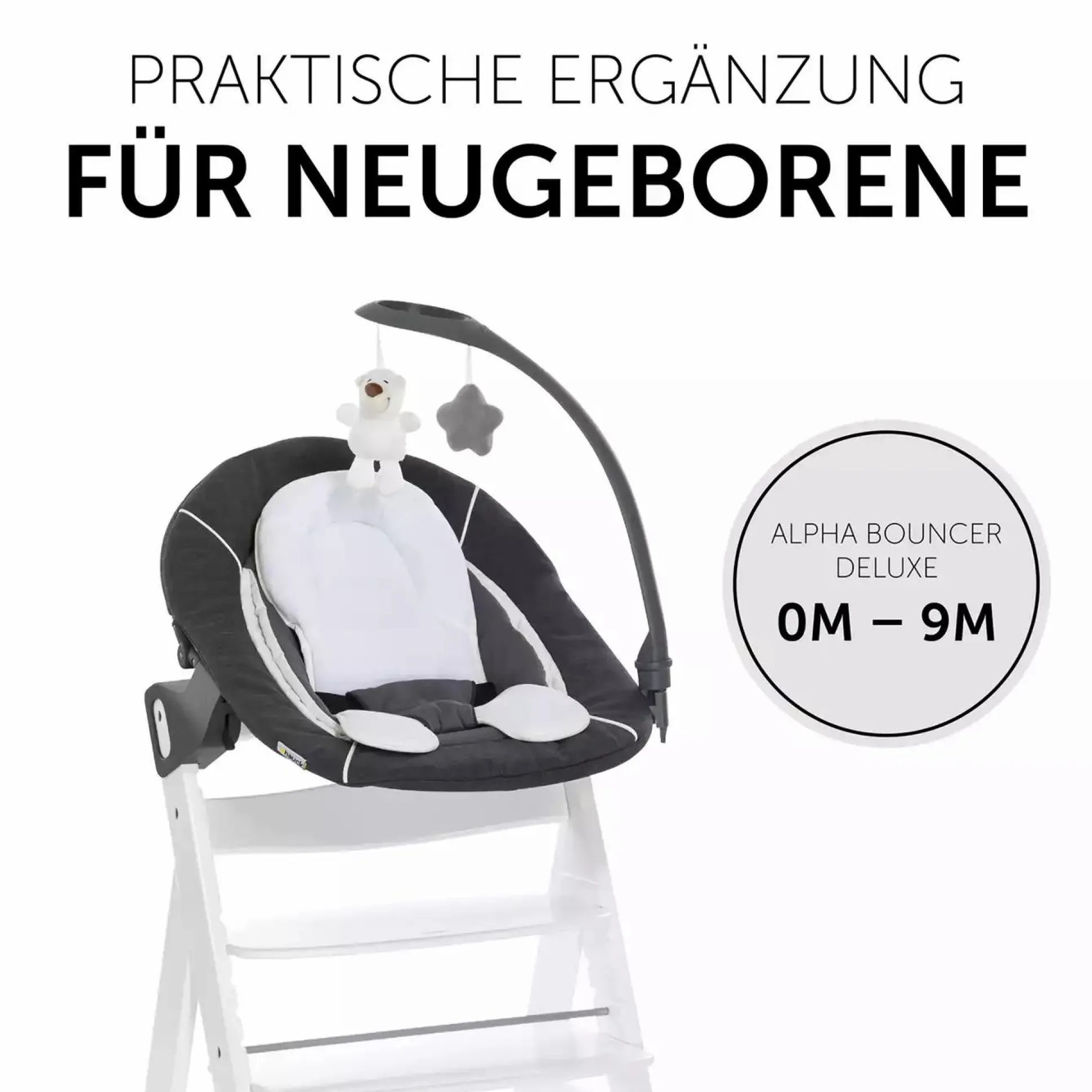 Neugeborene fühlen sich in dem Neugeborenenaufsatz Alpha Bouncer Deluxe besonders wohl, denn sie können auf Augenhöhe am Familiengeschehen teilhaben. Die Rückenlehne lässt sich per Einhand-Bedienung in Liegeposition verstellen, so finden Eltern immer die richtige Position zum Füttern oder Spielen. Ein Mobile sowie die Möglichkeit, den Aufsatz auch als Babywippe zu nutzen, sorgen für entspannte Abwechslung. Die süßen Anhänger am Mobile regen deinen kleinen Liebling zudem zum Greifen und Drehen an und fördern die motorischen Fähigkeiten. Der Spielebogen kann jederzeit zur Seite gedreht oder abgenommen werden. Der 3-Punkt-Gurt sorgt zusätzlich für Sicherheit. Der ergonomisch geformte und weich gepolsterte Alpha Bouncer Deluxe lässt sich mit nur wenigen Handgriffen direkt auf dem hauck Holzhochstuhl montieren. Der im Lieferumfang enthaltene Sitzverkleinerer stützt das Köpfchen und die zusätzliche seitliche Polsterung sorgt für höchsten Komfort. Möchte der Nachwuchs lieber etwas Abwechslung, wird der Babyaufsatz einfach auf dem mitgelieferten Untergestell befestigt und als Wippe weitergenutzt. Durch die Bewegungen des Babys schwingt diese sanft hin und her und wirkt so besonders beruhigend aufs Kind.