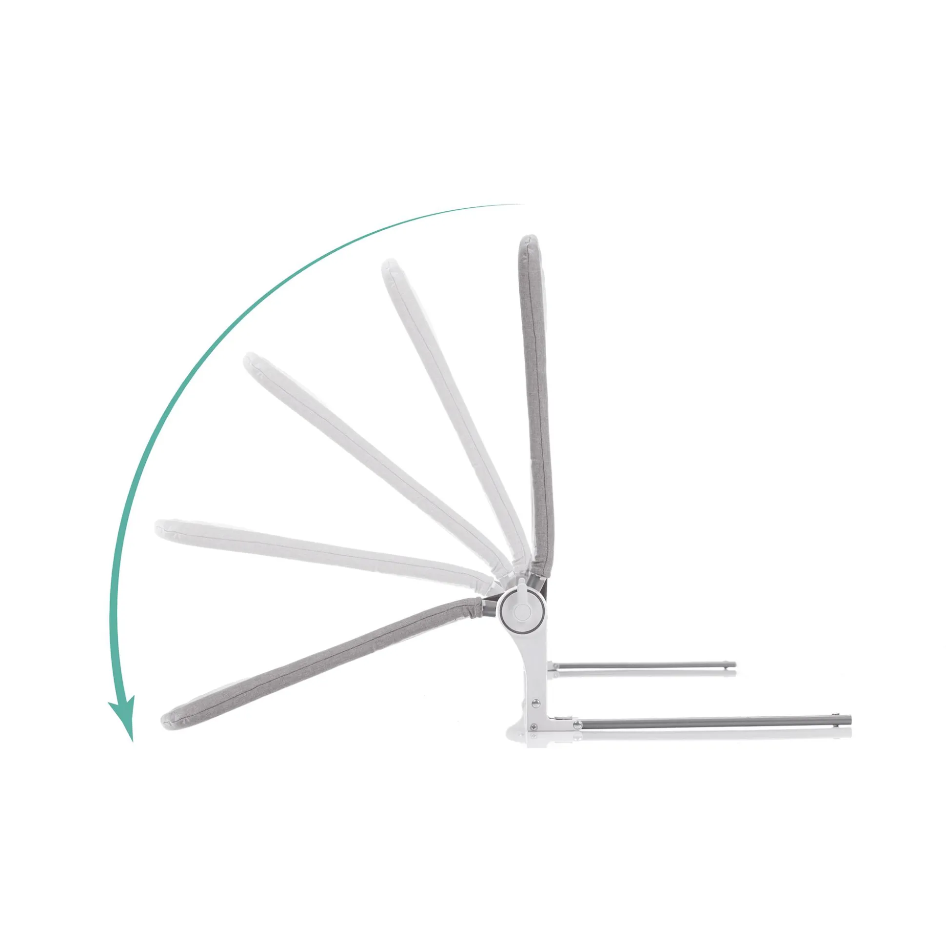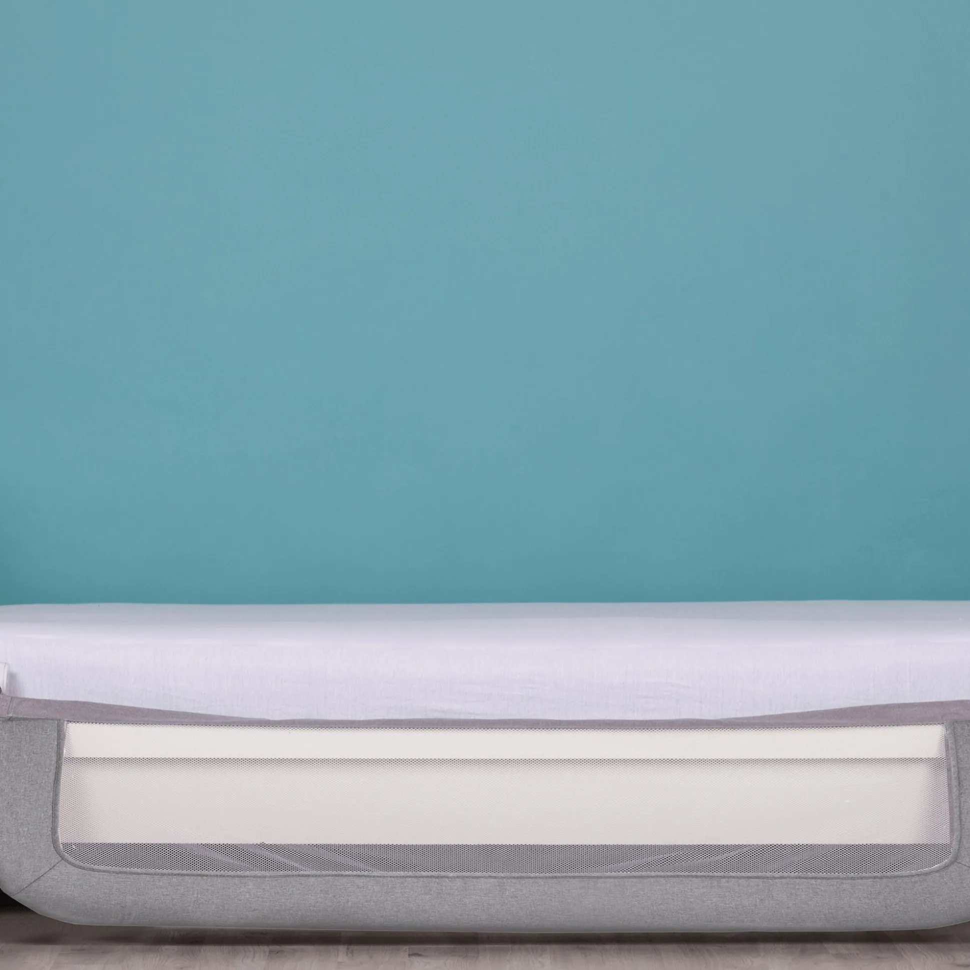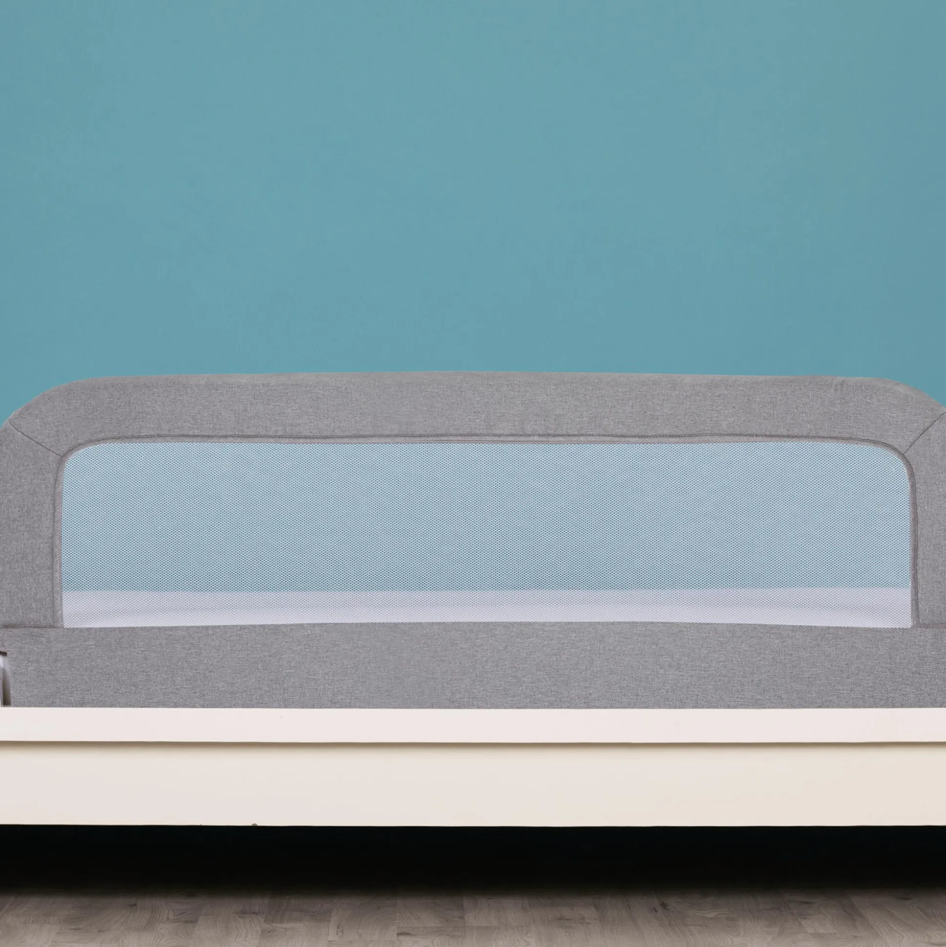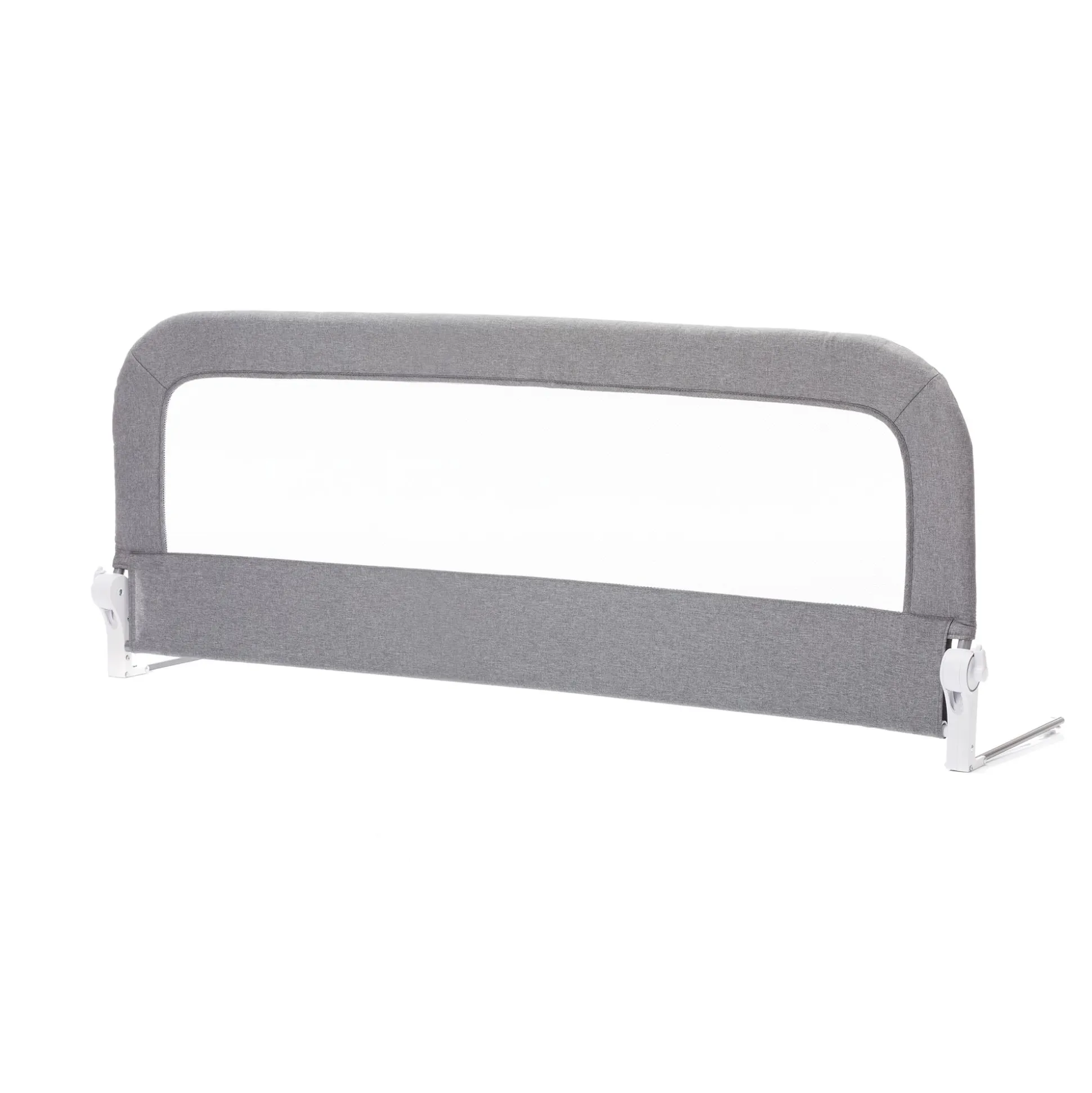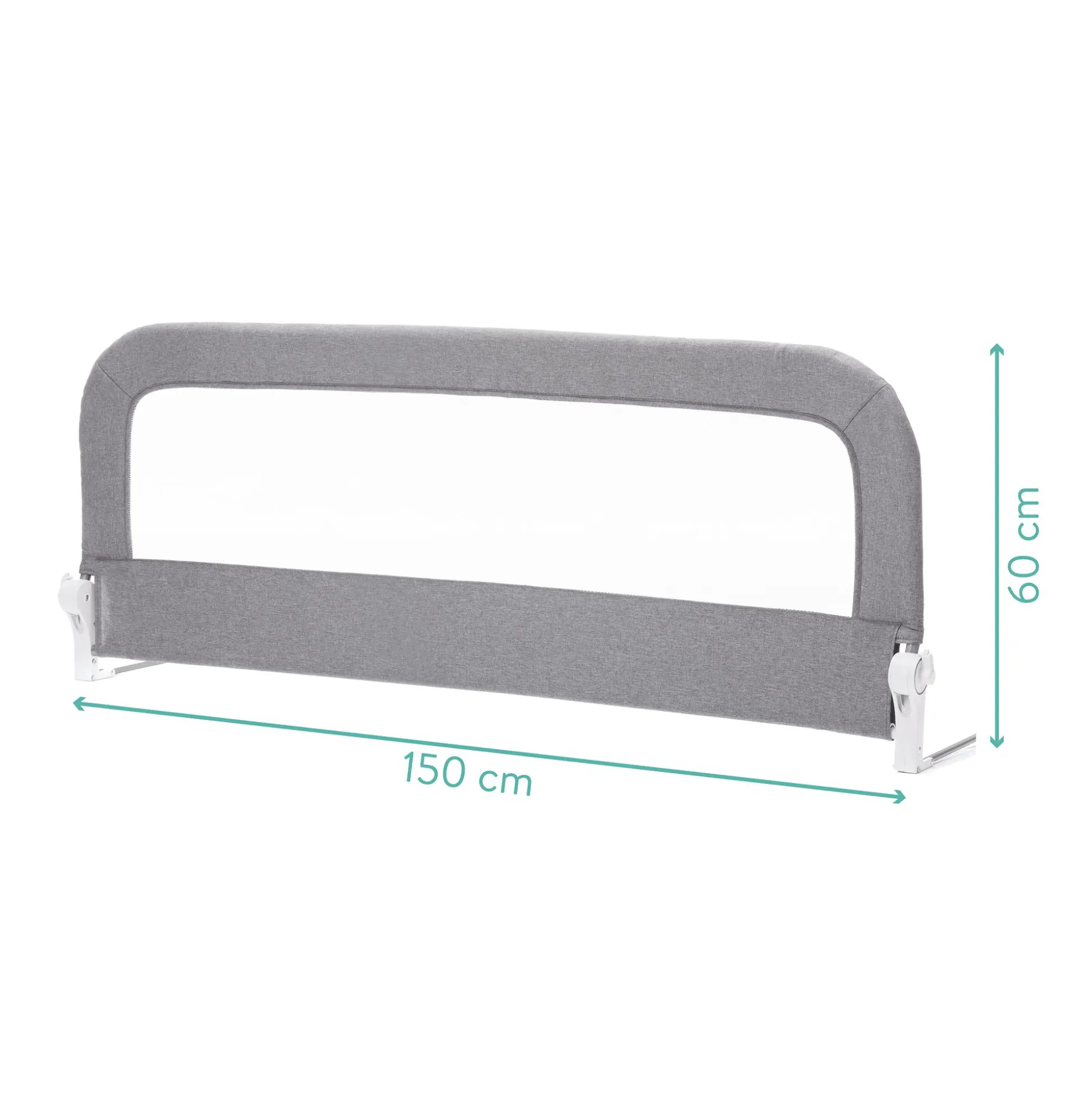 Mittels einer speziellen Klappfunktion kann das graue Bettgitter mit den Maßen 150 x 60 cm tagsüber bei Nichtgebrauch ganz einfach heruntergeklappt werden und abends, sobald sich dein Kind zum Schlummern ins Bettchen legt, wieder aufrecht gestellt werden.