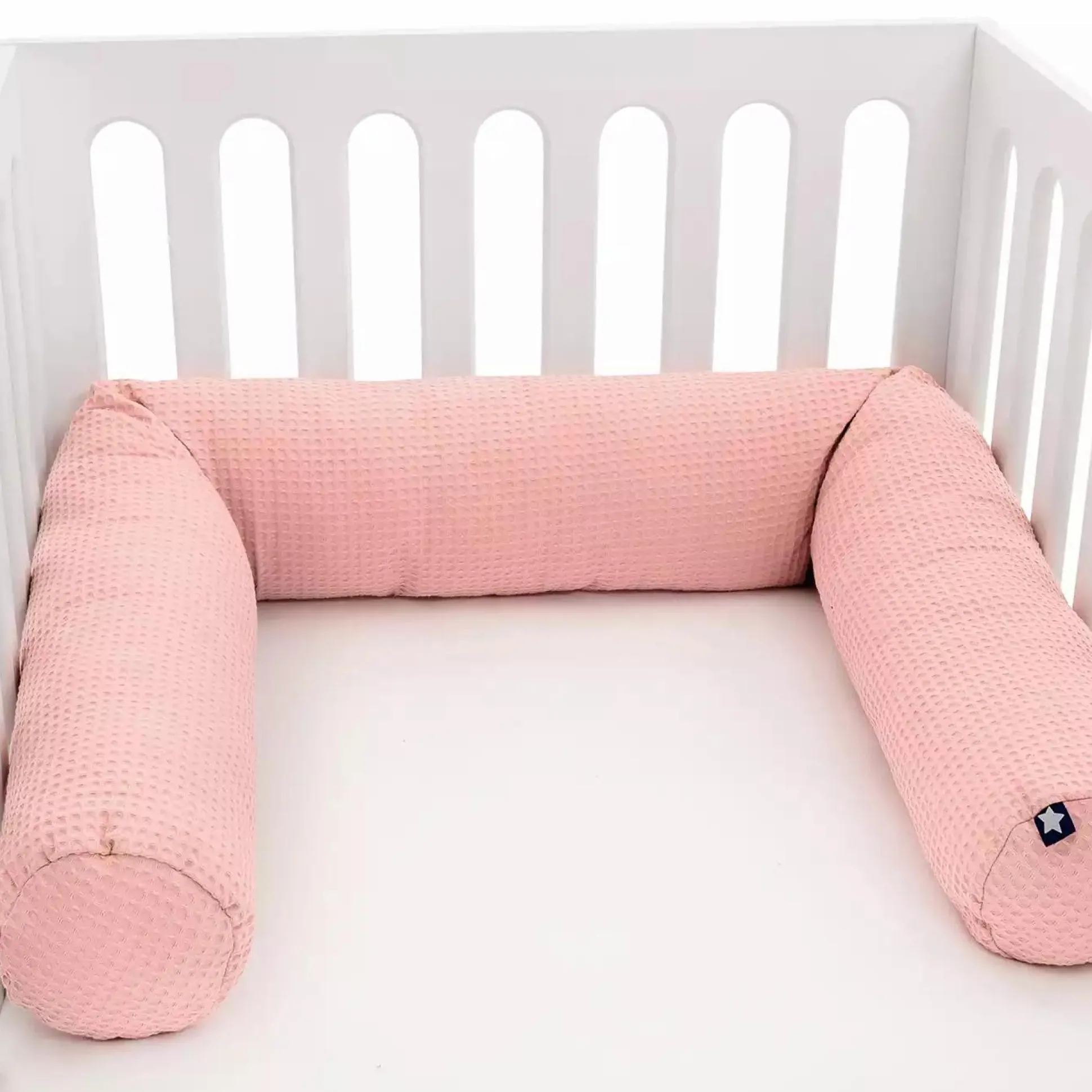 In einem Gitterbettchen schlafen Babys sicher. Diese zusätzliche Julius Zöllner Nestchenschlange Waffelpiqué Blush sorgt dafür, dass Babys sich nicht an den harten Stäben stoßen können. Die Bettschlange ist weich, schützt zudem vor Zugluft und sorgt für eine Schlafumgebung, in der sich das Baby geborgen fühlt.