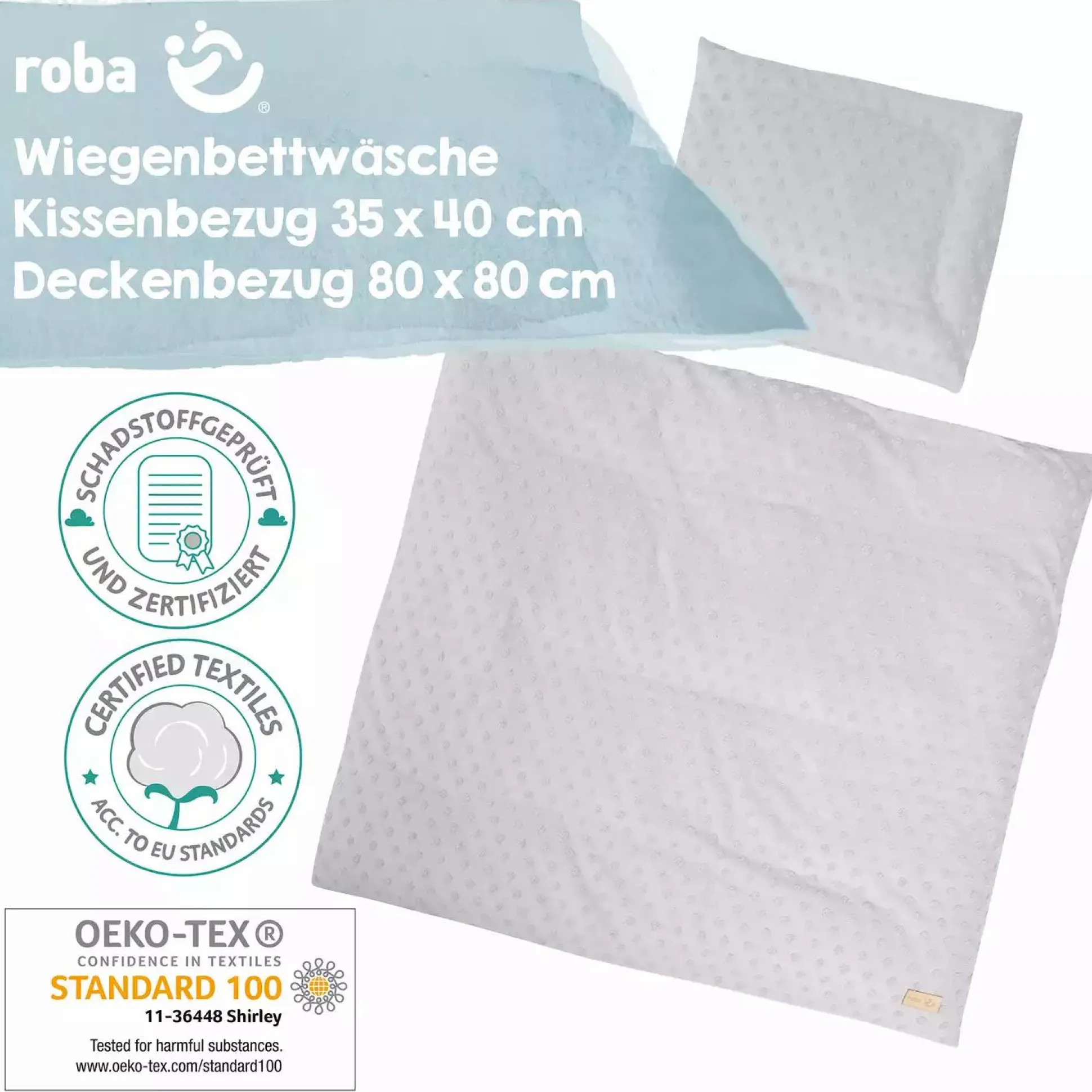 Die kuschelige Bettwäsche von Roba besteht aus hochwertiger Baumwolle. Im niedlichen Design Terry Dots bietet sie deinem Baby höchsten Schlafkomfort. Die Roba Bettwäsche Terry Dots ist GOTS zertifiziert.
