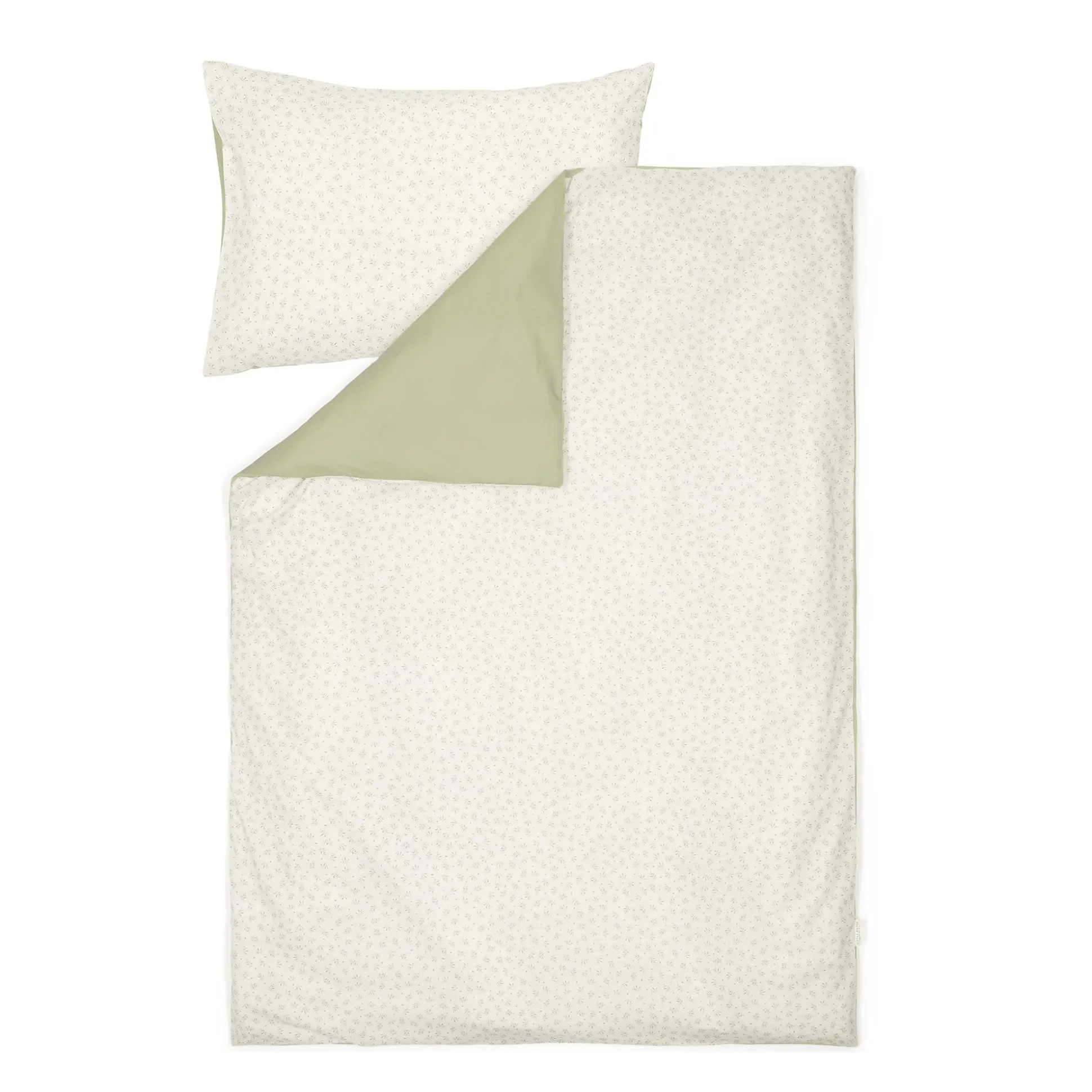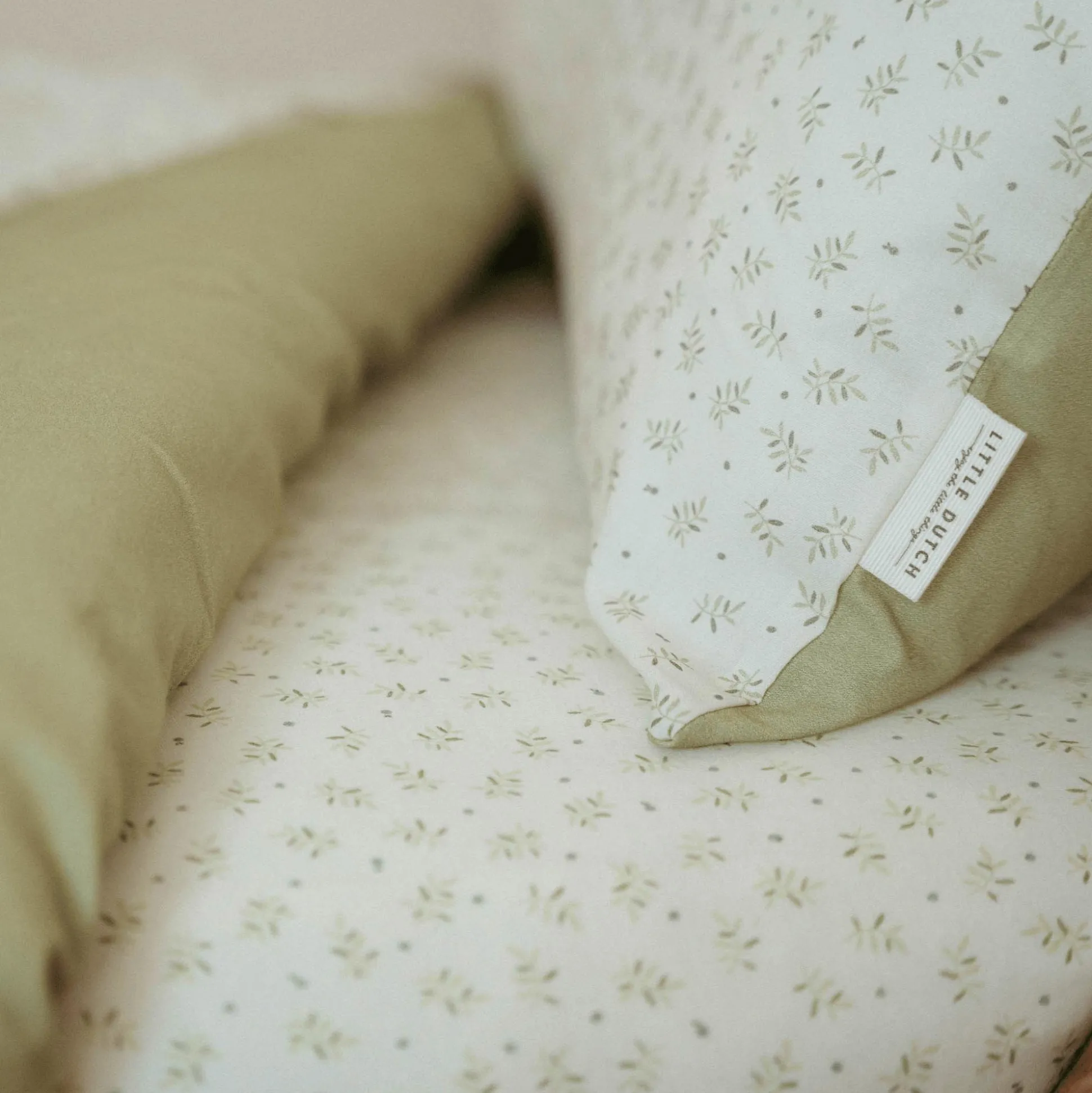 Die Bettwäsche Blueberry Leaves von Little Dutch verwandelt das Kinderbett deines kleinen Lieblings in einen zauberhaften Märchenwald.Die kuschelweiche Wendebettwäsche besteht aus einem Bett- und Kissenbezug, die durch zwei tolle Designs überzeugen. Eine Seite wird von einem liebevollen, floralen Print verziert, während die andere Seite in einem stilvollen Sage Green gehalten ist.Dank 100% Bio-Baumwolle ist die Bettwäsche kuschelweich, besonders atmungsaktiv und super bequem. Sie lädt deinen Schatz zum Träumen von der Natur, verzauberten Wäldern und märchenhaften Gärten ein und sorgt für ein magisches Schlafgefühl.