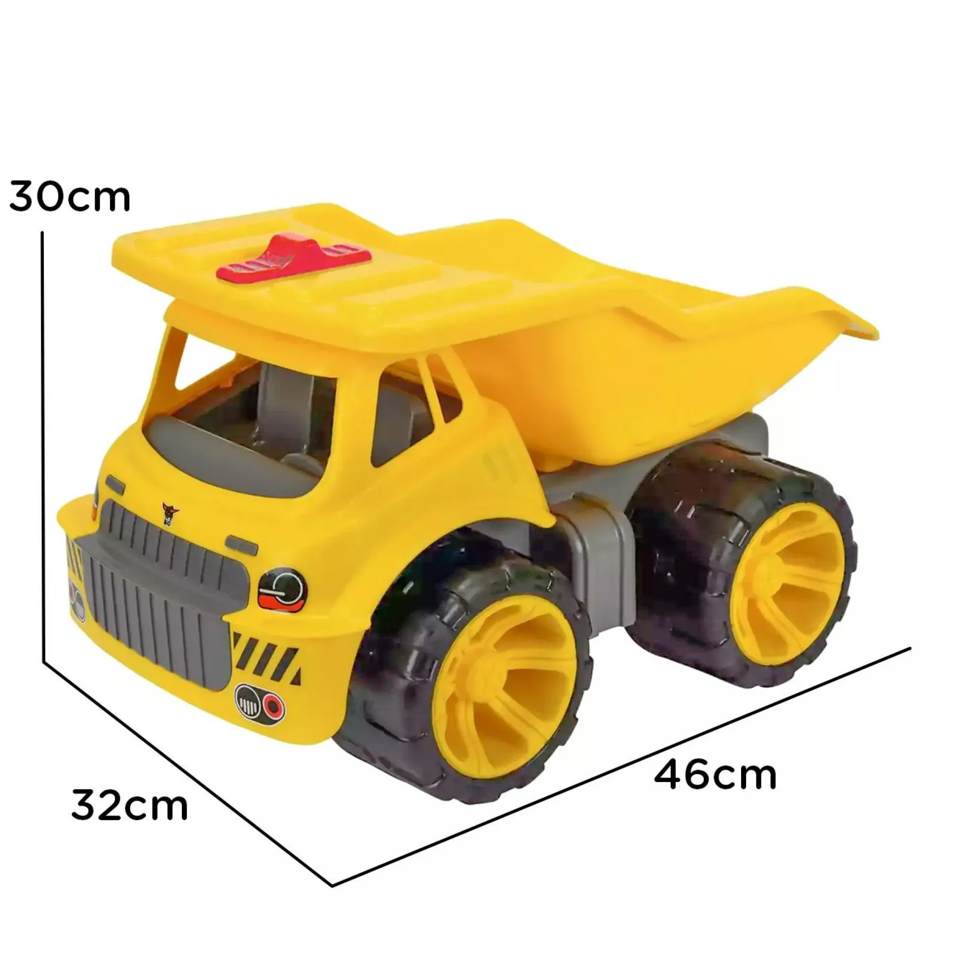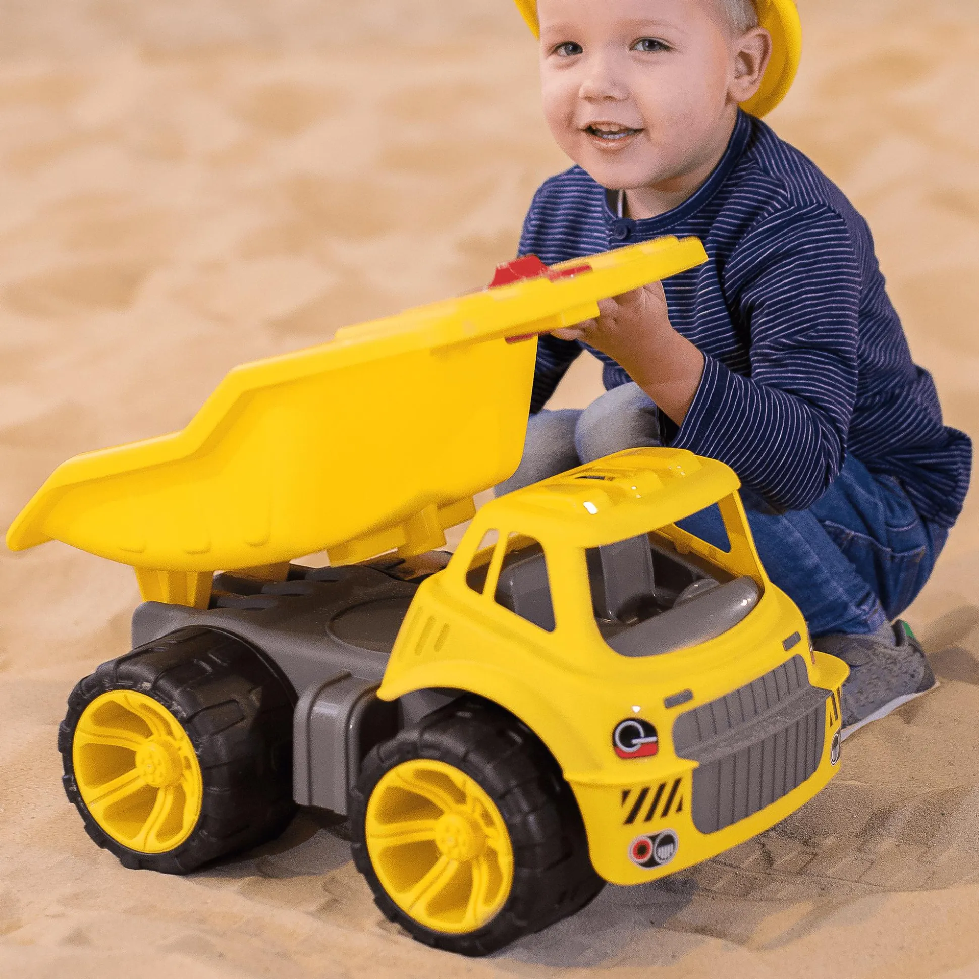 Leuchtendes Gelb in Verbindung mit modernen Aufklebern lassen den Kindertransporter aussehen wie die großen Originale und machen ihn damit zum Blickfang auf kleinen Baustellen. Das Design des Baufahrzeuges ist speziell auf die Ergonomie kleiner Kinderhände abgestimmt, so dass diese den Truck leicht schieben, transportieren oder die Ladefläche leeren können. Ein besonderes Extra sind die widerstandsfähigen Softreifen, die keine Streifen auf Böden hinterlassen und daher den Bodenbelag schonen.