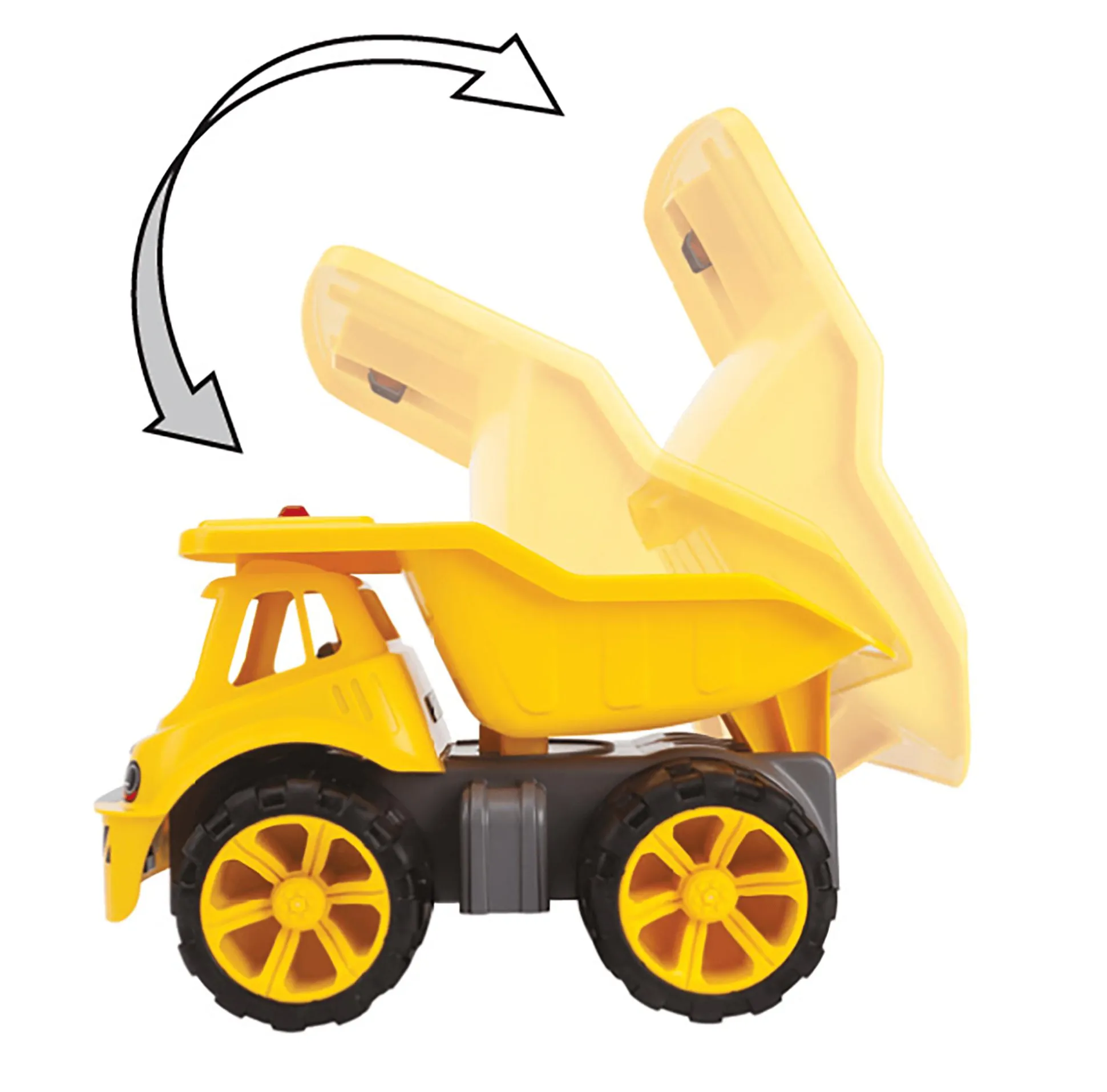 Die große Ladefläche des robusten Trucks ist kippbar, fasst bis zu 4,2 Liter und ist bis 25 kg belastbar. Durch eine Verriegelung an deren Oberseite wird verhindert, dass die Mulde beim Fahren nach hinten klappt und die kostbare Ladung verloren geht.