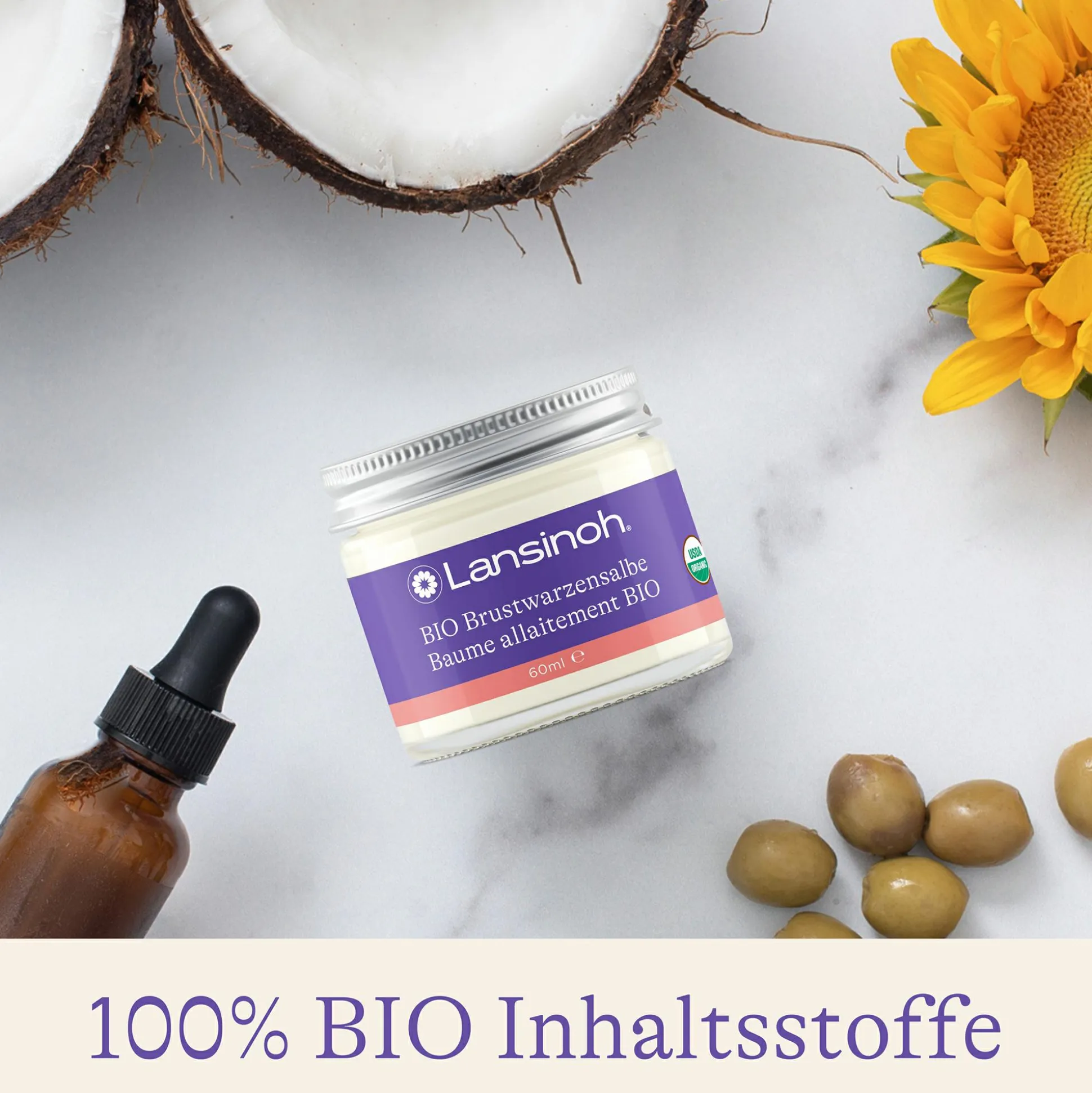 Für die natürliche Pflege empfindlicher Brustwarzen und trockener oder gespannter Haut ist die BIO Brustwarzensalbe von Lansinoh die ideale Lösung. Die rein biologischen USDA Organic-zertifizierten Inhaltsstoffe pflegen deine Haut sanft, aber effektiv. So spendet Sonnenblumenöl Feuchtigkeit, während Kokosnussöl kühlend und entzündungshemmend wirkt und Ringelblumenöl die Regeneration der Haut unterstützt, um nur ein paar der vielen Vorteile der Inhaltsstoffe zu nennen.