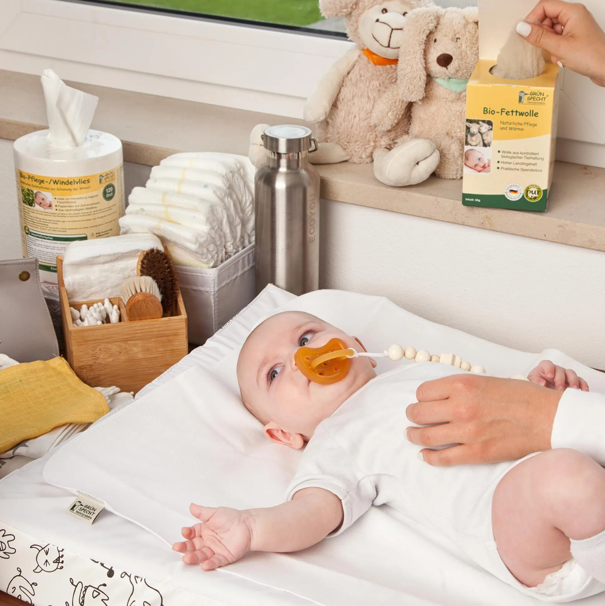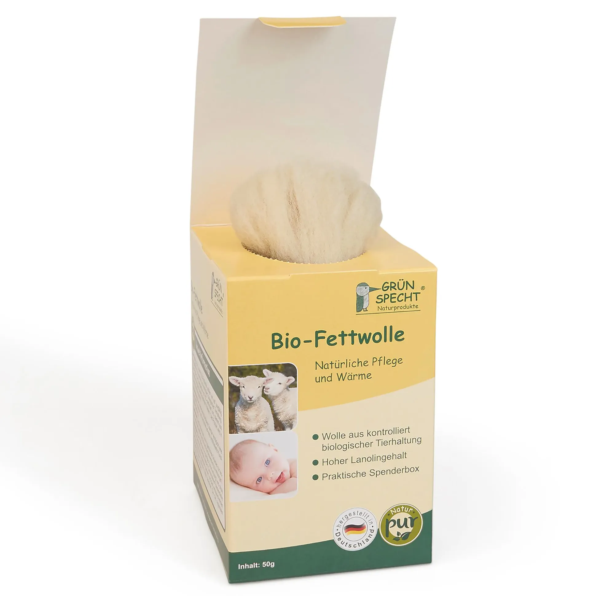 Fettwolle, im Volksmund auch „Rohwolle“ genannt, dient der natürlichen Pflege und Wärme. Bei der Bio-Fettwolle von Grünspecht Naturprodukte handelt es sich um sorgfältig ausgewählte Schurwolle aus kontrolliert biologischer Tierhaltung. Die Wolle besitzt eine hautpflegende und wärmende Wirkung. Sie pflegt beanspruchte Brustwarzen sowie empfindliche Babypopos und Hautpartien. Die benötigte Menge an Wolle einfach aus der praktischen Spenderbox entnehmen und die betroffene Stelle mit einer dünnen Schicht bedecken. Das Produkt darf nur einmal verwendet werden und ist nach der Anwendung in der Bio-Tonne zu entsorgen. Weiterer Vorteil: Der Spender ermöglicht eine sparsame Entnahme der Wolle und ist wiederverschließbar.