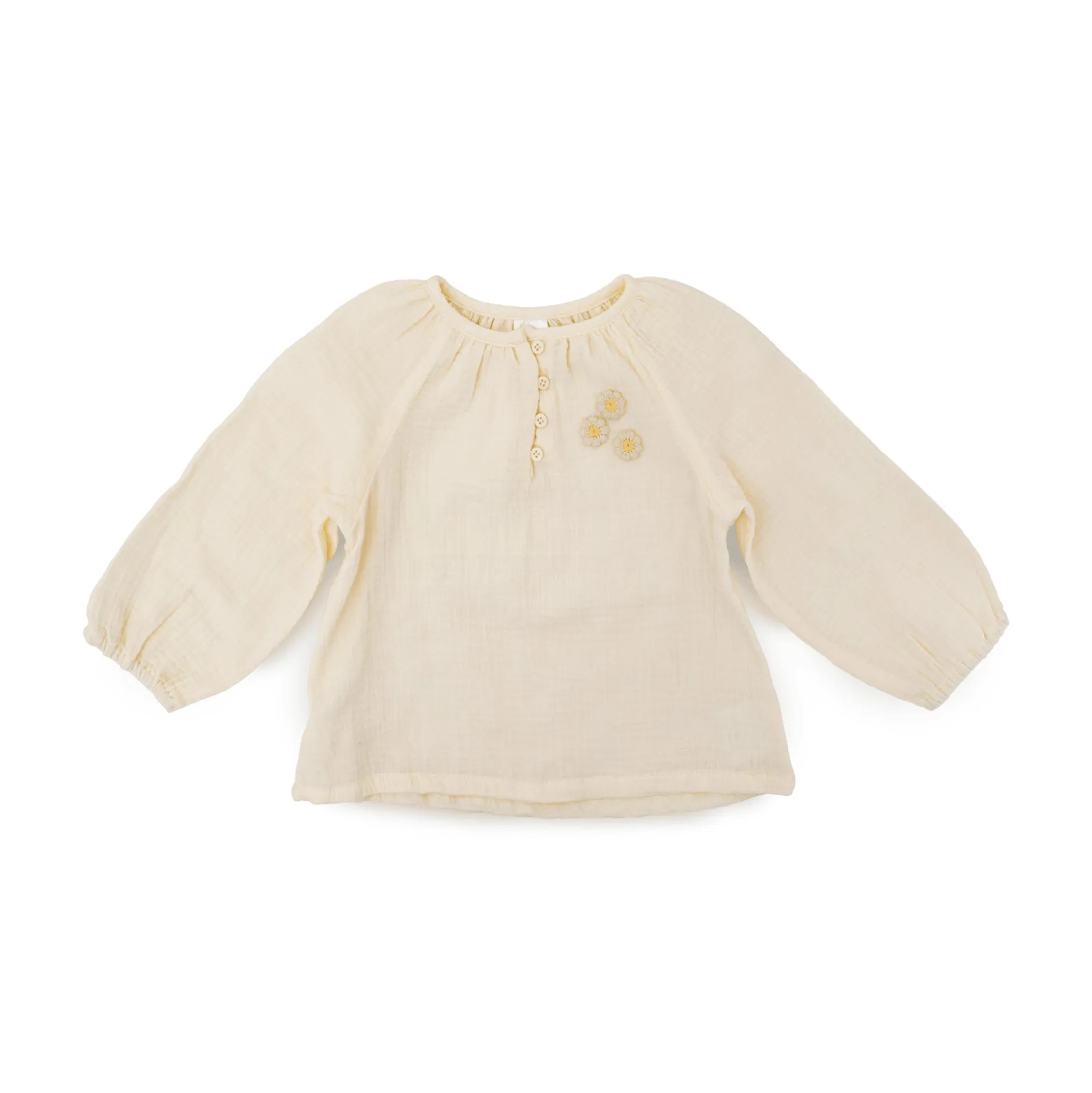 Die Bluse von LITTLE ONE verzaubert mit ihrem luftig-leichten Musselin-Stoff und der liebevollen Stickerei aus kleinen Blümchen auf der Brust. Die weiten Raglanärmel und die Knopfleiste am Halsausschnitt sorgen für einen charmanten Look und ein unkompliziertes Anziehen. Hergestellt aus 100% Baumwolle ist sie angenehm weich zur Haut – ideal für die wärmeren Tage.