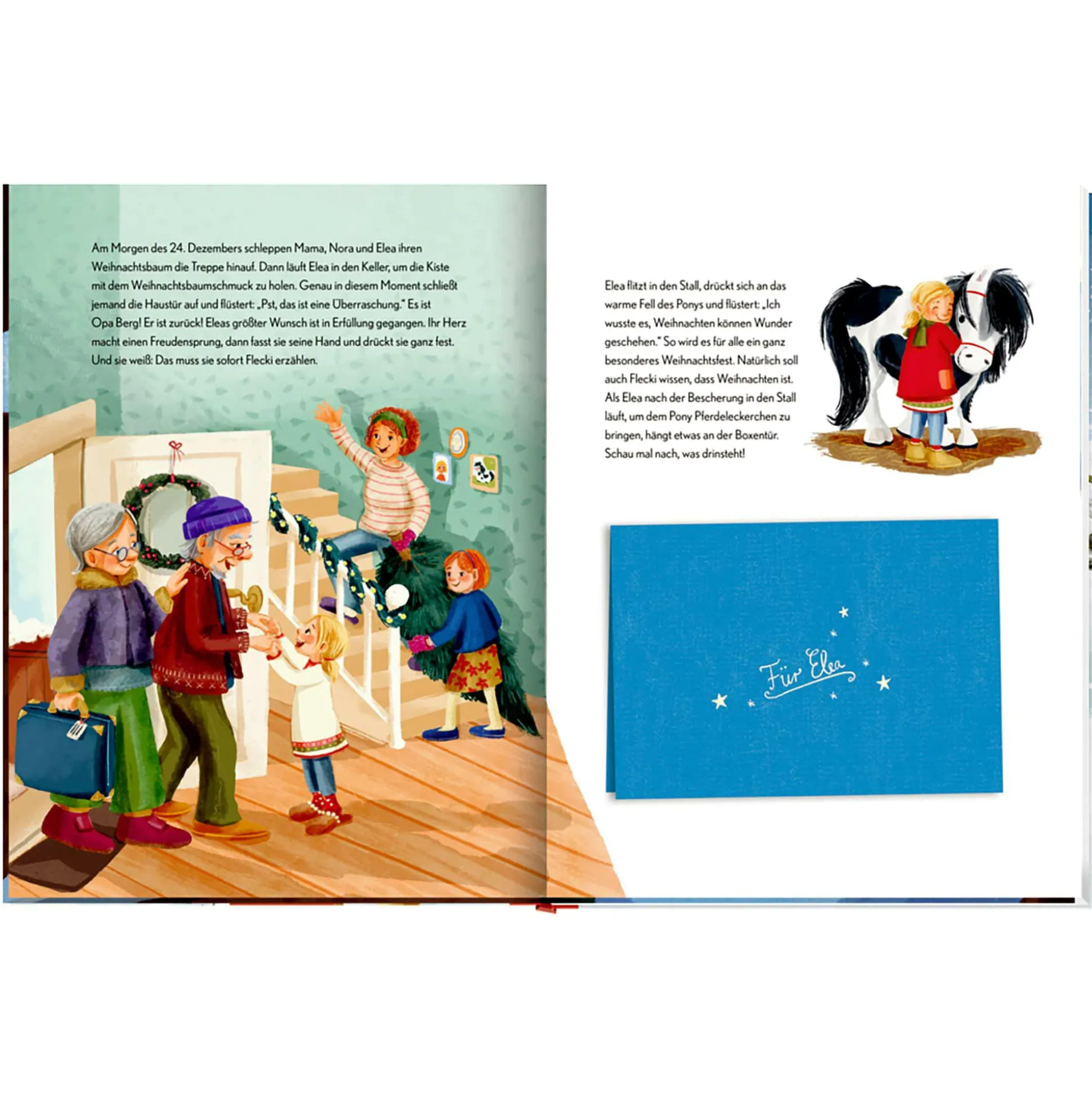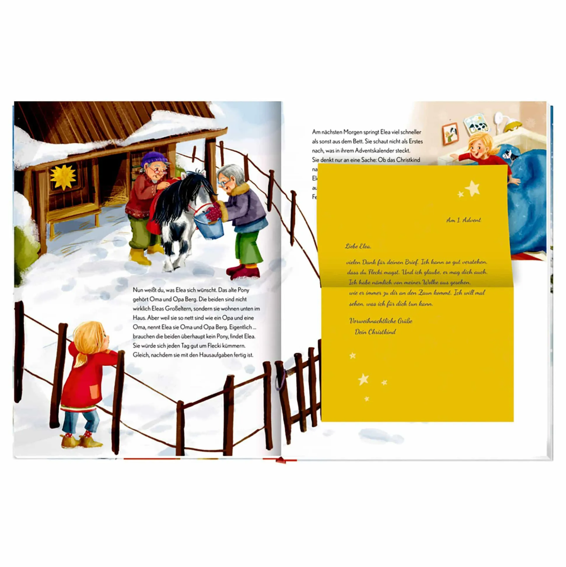 Stell dir vor, du schreibst dem Christkind und es antwortet … Als Elea ihren Wunschzettel auf die Fensterbank legt, rechnet sie nicht damit, dass sie Post zurückbekommt. „Ich will mal sehen, was ich für dich tun kann“, schreibt das Christkind. Jetzt kann Elea es kaum noch erwarten, dass endlich Weihnachten ist. Denn ihr einziger Wunsch ist Flecki, das Pony, das ihren Nachbarn Oma und Opa Berg gehört. Doch dann bekommt Opa Berg einen Herzanfall und plötzlich sind Elea ganz andere Dinge wichtig …