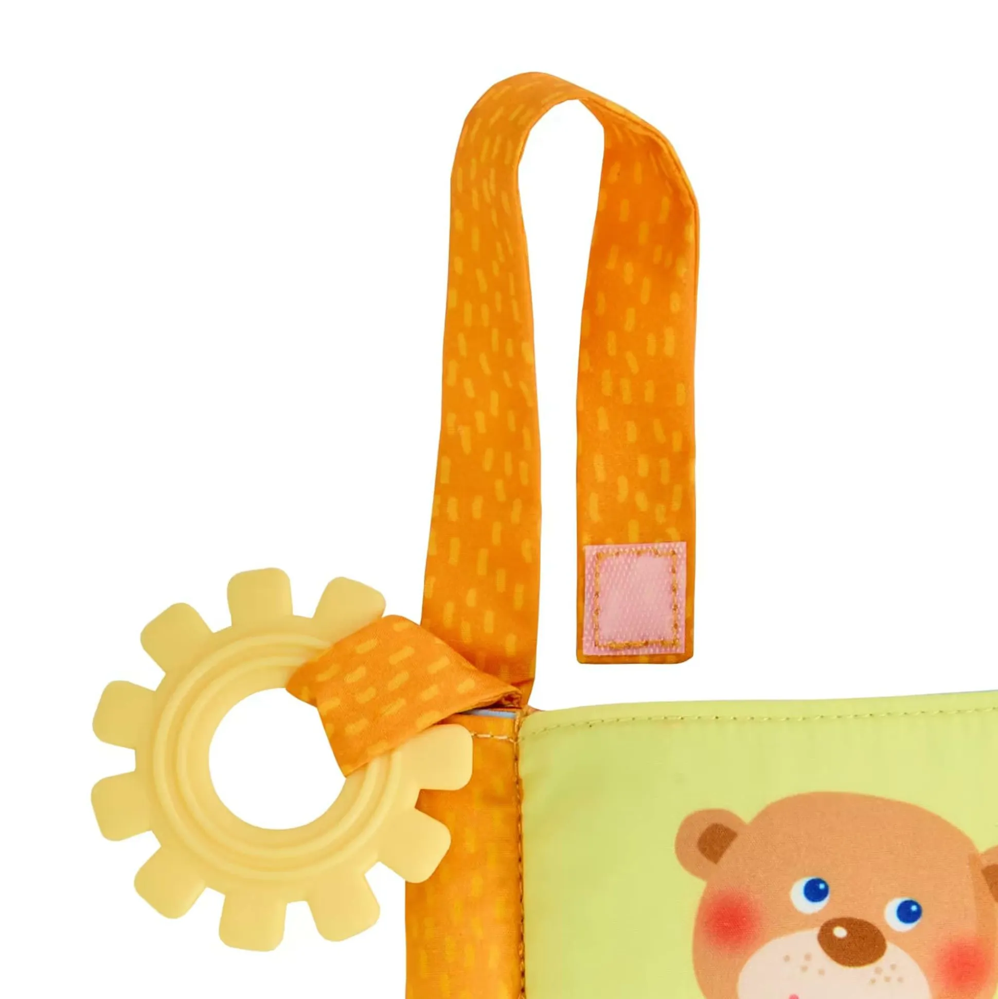 Die greifbare Klettschlaufe ermöglicht es, das Buch sicher am Buggy oder Kinderwagen zu befestigen, sodass es immer griffbereit ist und nicht verloren geht. Ein zusätzliches Highlight ist der angenähte Beißring, der kleinen Entdeckern beim Zahnen wohltuende Linderung verschafft
