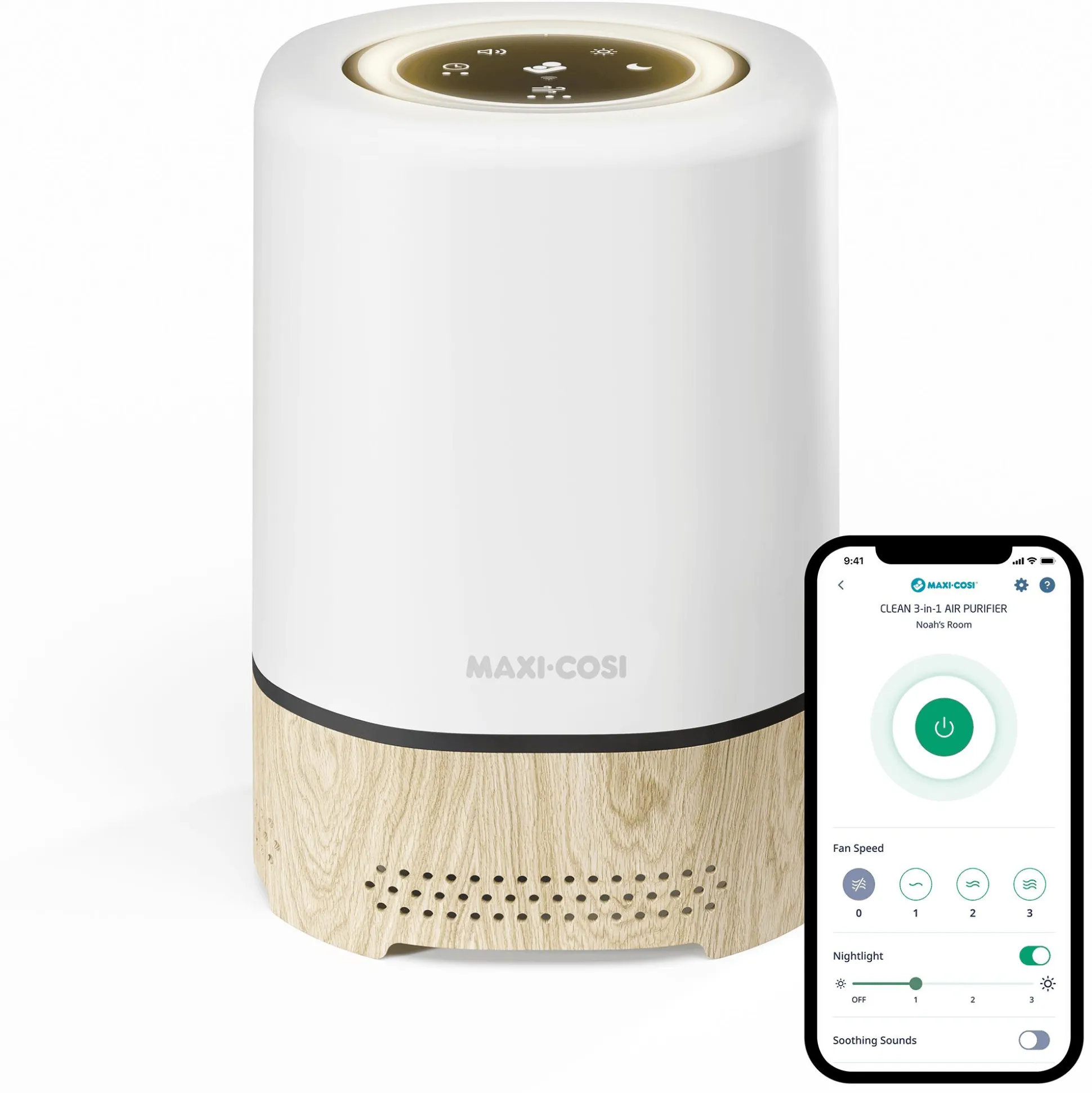 Der Clean 3-in-1-Luftreiniger sorgt dafür, dass dein kleiner Schatz Tag und Nacht saubere Luft einatmet. Dank der leistungsstarken HEPA-13-Filterung entfernt der Maxi-Cosi Clean 99,97 % die Staub-, Pollen- und Schwebstoffpartikel aus der Luft. Das einstellbare Nachtlicht und die 4 beruhigenden Melodien, die der Clean abspielt, sorgen vor dem Schlafengehen für eine beruhigende Atmosphäre im Kinderzimmer. Alle drei Funktionen lassen sich über die Maxi-Cosi Connected Home App von überall aus steuern.