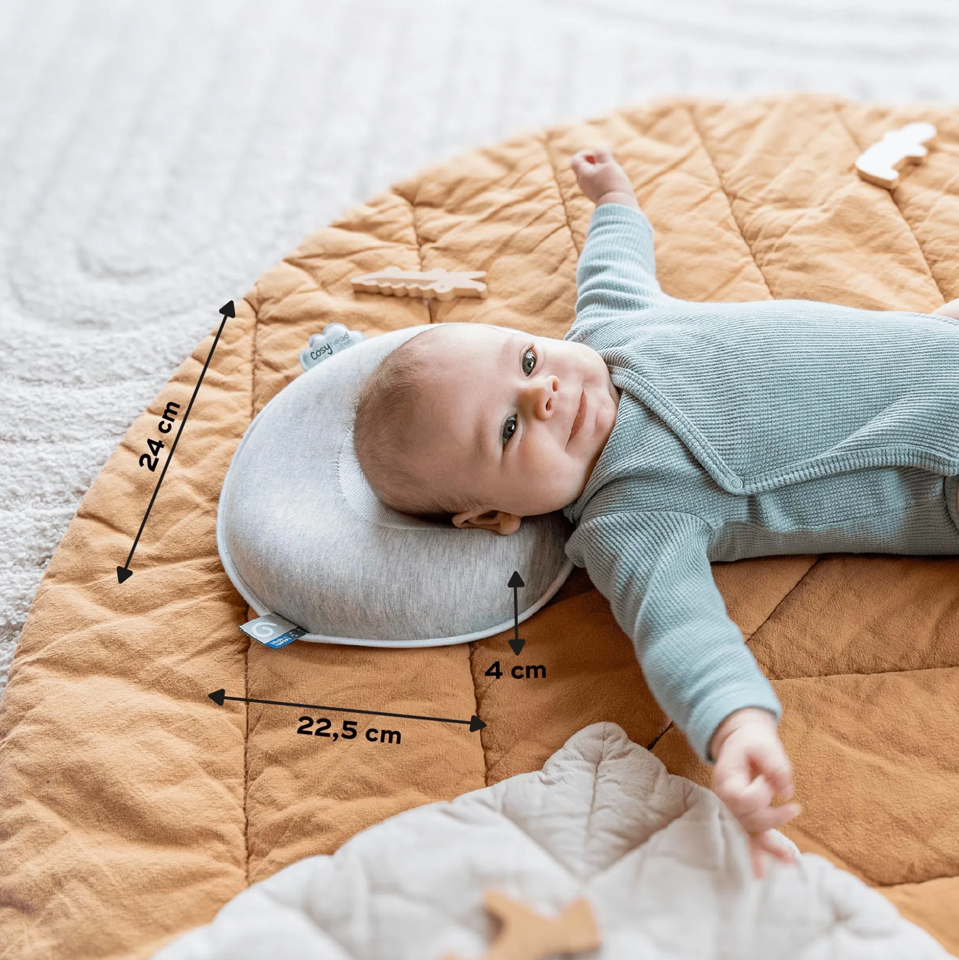 Der Cosyhead Smokey wächst sogar mit deinem Baby mit! Das breite, weiche Kopfkissen passt sich der natürlichen Entwicklung deines Kindes an und sorgt für langfristigen Komfort. Ein rutschfester Rücken bietet zusätzlichen Halt, damit das Kissen immer sicher an Ort und Stelle bleibt – sei es im Babybett, der Wippe oder unterwegs im Autositz.