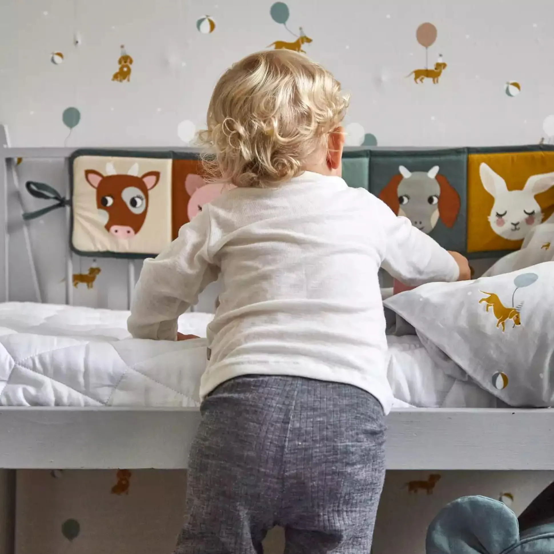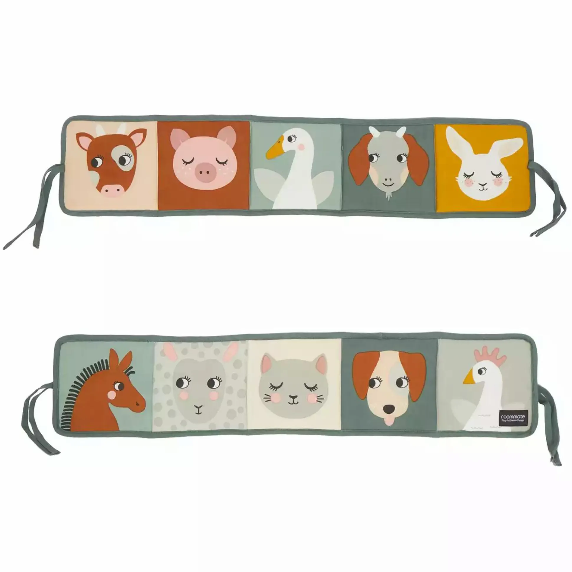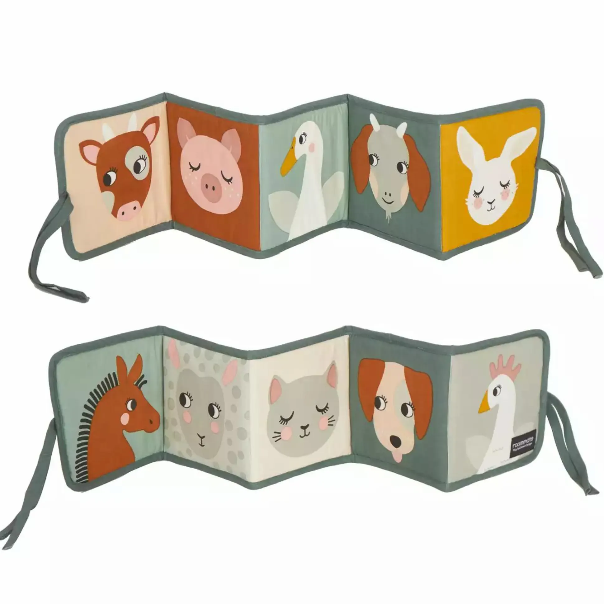 Dieses süße Stoffbuch von Roommate lädt dein Kind zum Entdecken, Greifen & Spielen ein. Auf jeder Seite dieses Buchs ist ein anderes Tier abgebildet.