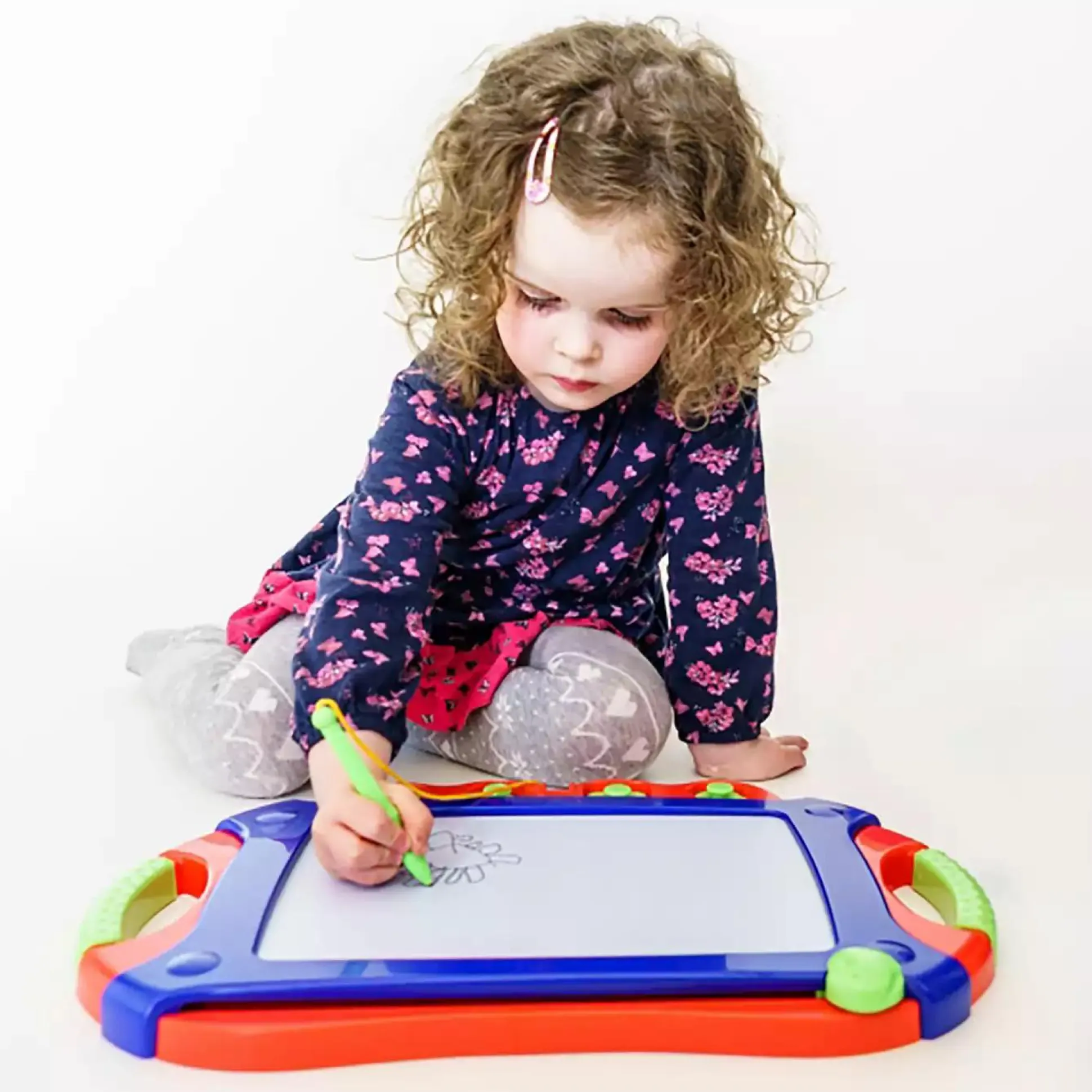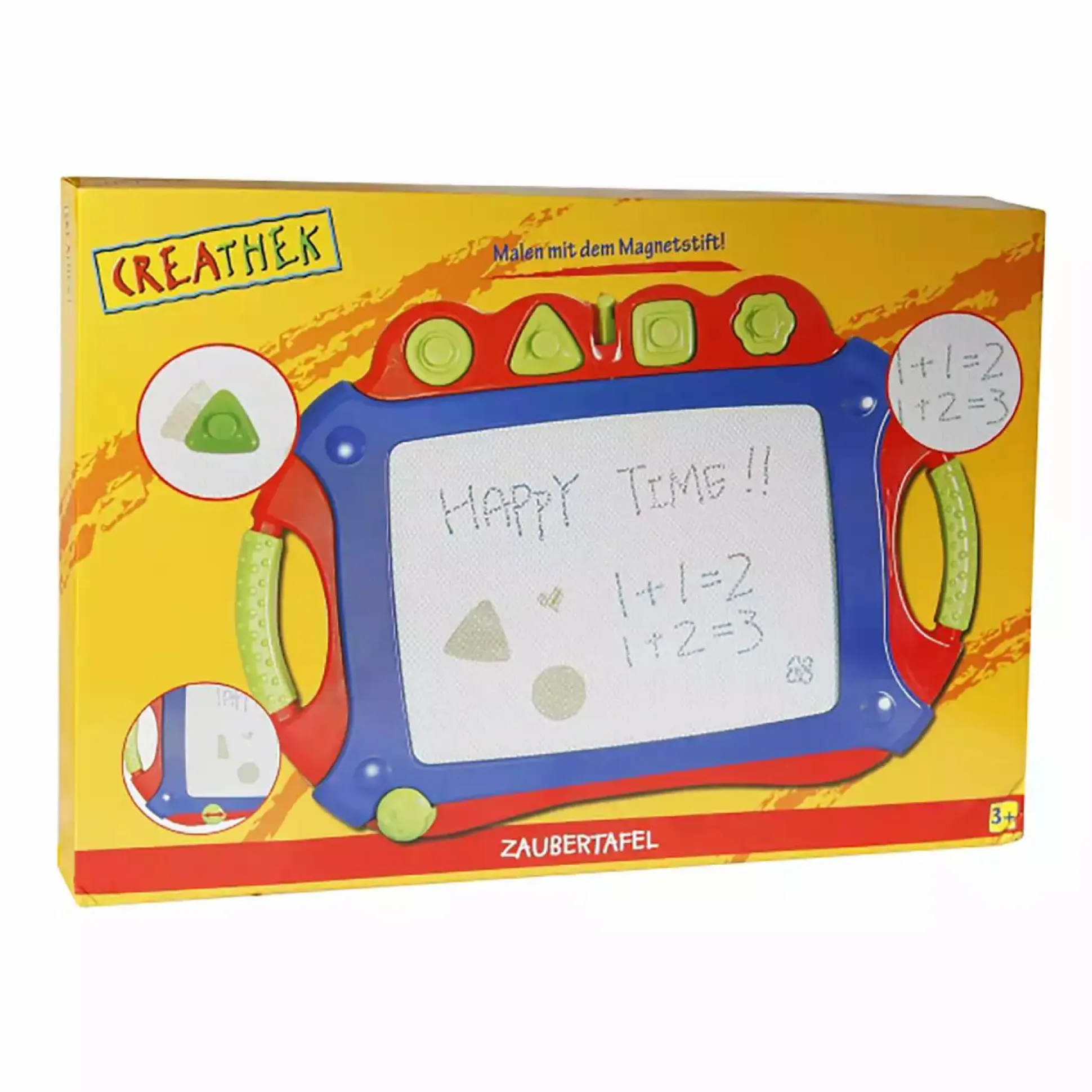 Wie von Zauberhand verschwindet das Gemalte und Geschriebene auf der Creathek Magnet Maltafel. Der magische Schieber macht den Hintergrund wieder weiß und das nächste Kunstwerk kann entstehen. Im Set enthalten sind vier Stempel und ein Magnetstift. Die Creathek Magnet Maltafel kommt ganz ohne Papier aus und ist der fleckenfreie Spaß für junge Künstler.