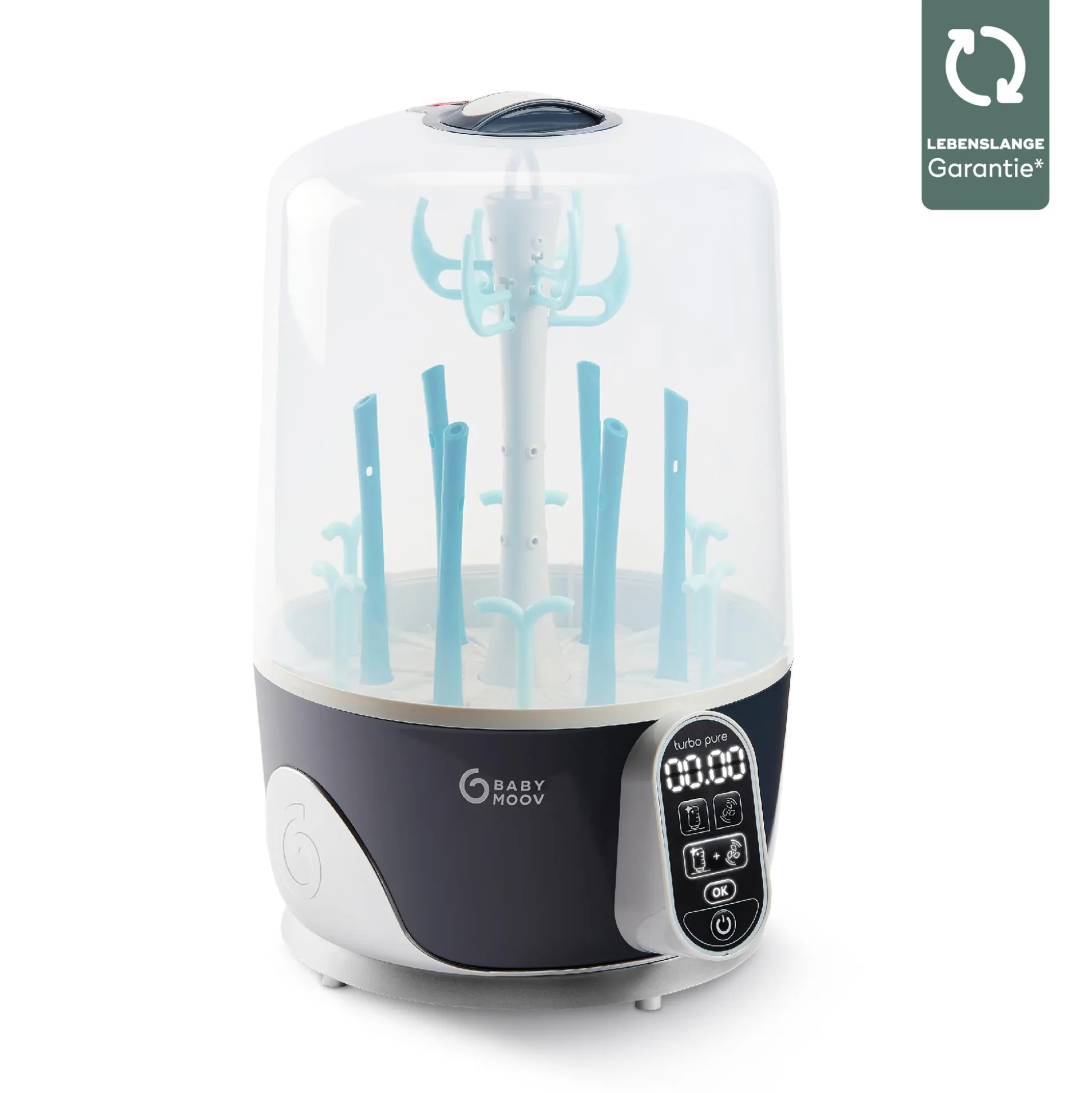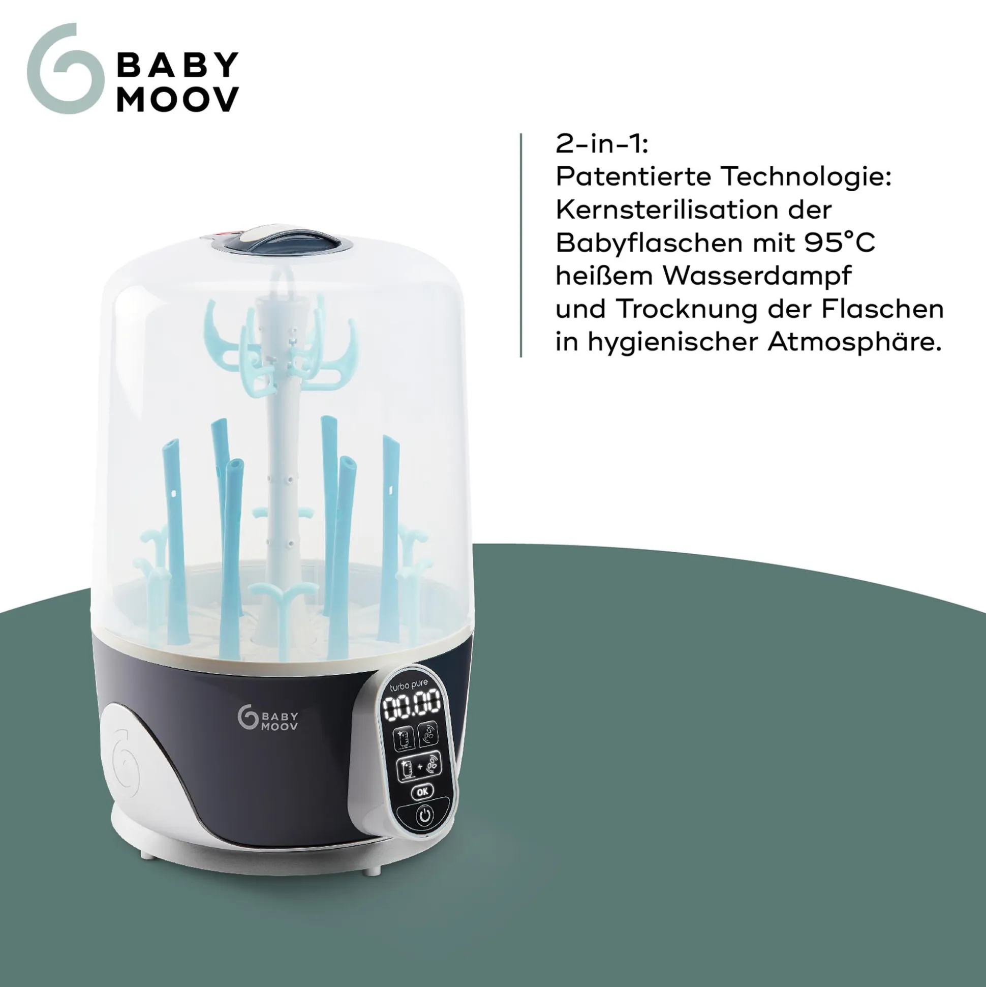 - patentierte Technologie: Kernsterilisation der Babyflaschen über Dampfdüsen im Inneren mit 95°C heißem Wasserdampf in 8 Minuten