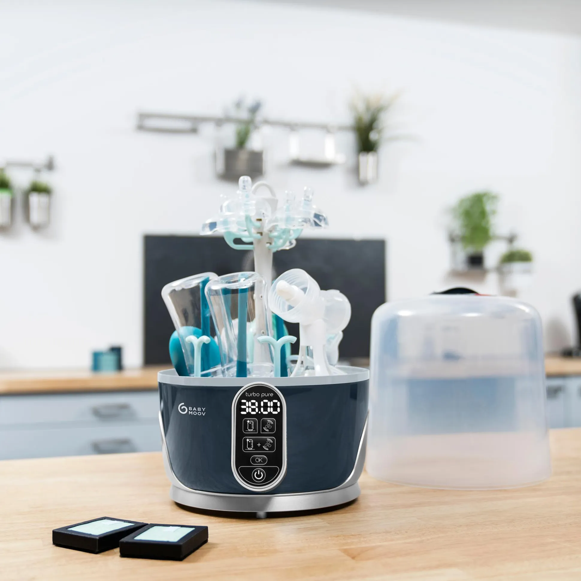 - Trocknung der Babyflaschen in hygienischer Atmosphäre dank HEPA12-Filter, der 99% der Luftschadstoffe herausfiltert