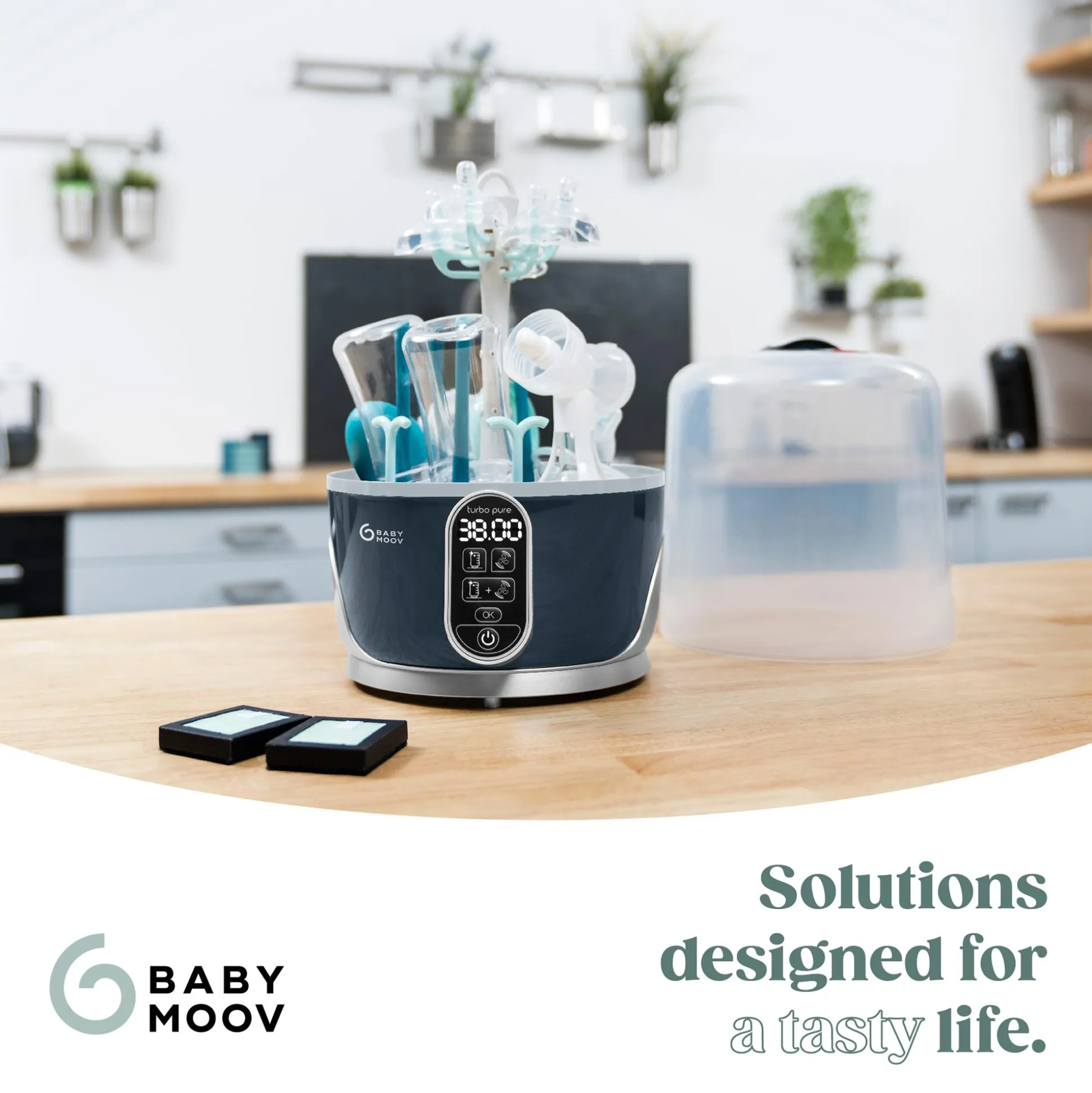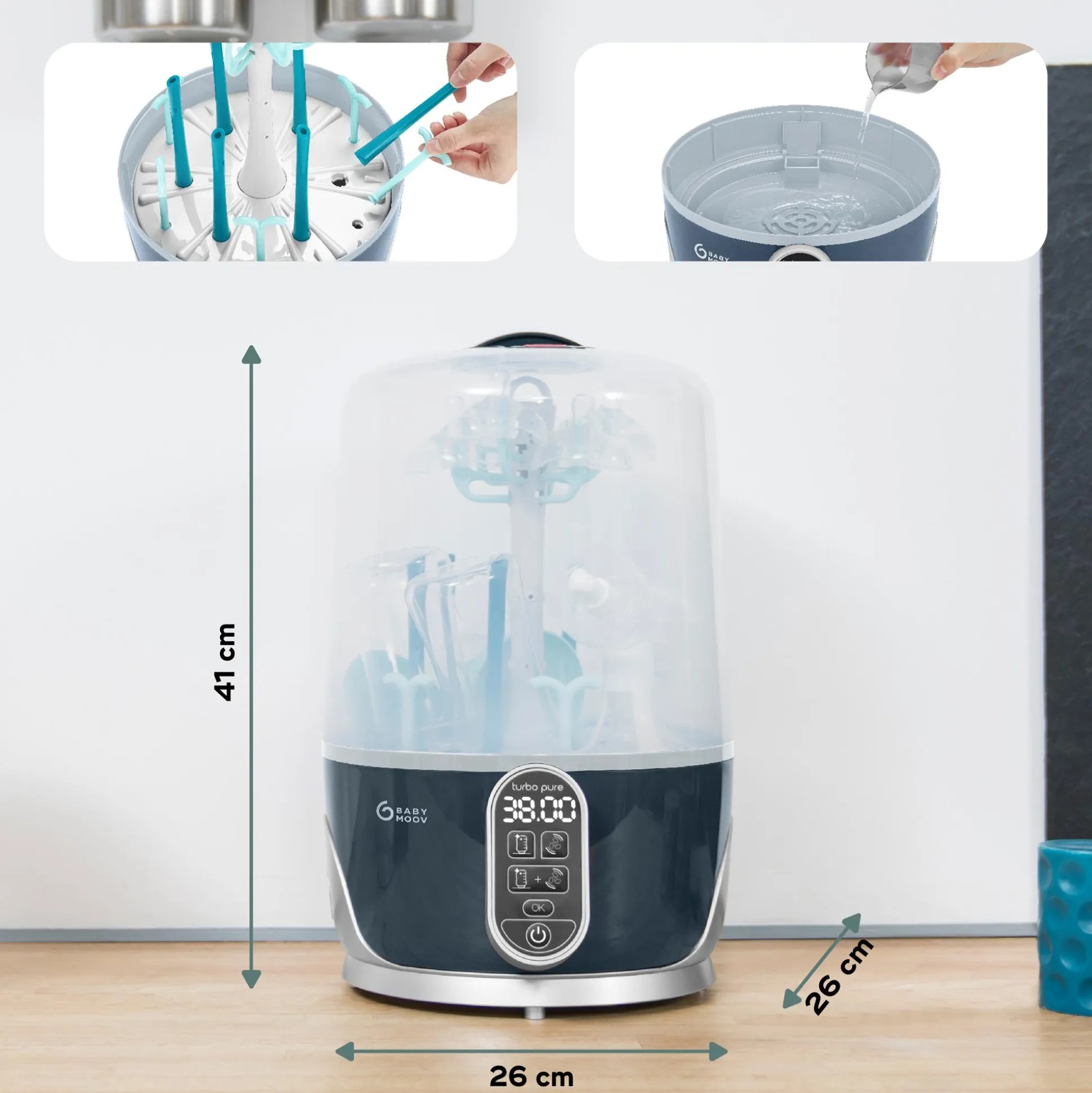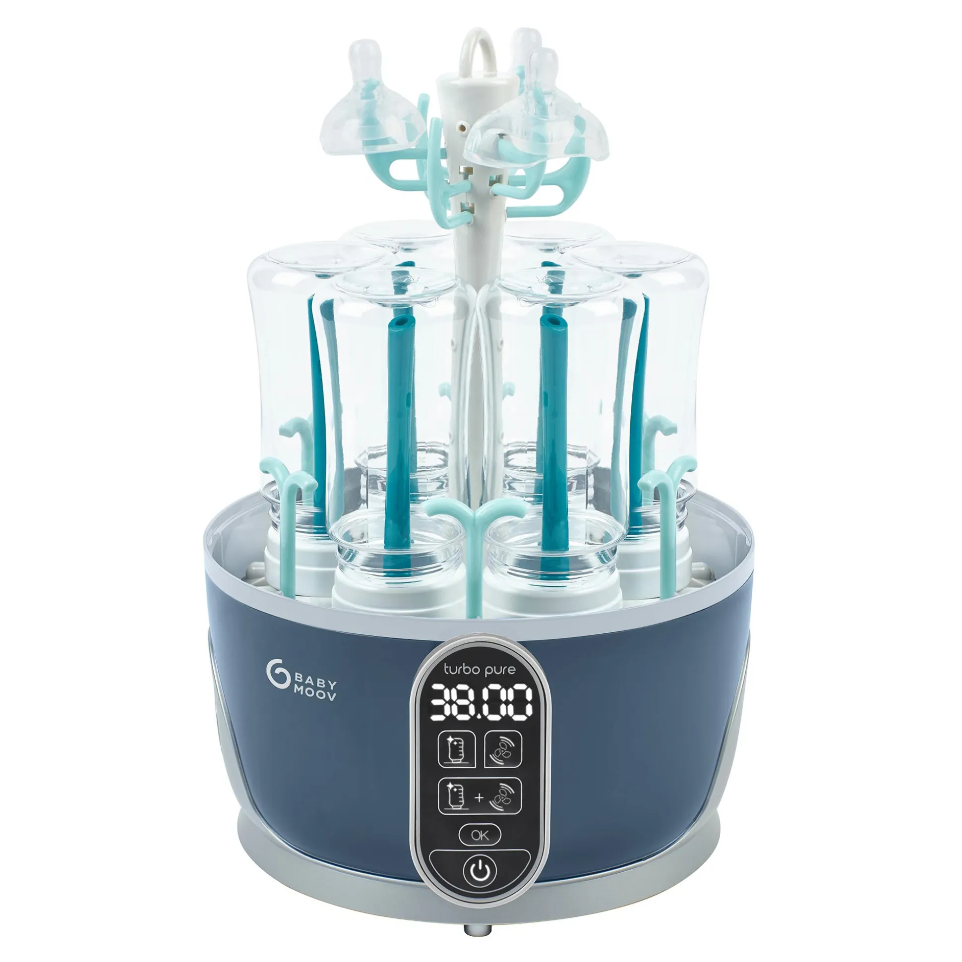 Der Babymoov Dampfsterilisator & Flaschentrockner Turbo Pure ist die All-in-One Lösung zur Sterilisation und hygienischen Trocknung von bis zu 6 Babyflaschen und Zubehör wie Sauger, Schnuller und Milchpumpen.