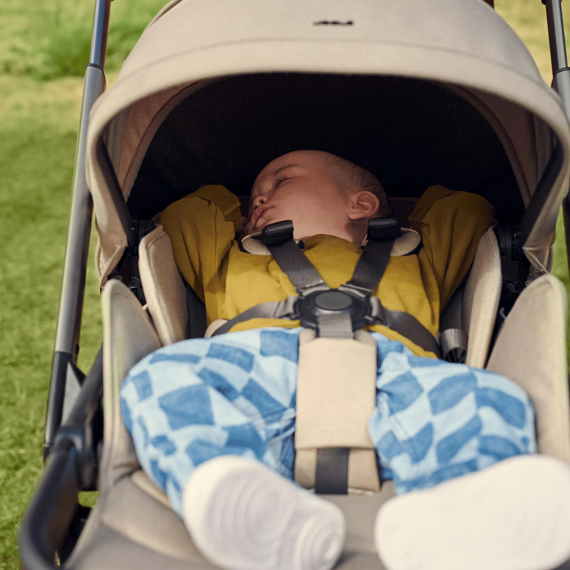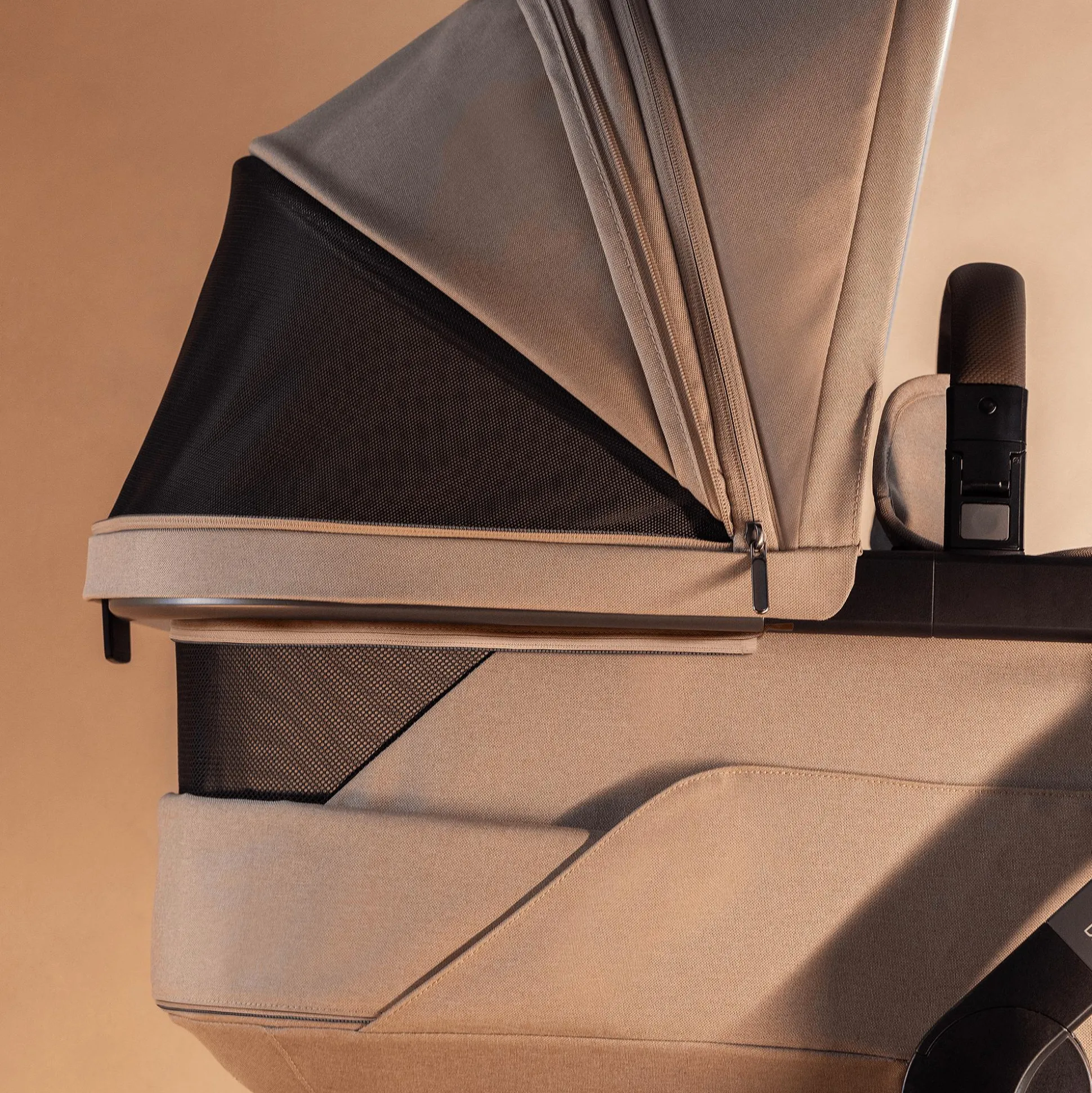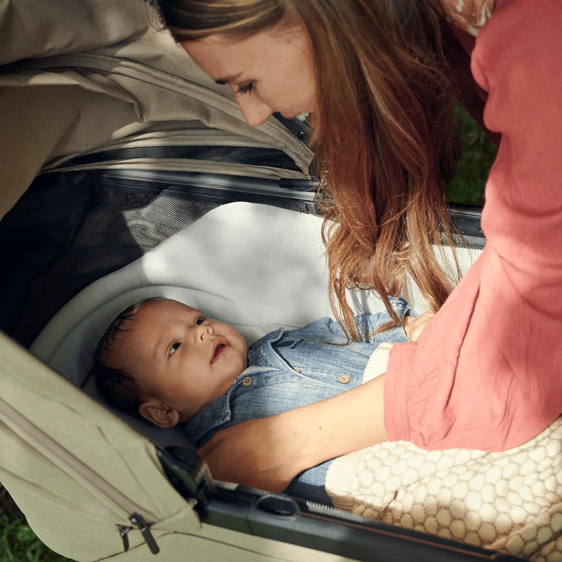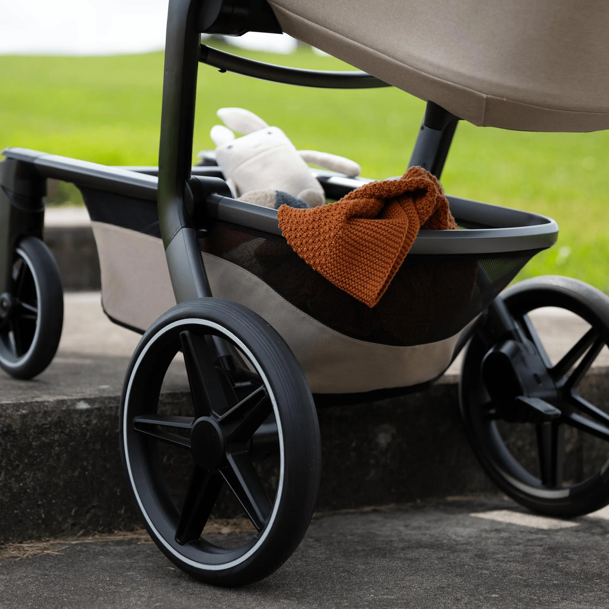 Perfekt wird der Komfort durch das hochwertige Gestell: Während die pannensicheren Räder mit Allradfederung eine angenehme Laufruhe auf jedem Untergrund bieten, sorgt der höhenverstellbare, einhändig lenkbare Schieber für ein rückenfreundliches Schieben. Außerdem eignet sich der Rahmen auch zur Befestigung der Autokindersitz-Babyschale: So musst du dein Baby am Zielort nicht stören, wenn es beim Autofahren eingeschlummert ist.