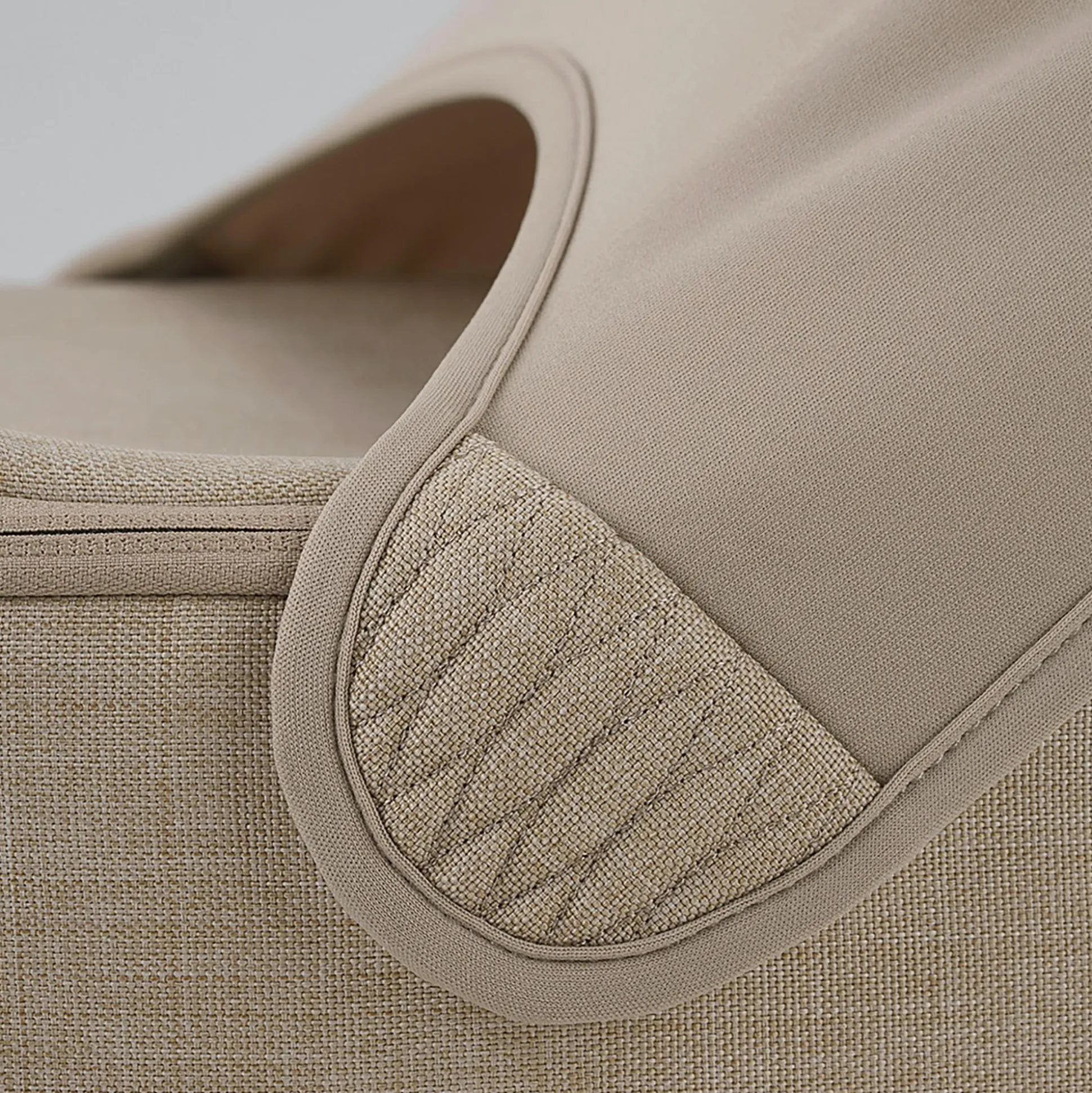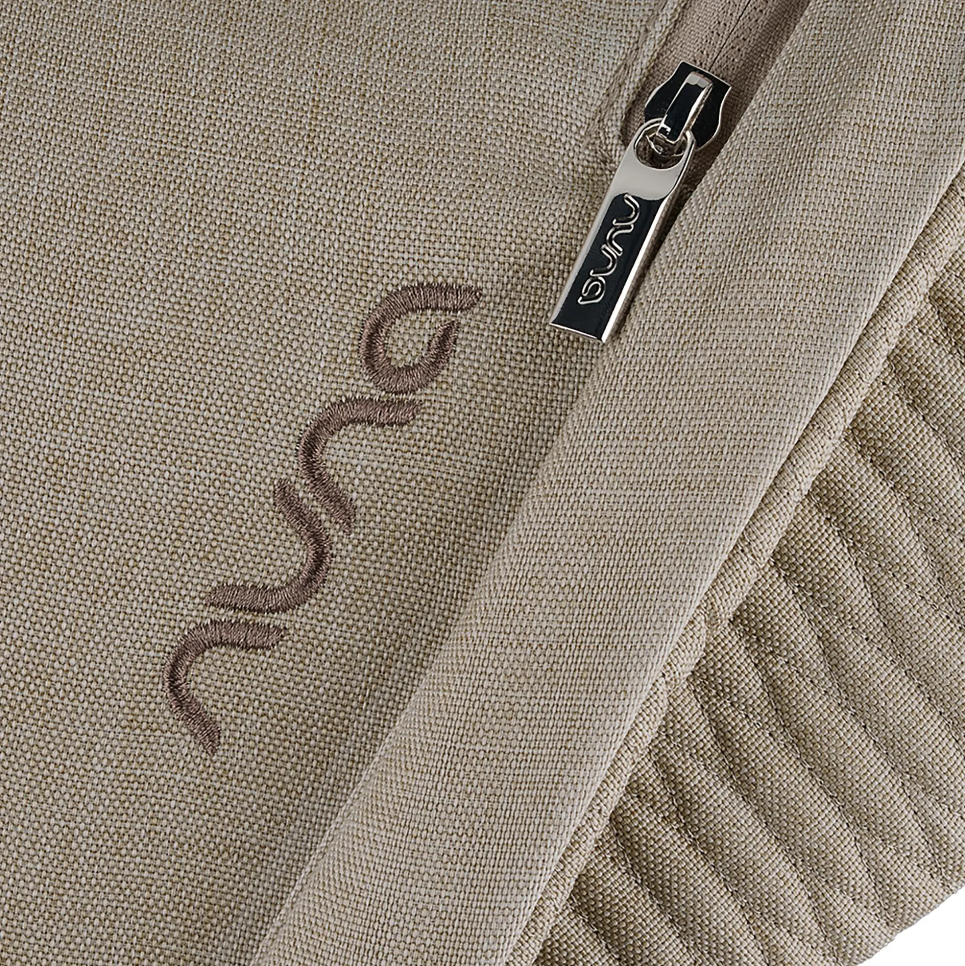 Ein ruhig-eleganter Leinenton trifft auf fein gesteppte Details, Stickereien in warmem Mocha Braun, edle Besätze und hochwertige Leatherette-Akzente.