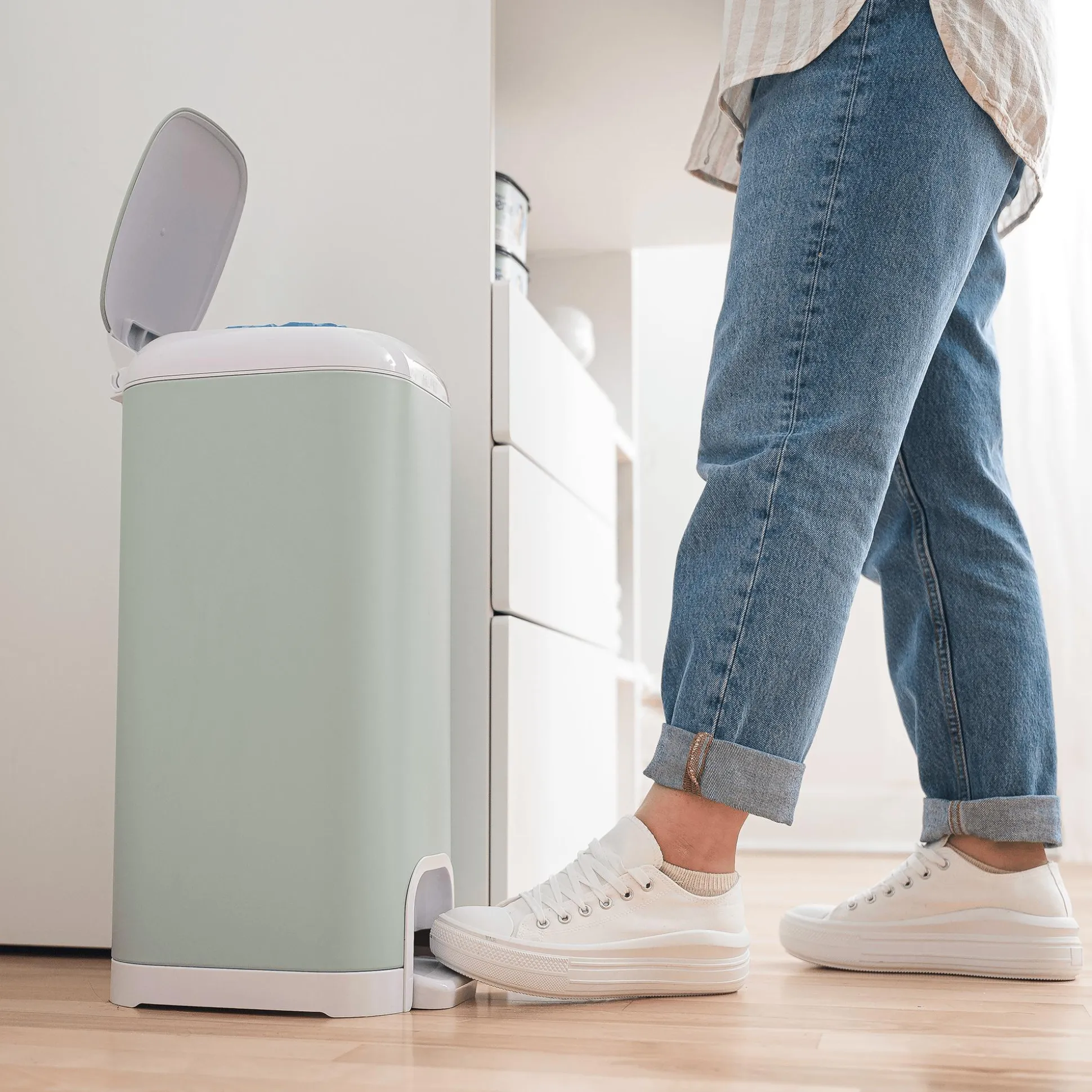 Der neue Diaper Genie Select Windeleimer ist eine elegante Ergänzung für das Kinderzimmer deines kleinen Lieblings, bei der sowohl Stil als auch Langlebigkeit im Vordergrund stehen. Der neue Diaper Genie Select Eimer ist aus hochwertigem Edelstahl gefertigt und verfügt über eine Klappe, die den Geruch verschmutzter Windeln wirksam eindämmt. Eine breite Entsorgungsöffnung sowie ein Fußpedal für eine einfache Einhandbedienung sorgen für zusätzlichen Komfort. Der Windeleimer kann bis zu 40 Windeln für Neugeborene aufnehmen und wird mit einer XL Nachfüllkassette geliefert, die mit einer mehrschichtigen Folie mit Geruchsbarriere ausgestattet ist. Die XL Nachfüllkassette kann bis zu 810 Windeln für Neugeborene sicher aufnehmen und bietet so eine enorme Reichweite.
