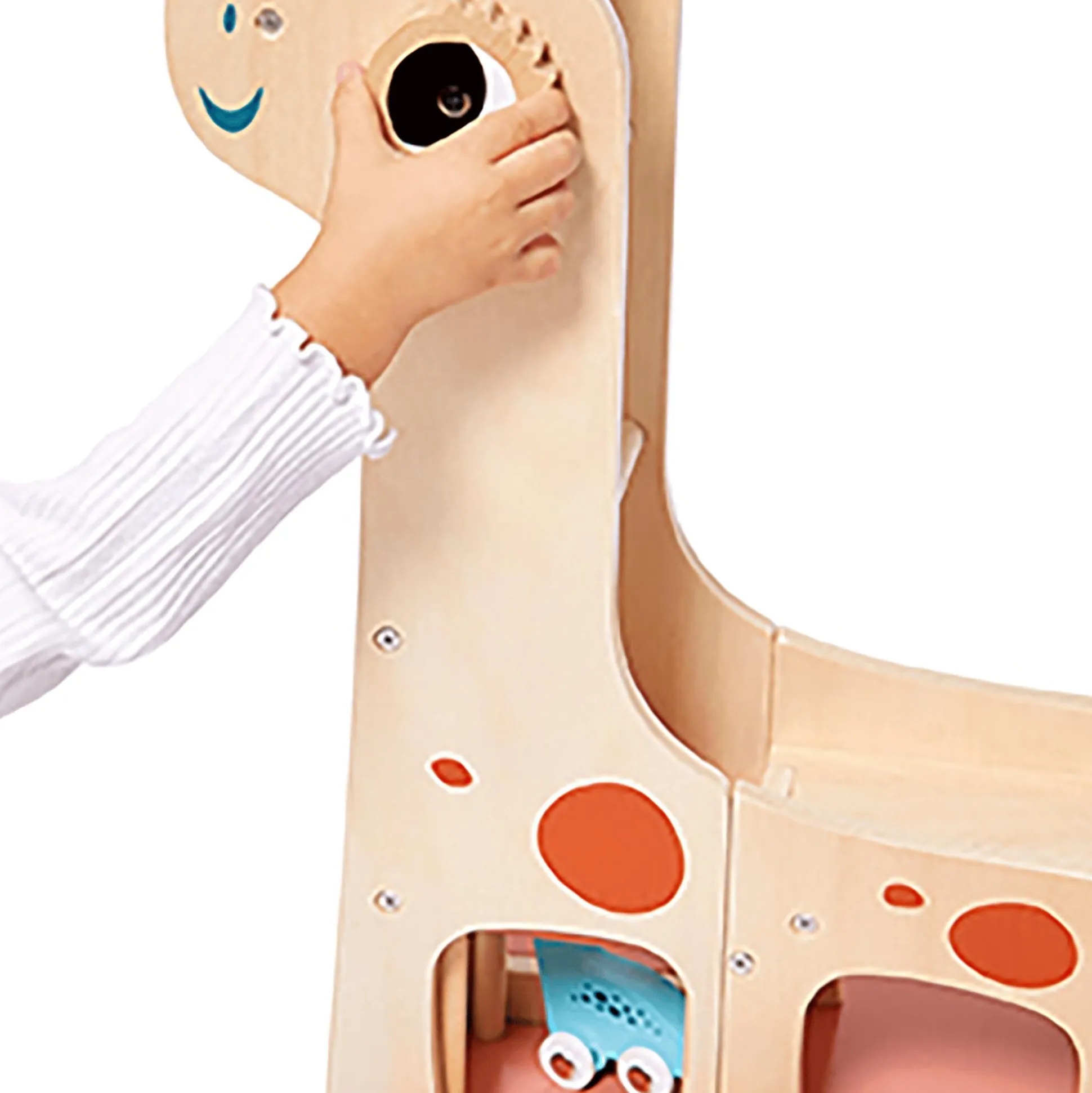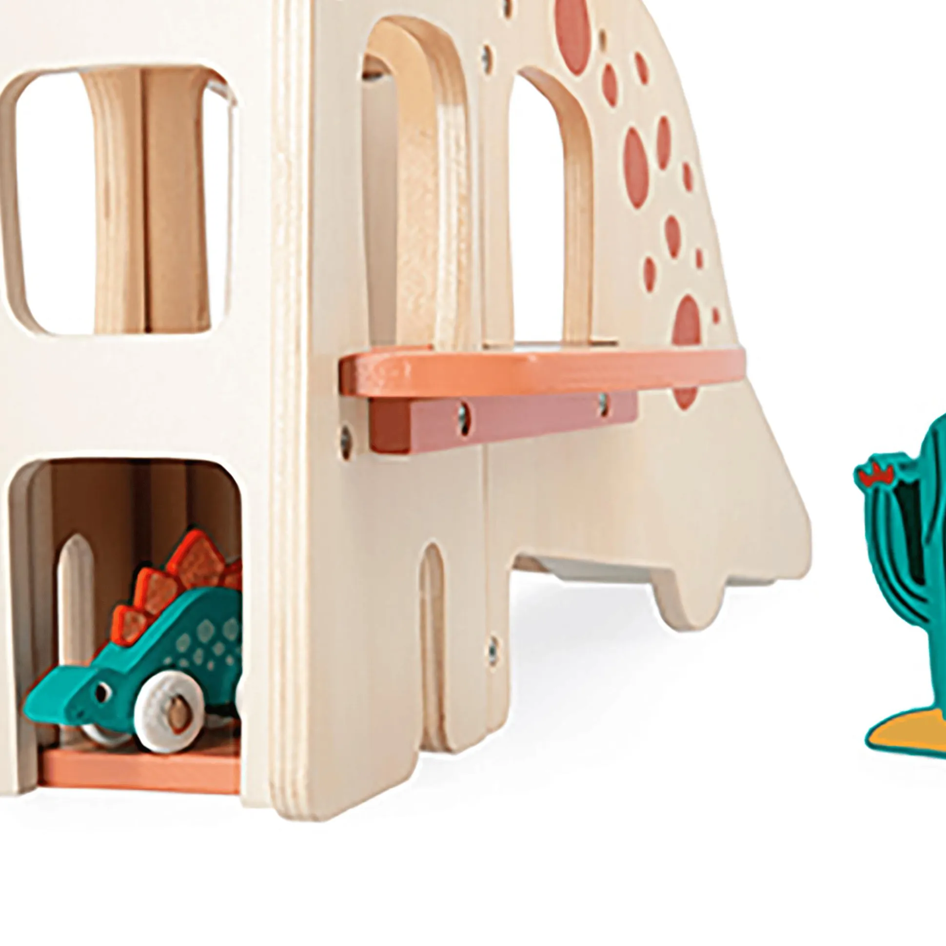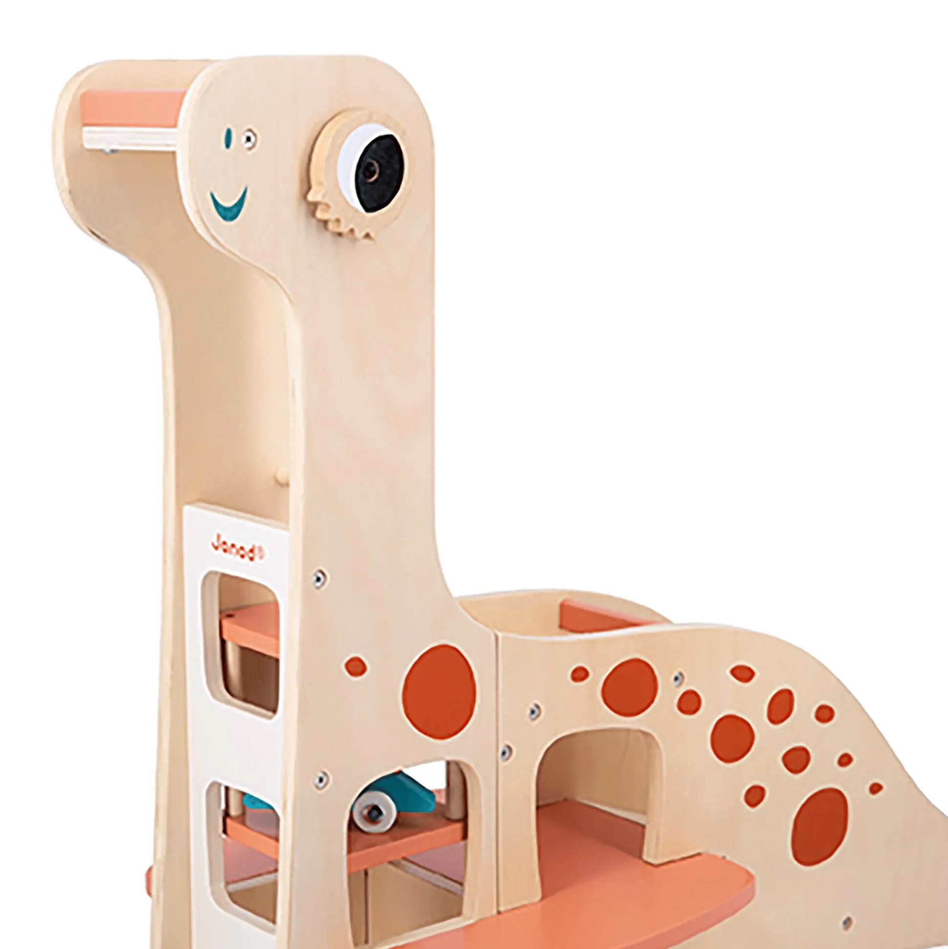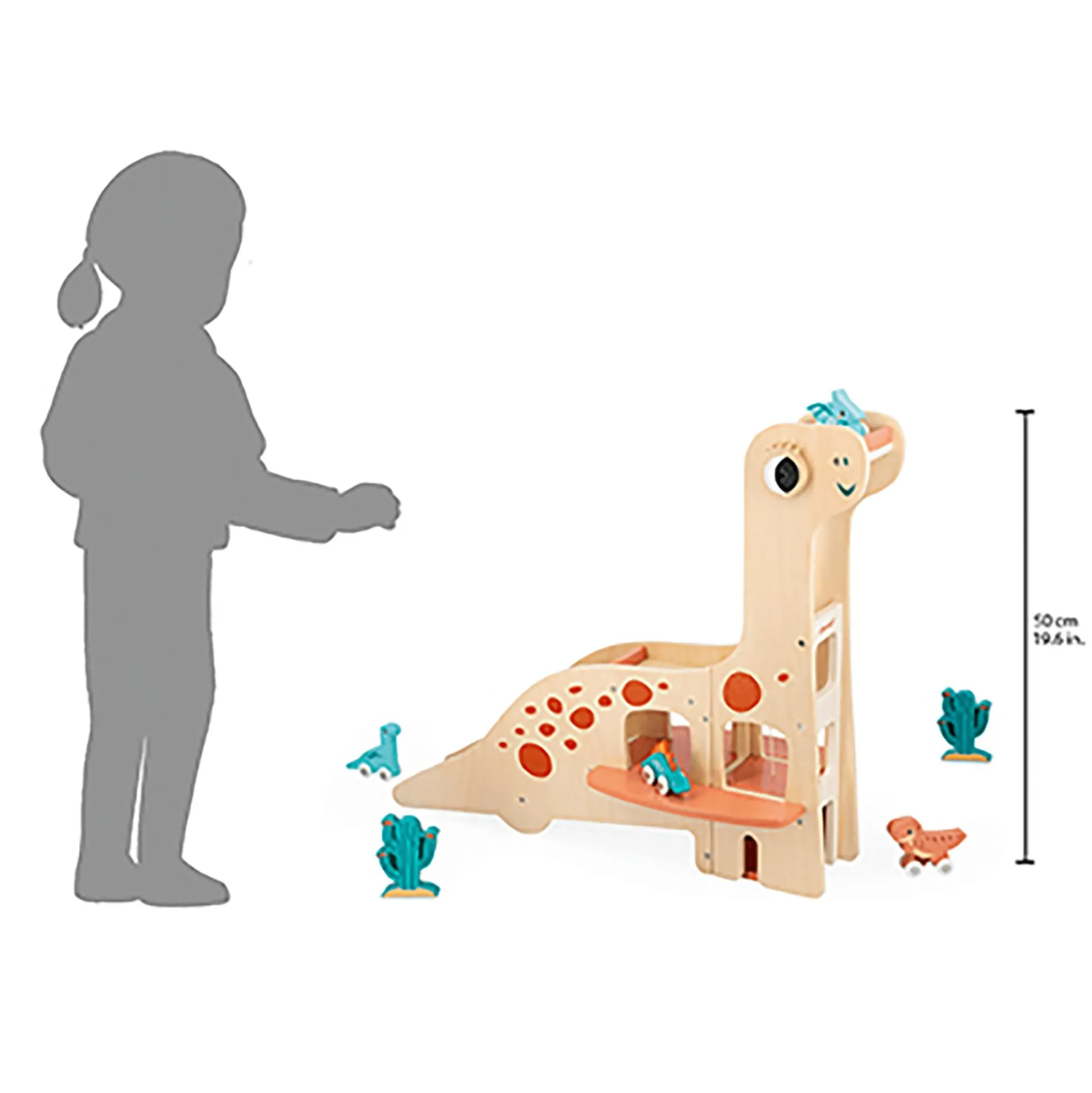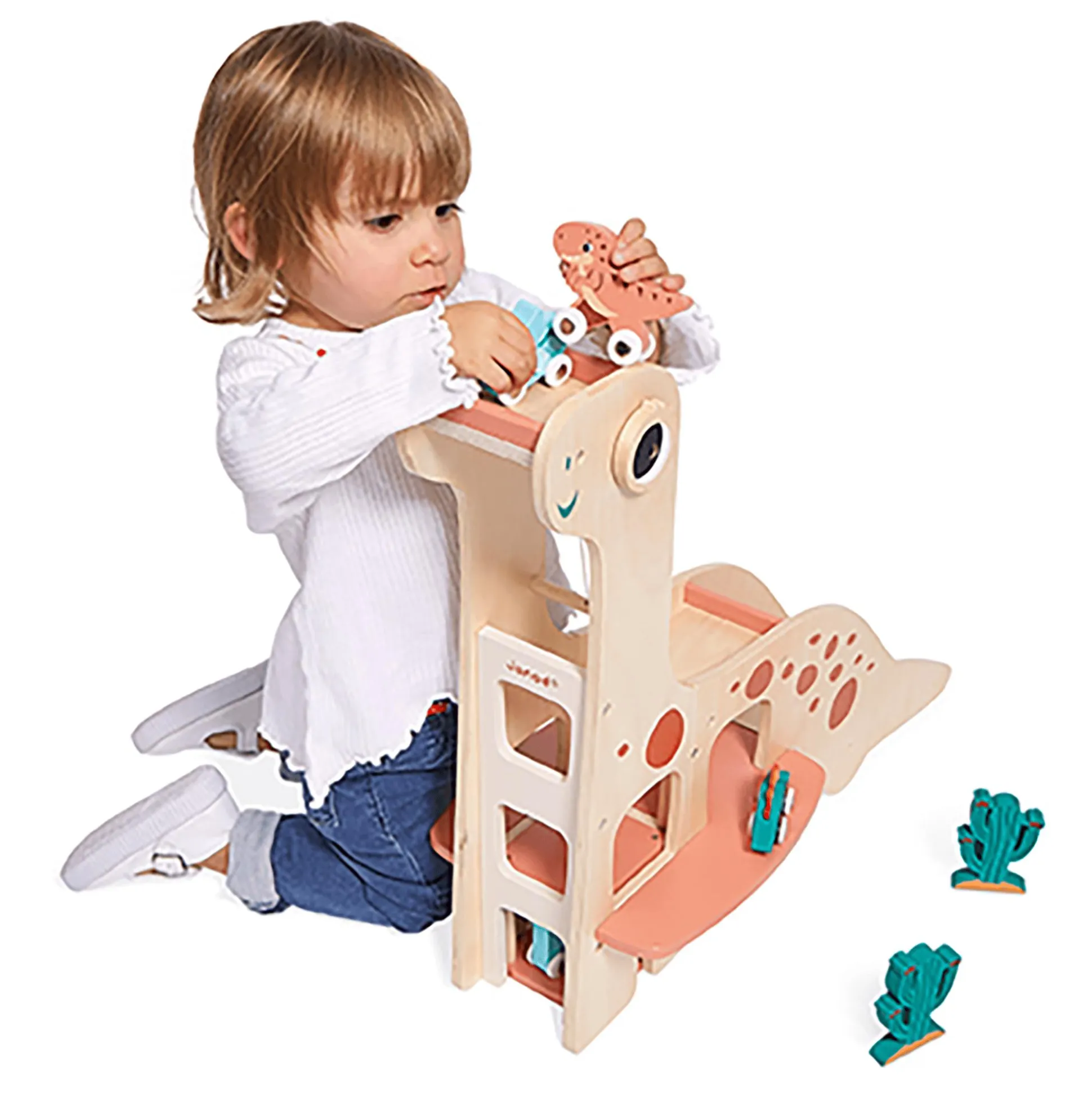 Diese tolle Dino-Garage aus Holz von Janod ist perfekt für kleine Dinosaurier-Fans! Dein Nachwuchs kann mit den vier Dinosauriern auf Rollen spielen – doch wenn Schlafenszeit ist, müssen sie wieder in die große Dino-Garage. Ein Aufzug führt direkt auf das erste und zweite Parkdeck. Dank einer Rampe auf dem Rücken des Dinos kann dein kleiner Schatz die fahrendes Echsen auch blitzschnell wieder aus der Garage flitzen lassen. Außerdem gehören noch zwei Kakteen aus Holz zum Lieferumfang, sodass die Spielfläche zusätzlich verschönert werden kann. Die Dino-Garage fördert so nicht nur die Feinmotorik, sondern auch die Fantasie deines Schützlings.