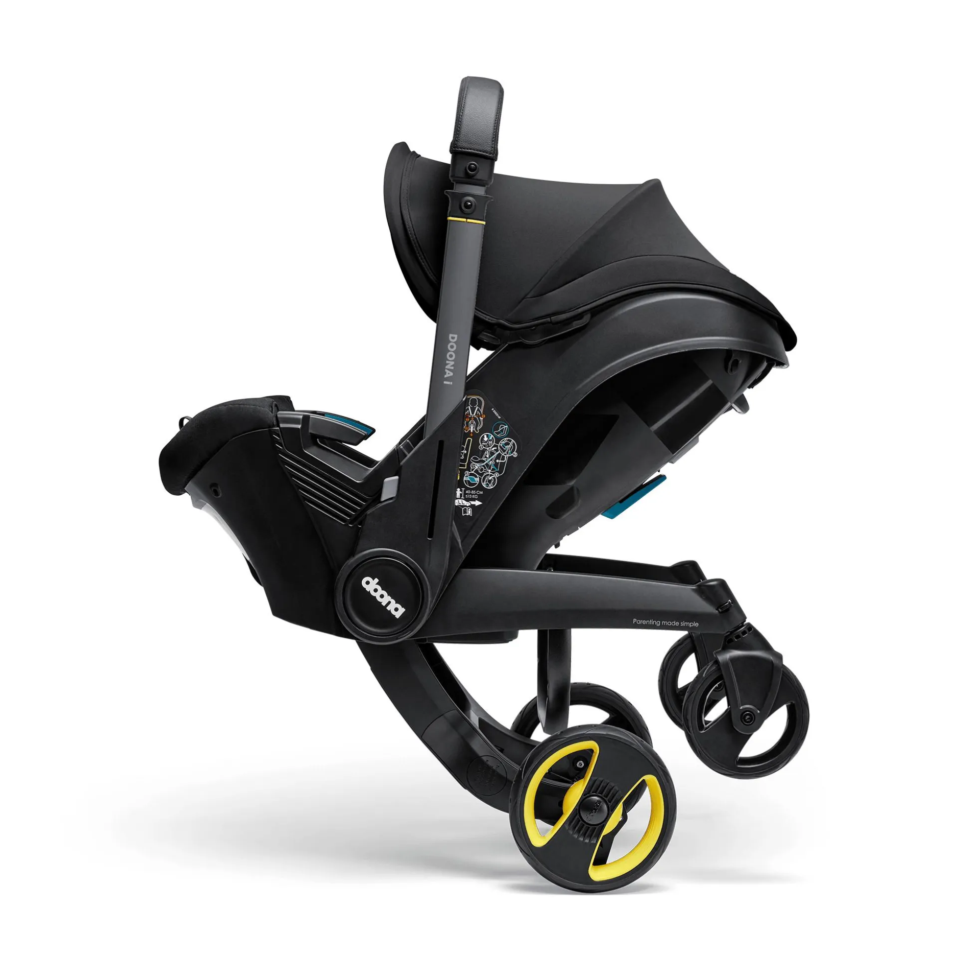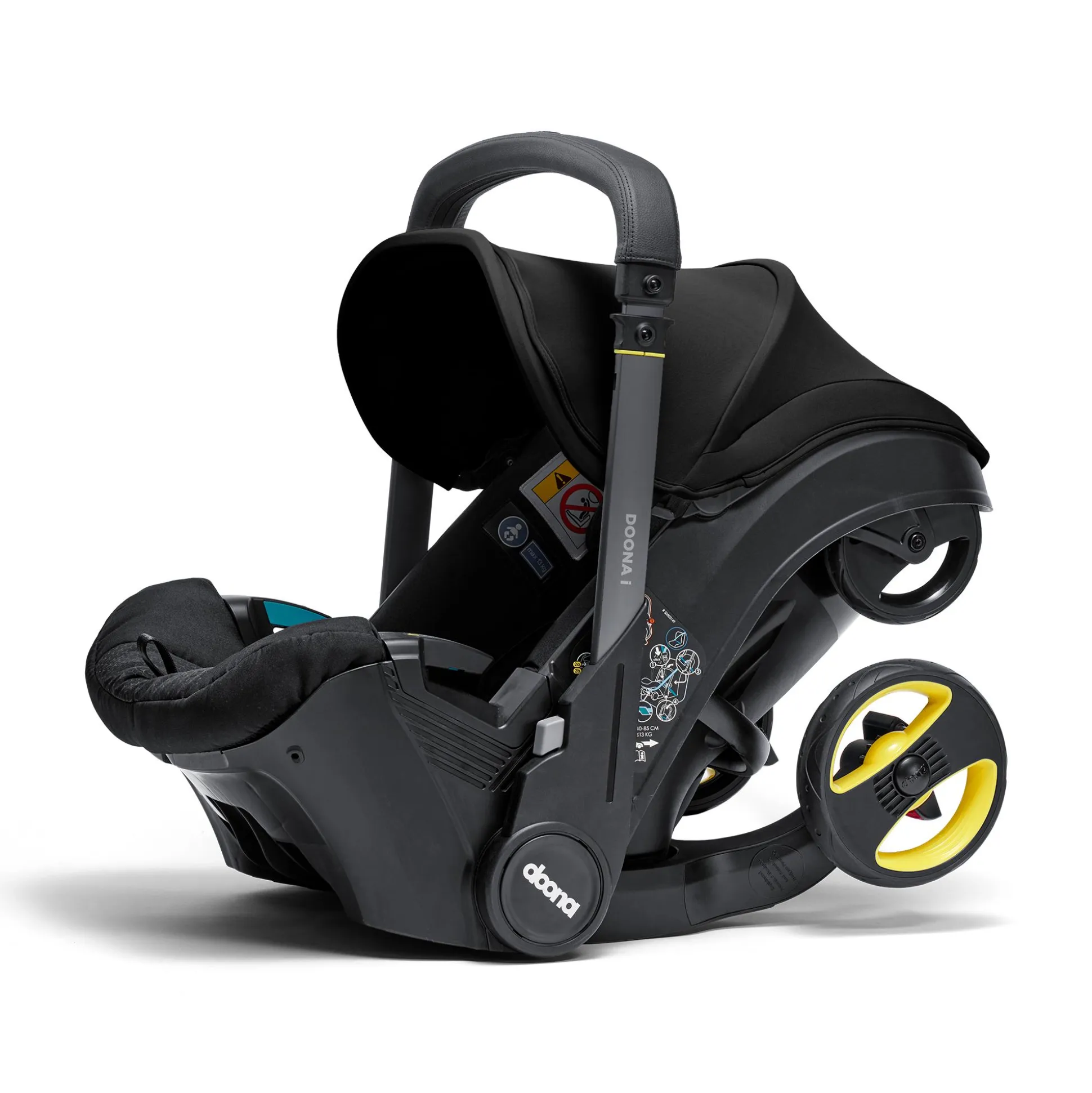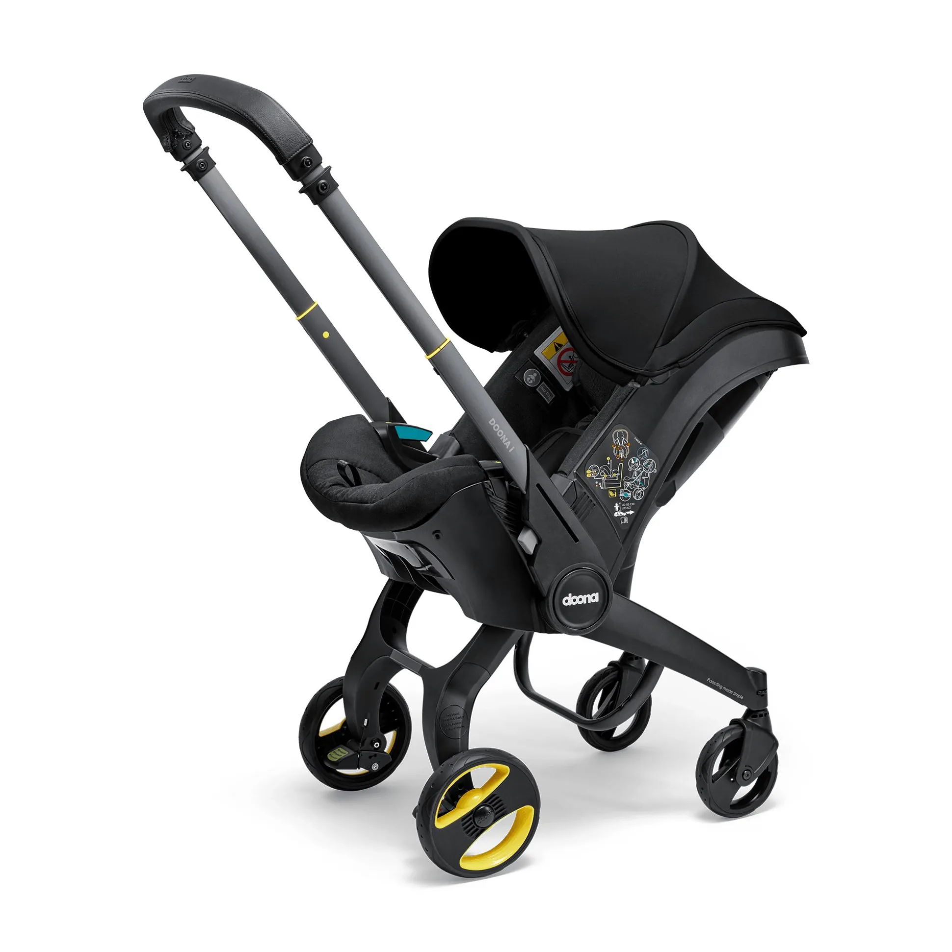 Ebenso komfortabel ist die Ausstattung. Von der herausnehmbaren Neugeborenen-Einlage über die verstellbare Kopfstütze mit mitwachsendem 5-Punkt-Gurtsystem bis zum Tragegriff mit edlem Kunstlederbezug, der beim Autofahren als Rückprallschutz fungiert und bei der Nutzung als Kinderwagen zum ausziehbaren Schiebebügel wird: Bei der Entwicklung des Doona i wurde an wirklich alles gedacht.