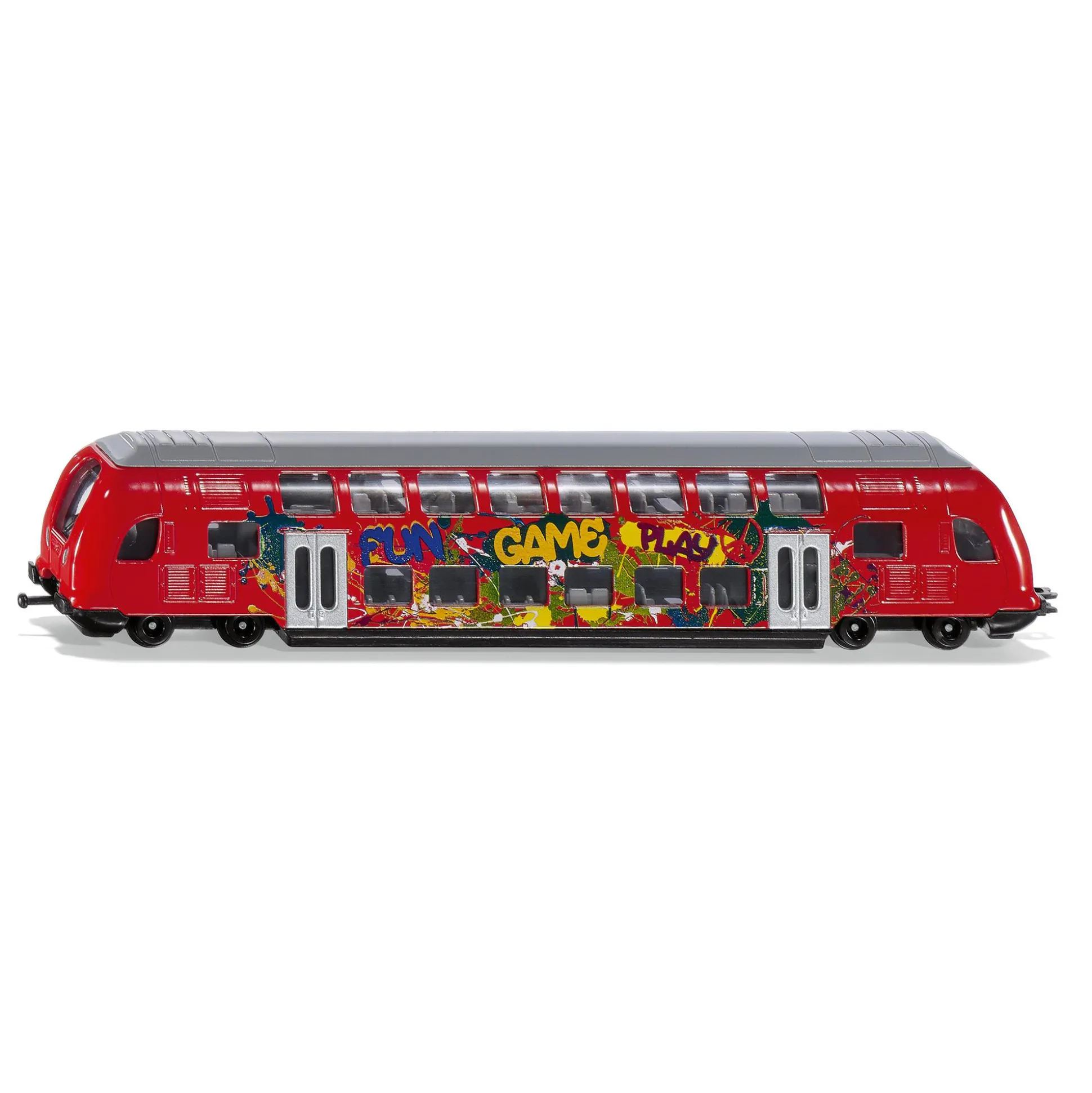 Der Doppelstock-Zug von siku fährt auf glatt laufenden Rädern und wird von bunten Graffitis verziert. An Front und Heck ist der Zug mit den Standardkupplungen für siku Züge ausgestattet. Dadurch können weitere Züge einfach angekoppelt werden. Der Zug sorgt mit diesen Kombinationsmöglichkeiten für einen langanhaltenden Spielspaß.