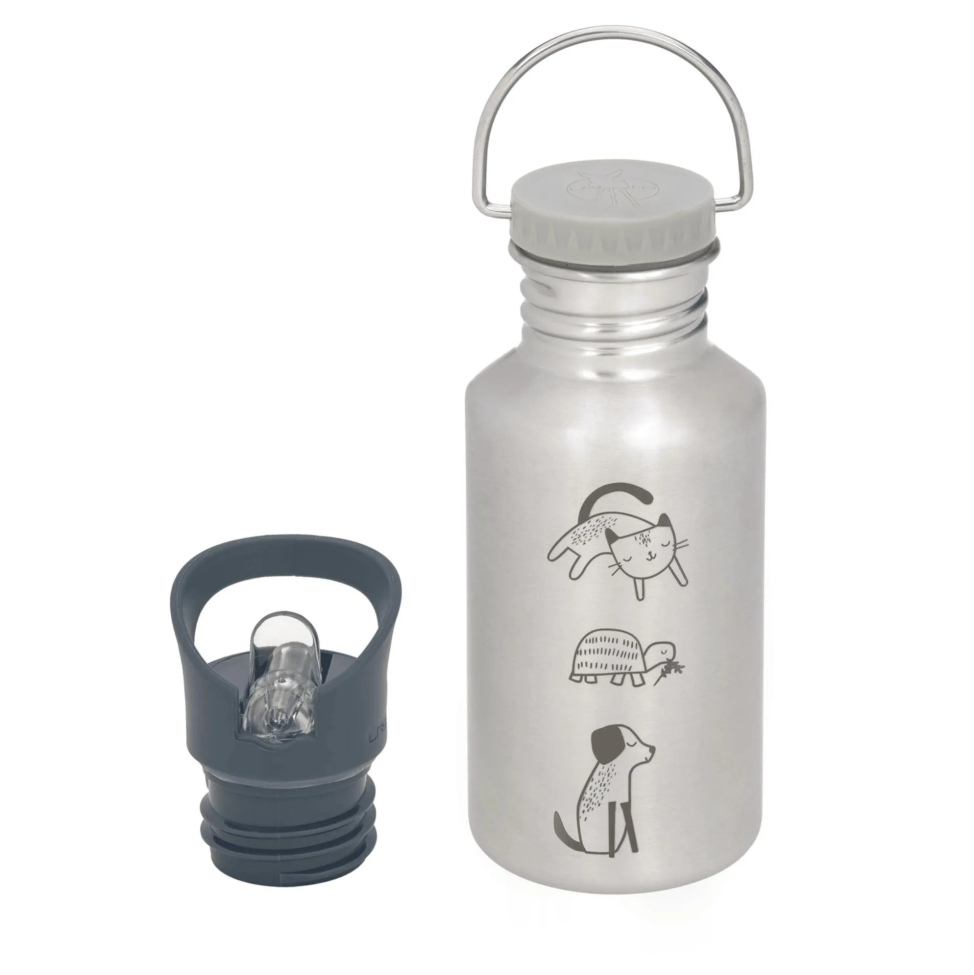 Die Trinkflasche kommt mit breiter Öffnung zum einfachen Nachfüllen und zwei verschiedenen Trinkverschlüssen: Der praktische Schraubverschluss mit Edelstahlbügel ermöglicht leichtes Tragen oder Befestigen. Der Sportverschluss erleichtert den Kindern das selbstständige Trinken.
