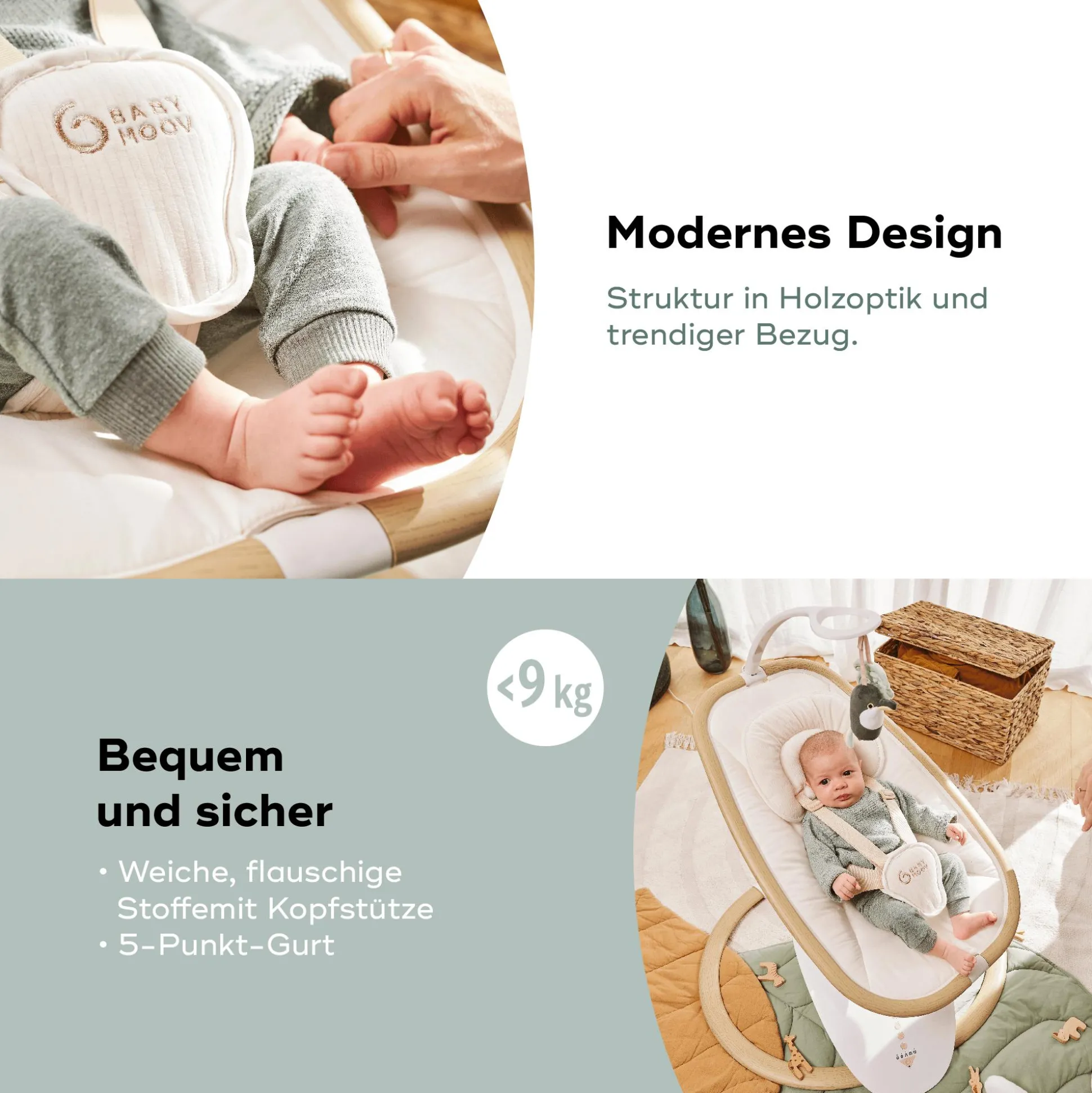 - Geborgenheitsgefühl dank individuell einstellbarer Schaukelbewegung