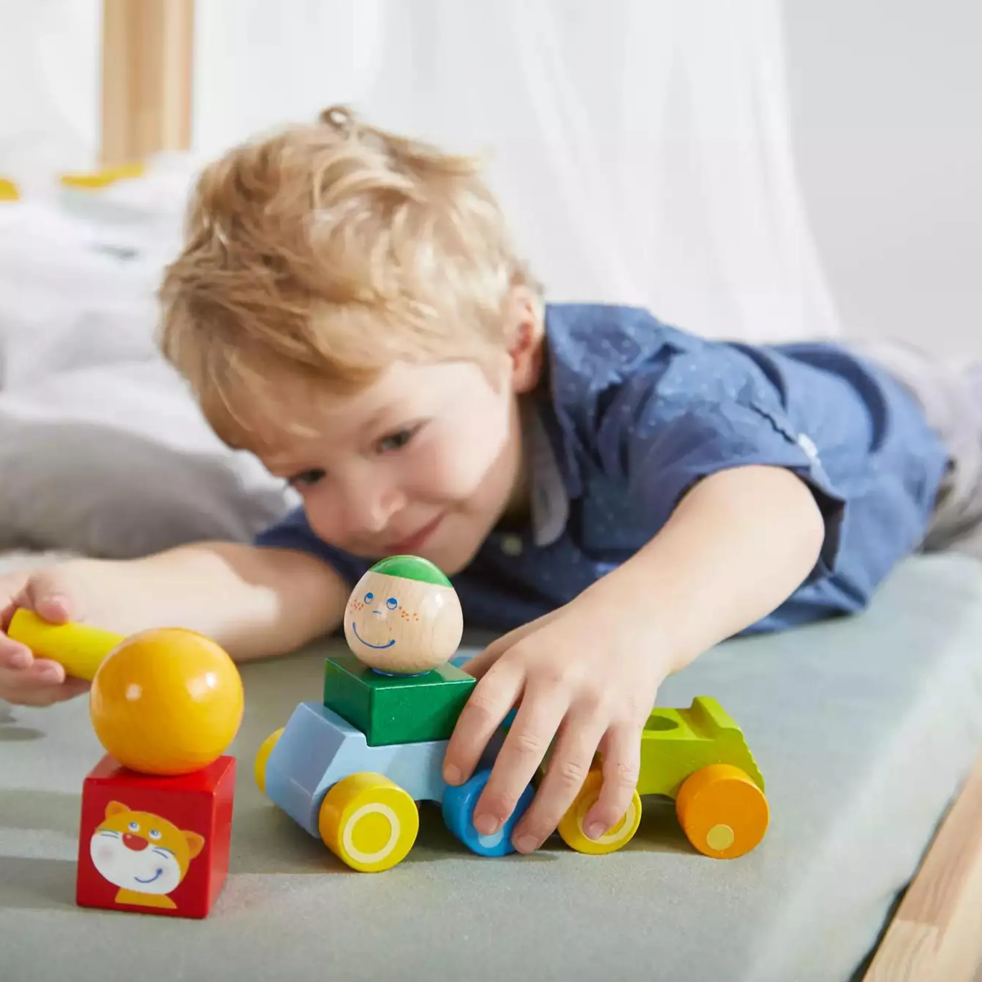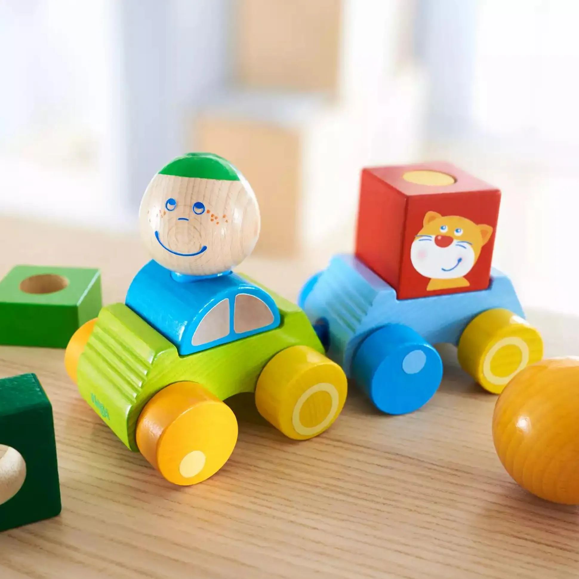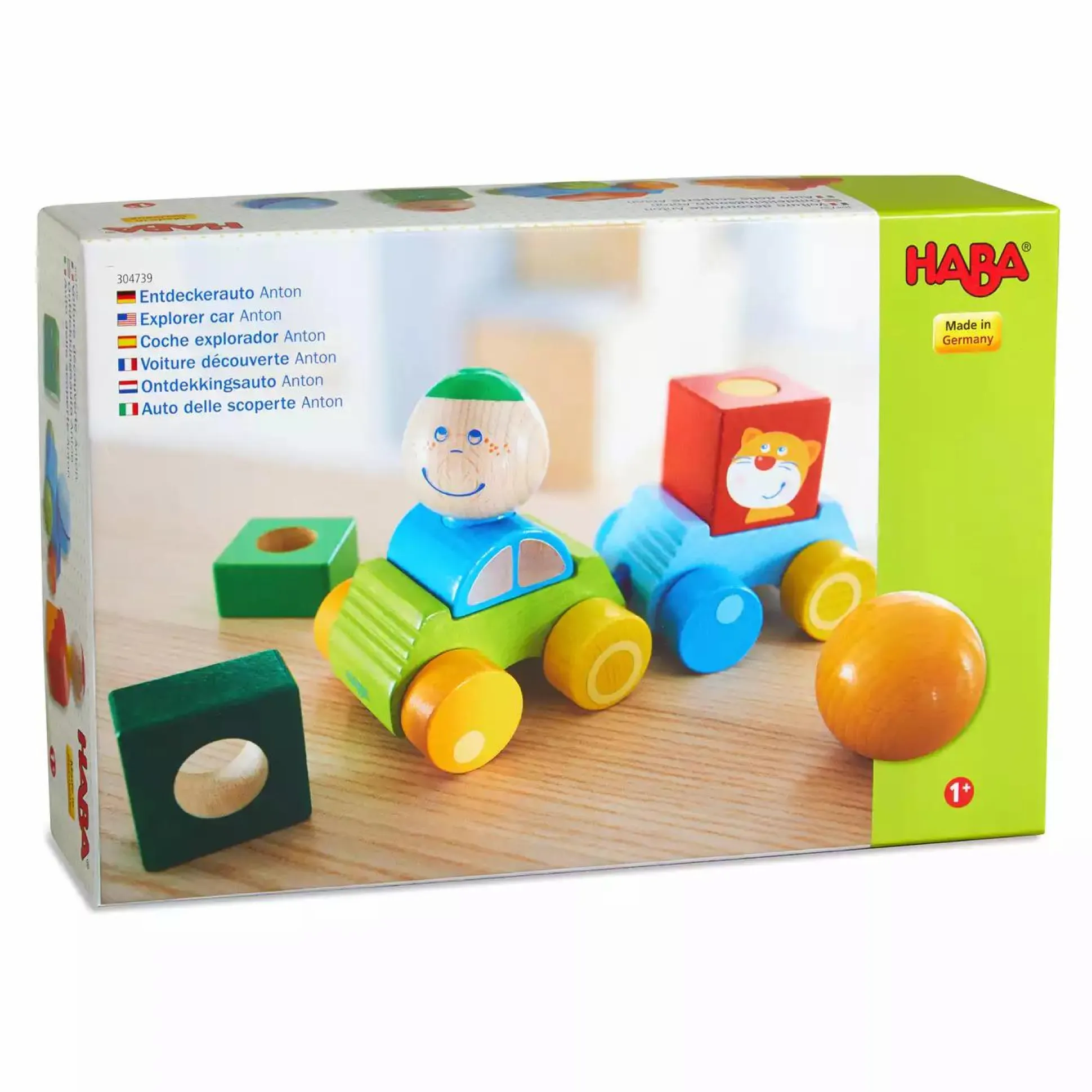 Mit dem bunten Entdeckerauto Anton von Haba können kleine Abenteurer die Welt um sich herum erkunden. Das farbenfrohe Auto mit Anhänger ist ein vielseitiges Holzspielzeug, das zum Bauen, Stecken, Fahren und Entdecken anregt. Die beiden Holzautos lassen sich dank praktischer Kupplung einfach verbinden und Steckfigur Paul aus Kugel und Rundstab kann immer wieder in seinen kleinen Wagen gesetzt oder herausgenommen werden. Dank Steckvorrichtung können auch im zweiten Wagen kleine Bausteine als wertvolle Fracht transportiert werden. Der rote Würfel mit Katzenmotiv und die kleine Holzkugel bringen zusätzlich Farbe und Spaß ins Spiel.