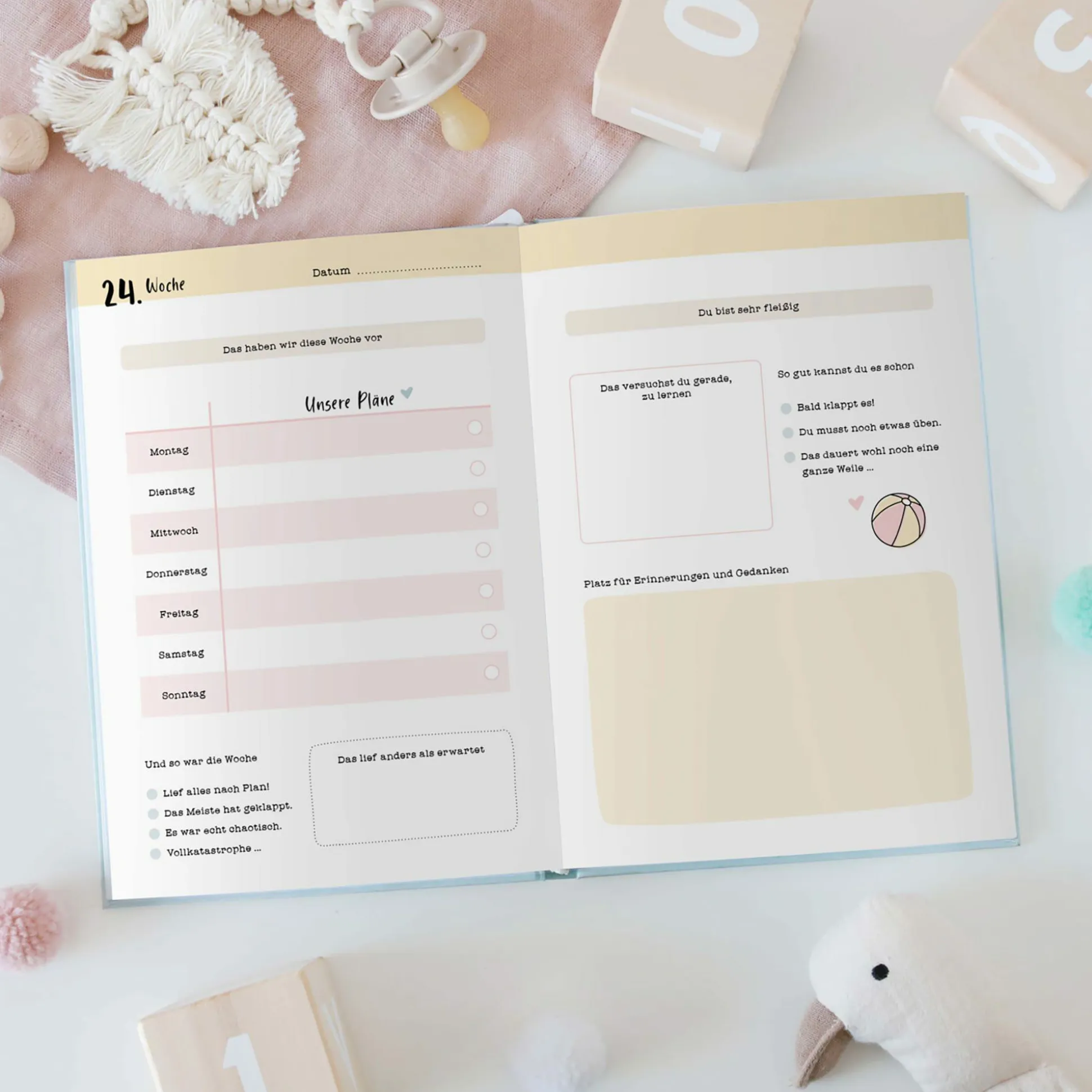 - zum Dokumentieren der wichtigsten Entwicklungsschritte in den ersten 12 Monaten deines Babys