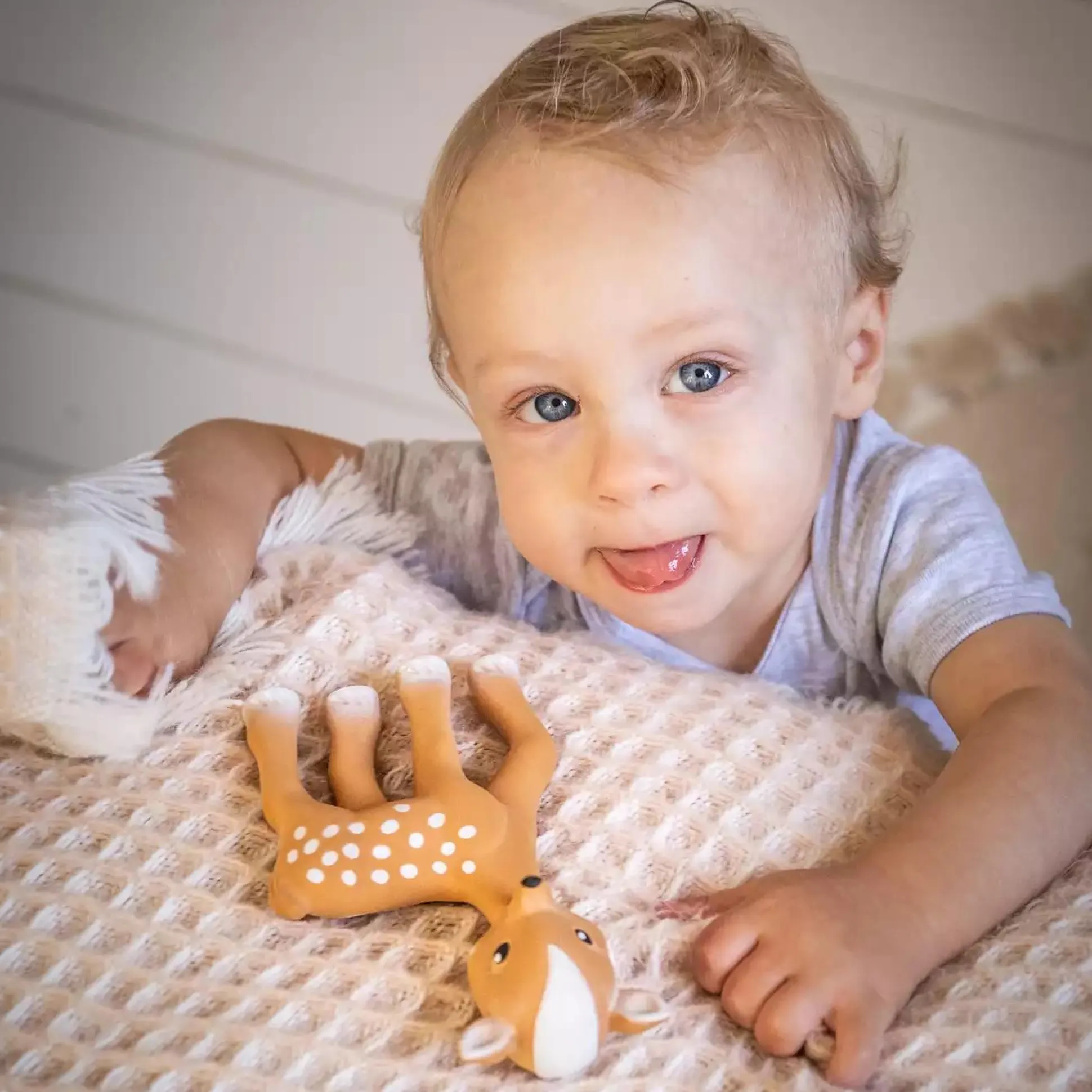 Fan Fan das kleine Rehkitz hilft deinem kleinen Schatz beim Zahnen und lindert den Schmerz, der dabei entsteht. Die Größe ist ideal für kleine Babyhände geeignet. Zudem besteht das Material zu 100% aus Naturkautschuk und ist somit völlig unbedenklich für dein Baby. Fan Fans kontrastreiche Flecken ziehen die Blicke auf sich und die Quietsche amüsieren dein Kind.