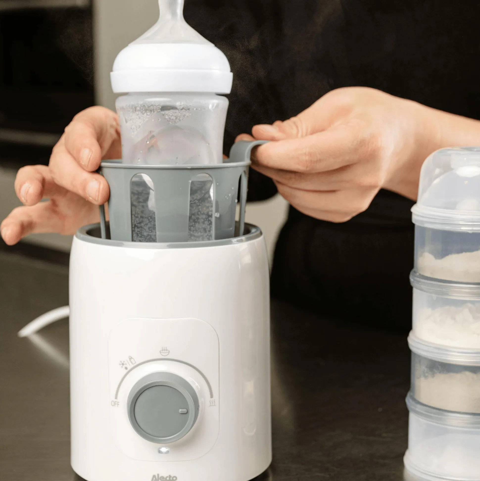 Die Temperatur lässt sich stufenlos einstellen, und dank der mitgelieferten Halterung können auch Babynahrungsgläser problemlos erhitzt werden. Eine integrierte Warmhaltefunktion sorgt dafür, dass die Nahrung auf Temperatur bleibt, bis sie gebraucht wird.