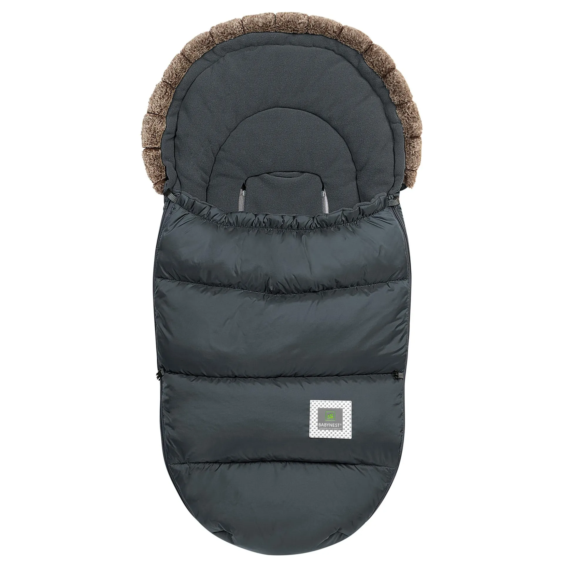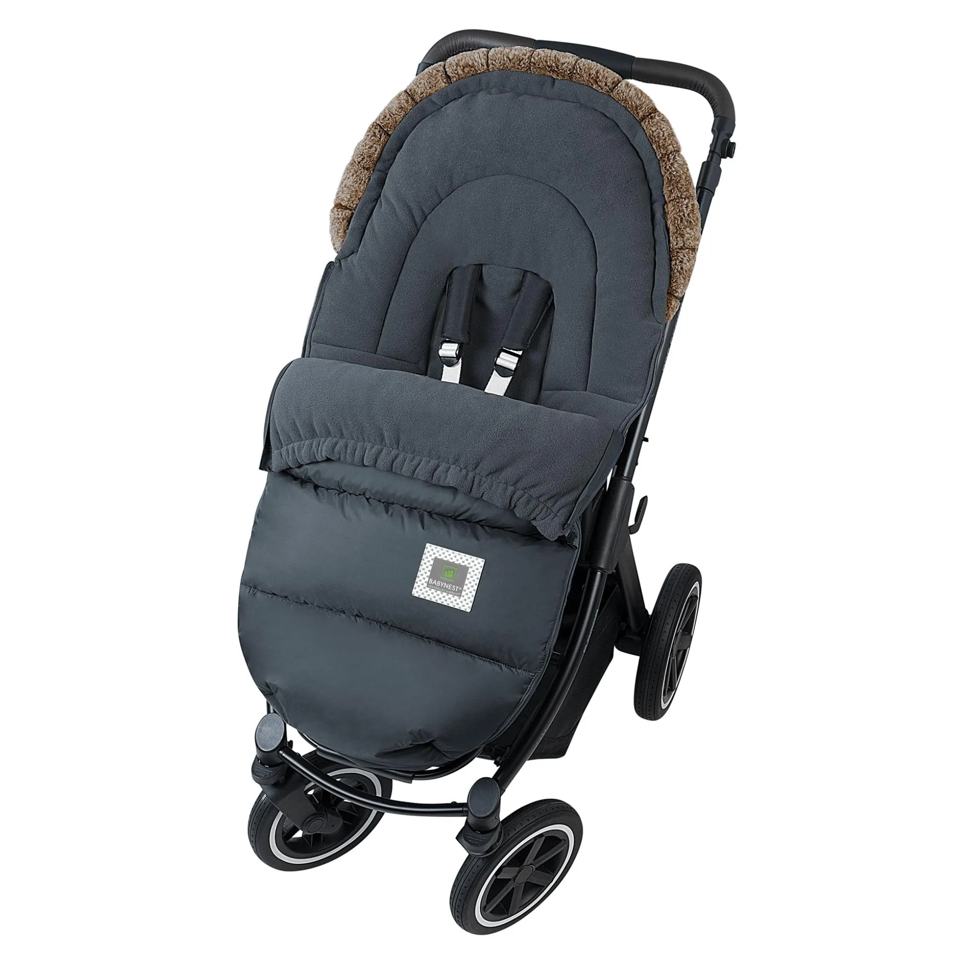 Für Tage mit milderen Temperaturen ist der anthrazitfarbene Fußsack Luca mit speziellen Clip-up-Schließen ausgestattet: So kannst du ihn ein wenig öffnen, an beiden Seiten umschlagen und mit jeweils einem Klick sicherstellen, dass die beiden geöffneten Seitenteile in ihrer Position verbleiben. Das Vorderteil ist außerdem abnehmbar – somit ist der für Allergiker geeignete Fußsack Luca auch als praktische Auflage zu verwenden.
