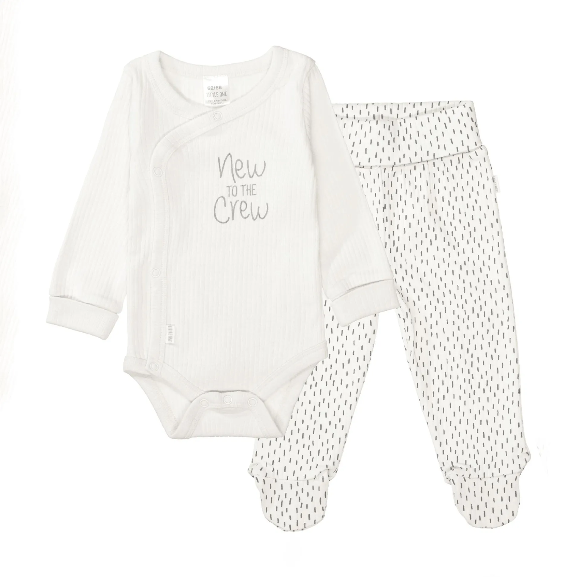 Das Geschenkset Crew von LITTLE ONE besteht aus einem weichen Langarmbody und einer gemütlichen Leggings, perfekt für die ersten Abenteuer deines Schatzes. Der Body überzeugt mit einem niedlichen Schriftzug „New to the Crew“ und praktischen Druckknöpfen, die das An- und Ausziehen besonders einfach machen. Die Hose mit dezentem Muster bietet angenehme Bewegungsfreiheit und rundet das Outfit stilvoll ab.