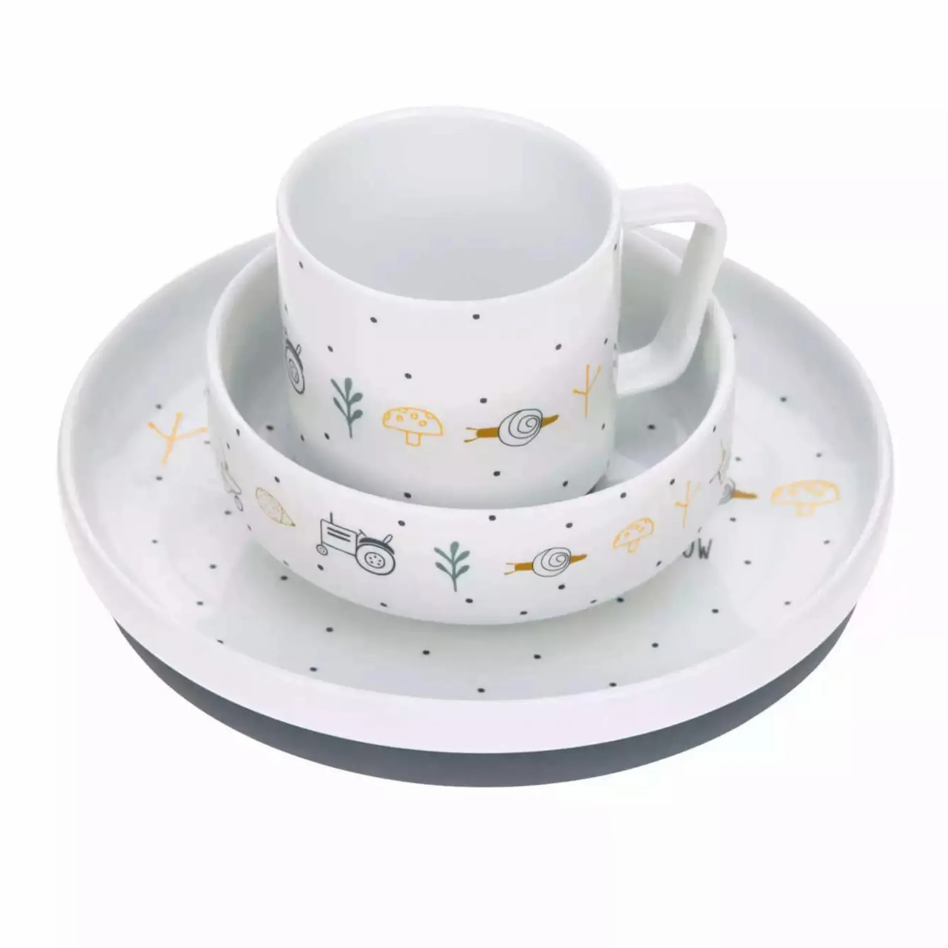 Mit dem LÄSSIG Kindergeschirr Set aus Porzellan essen die Kleinen wie die Großen. Mit den süßen Gartenmotiven – Traktor, Schnecke und Weitere – macht das Essen gleich viel mehr Spaß. Für einen besseren Halt auf dem Tisch sind auf der Unterseite des Geschirrs Rutschstopper aus Silikon angebracht. Diese können bei Bedarf einfach abgenommen werden.