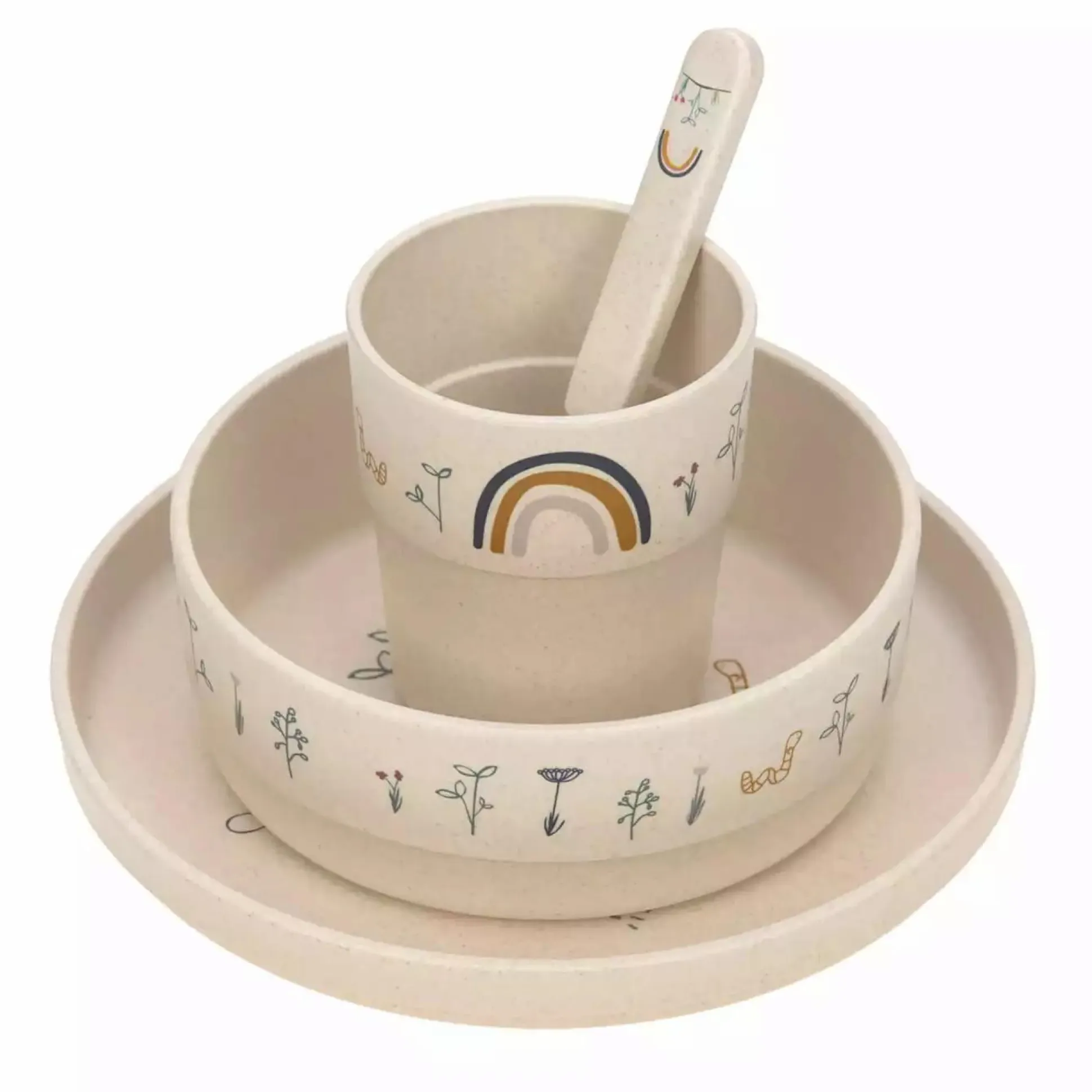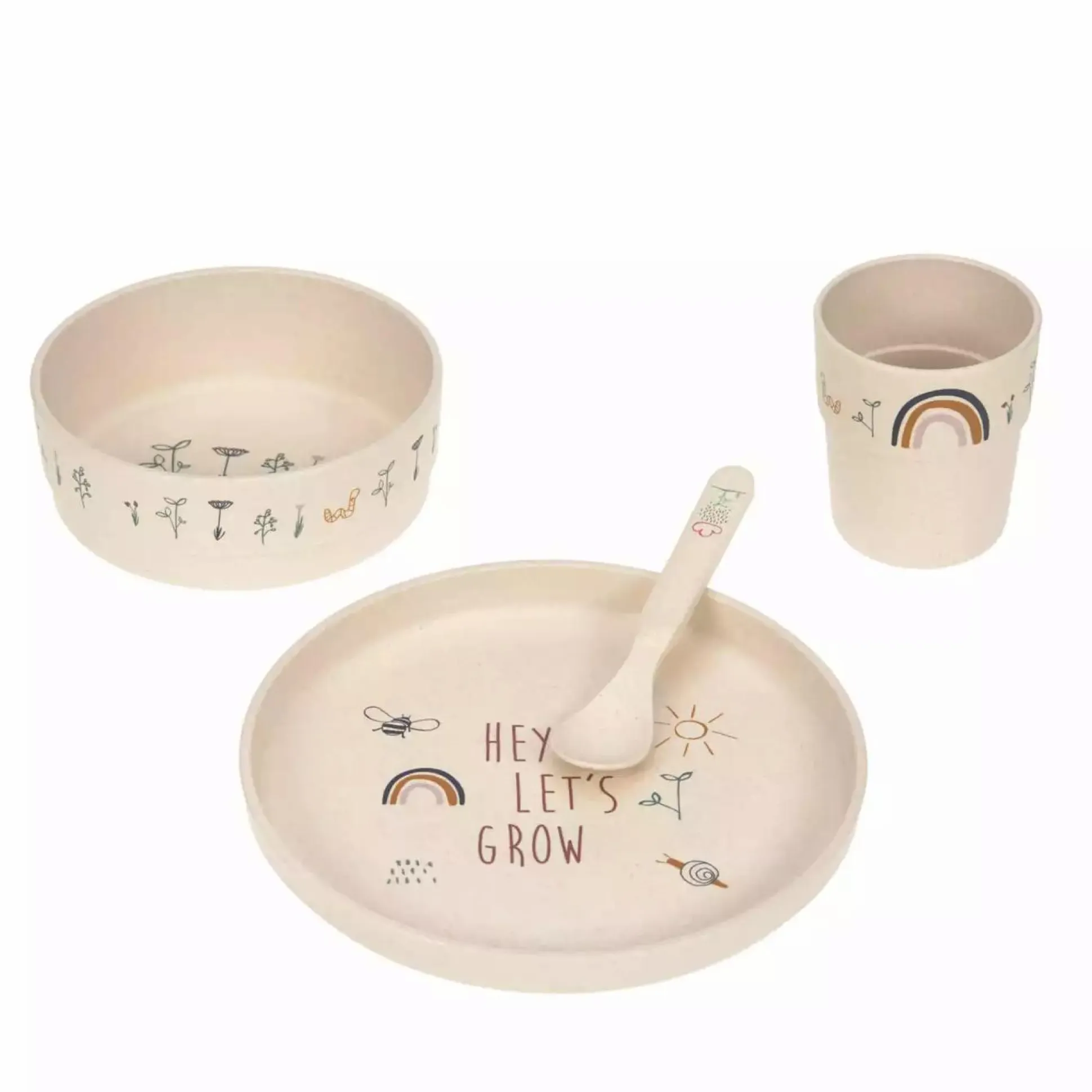 Das 4-teilige Lässig Kindergeschirr-Set aus der Garden Explorer Kollektion lädt kleine Feinschmecker ein, die Natur auch am Tisch zu erkunden. Zum Kindergeschirr-Set gehören ein Kinderteller, ein Schälchen, ein Becher sowie ein Löffel. Der rutschfeste Ring auf der Unterseite des Geschirrs sorgt für einen besseren Halt auf dem Tisch.