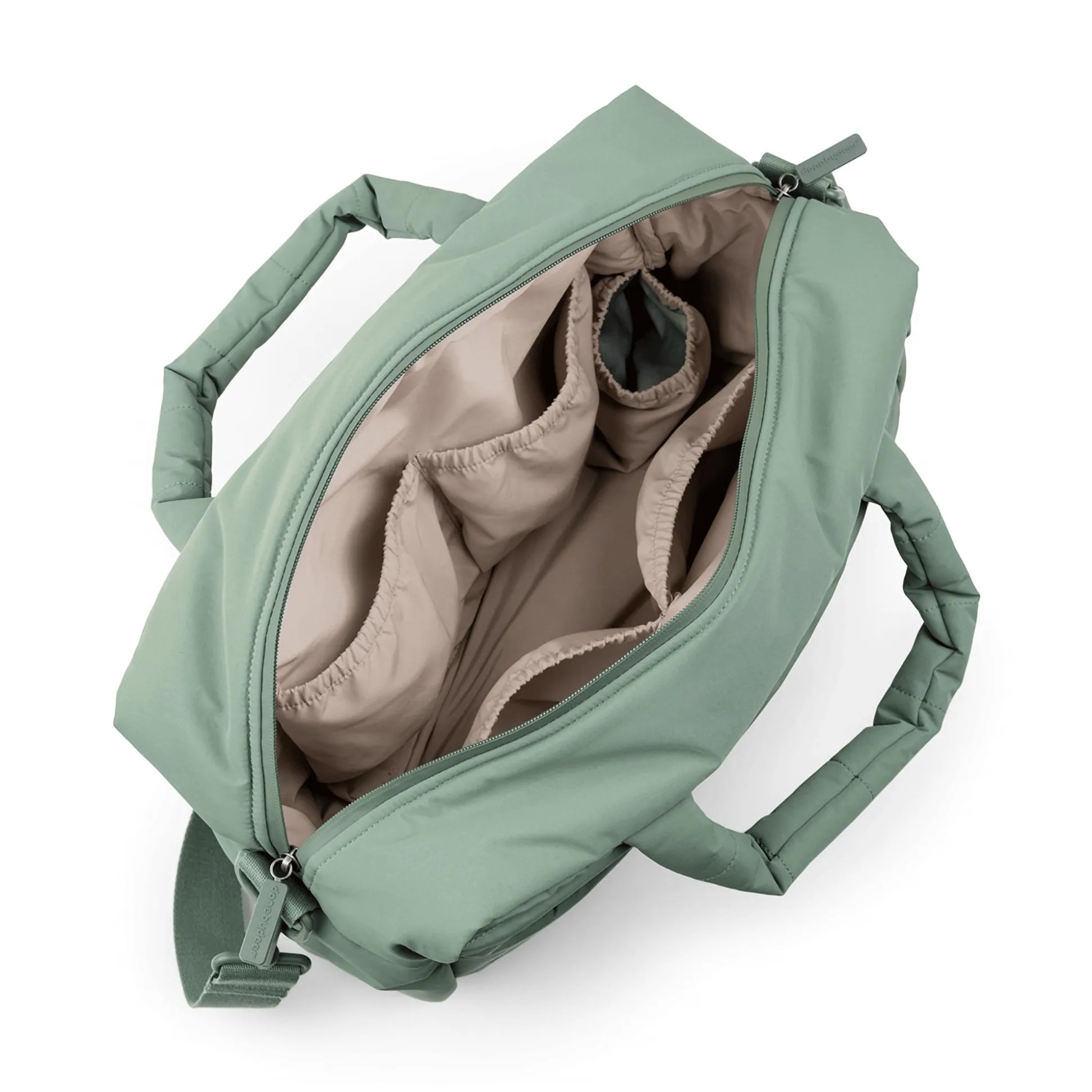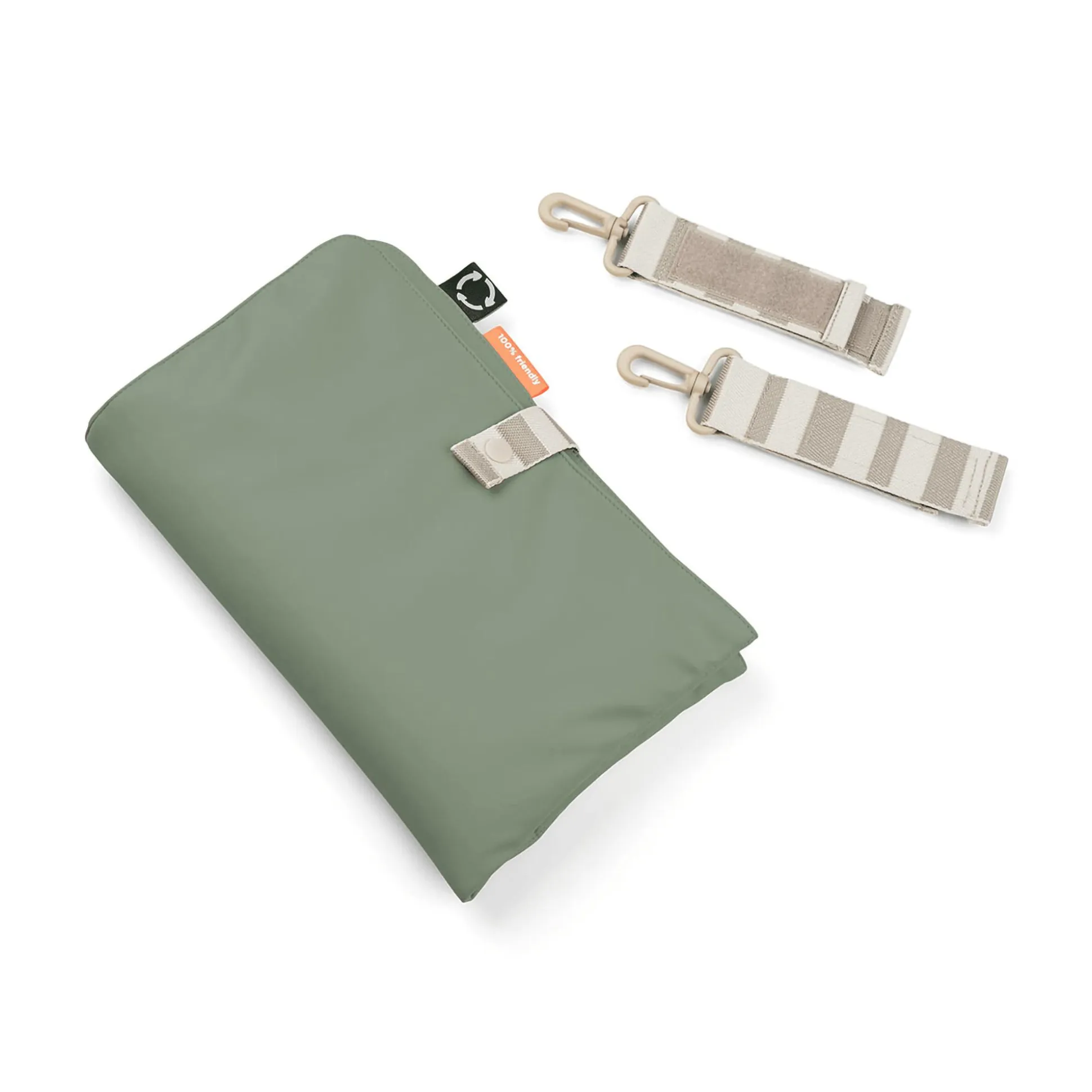 Die Wickeltasche und die Wickelunterlage bestehen aus recyceltem Polyester, gefertigt aus insgesamt 48 PET-Flaschen.Das weiche gesteppte Design in Grün macht die Tasche nicht nur funktional, sondern auch stilvoll. Die äußeren Riemen ermöglichen eine einfache Befestigung am Kinderwagen deines kleinen Lieblings.