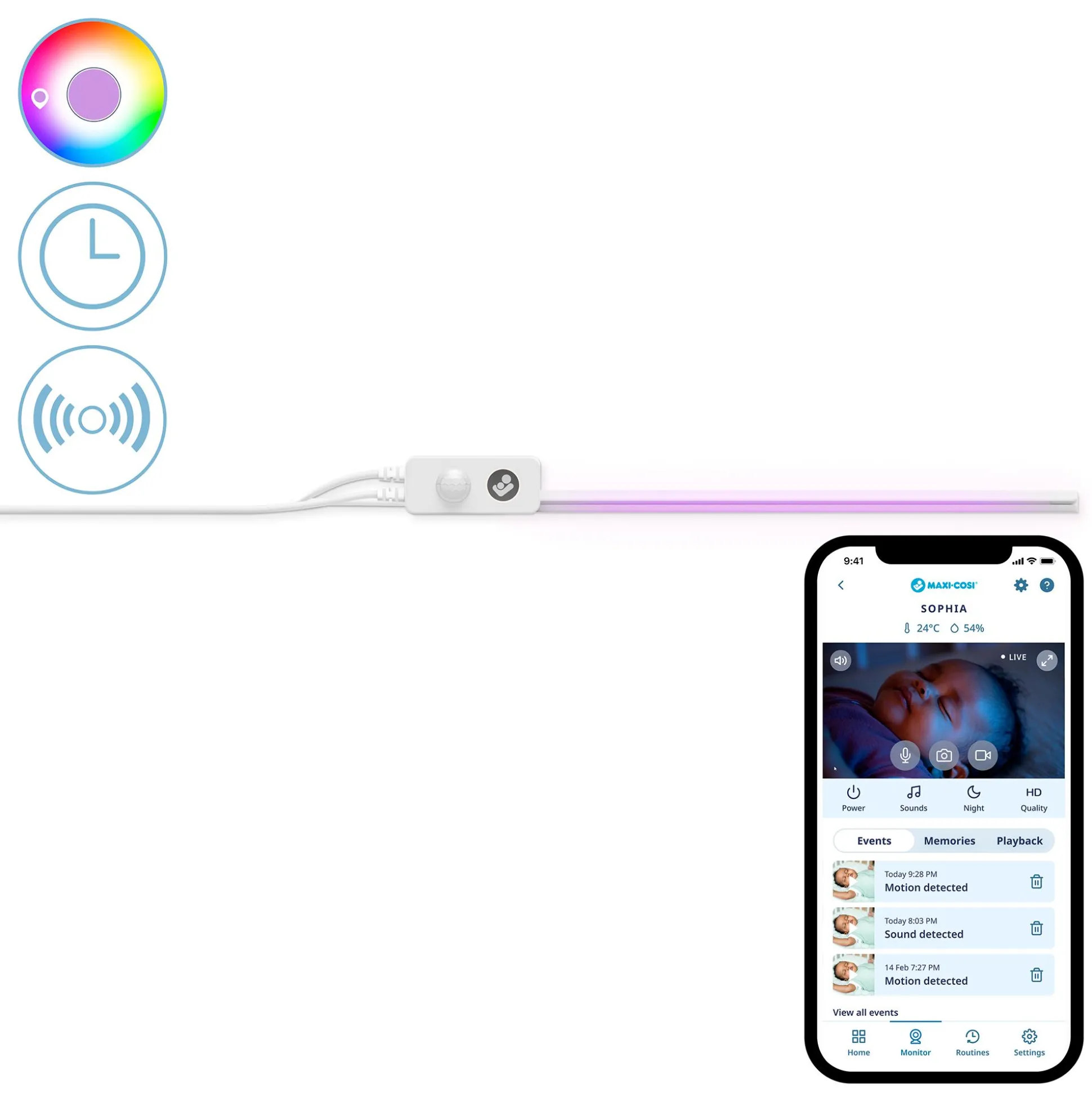 Die Maxi-Cosi Glow Unterbettbeleuchtung gibt dir die beruhigende Gewissheit, dass dein Baby ungestört weiterschlafen kann, wenn du tagsüber oder nachts nach ihm schaust. Ein intelligenter Bewegungsmelder schaltet sanftes Licht ein, wenn du dich dem Kinderbett näherst und dimmt automatisch zurück, wenn du das Kinderzimmer verlässt; so musst du nie das große Licht einschalten und riskieren, dein Baby zu wecken. Über die Connected Home-App kannst du die Einstellungen personalisieren, um Entfernung, Timer, Zeitpläne, Lichtfarbe und Helligkeit zu steuern.