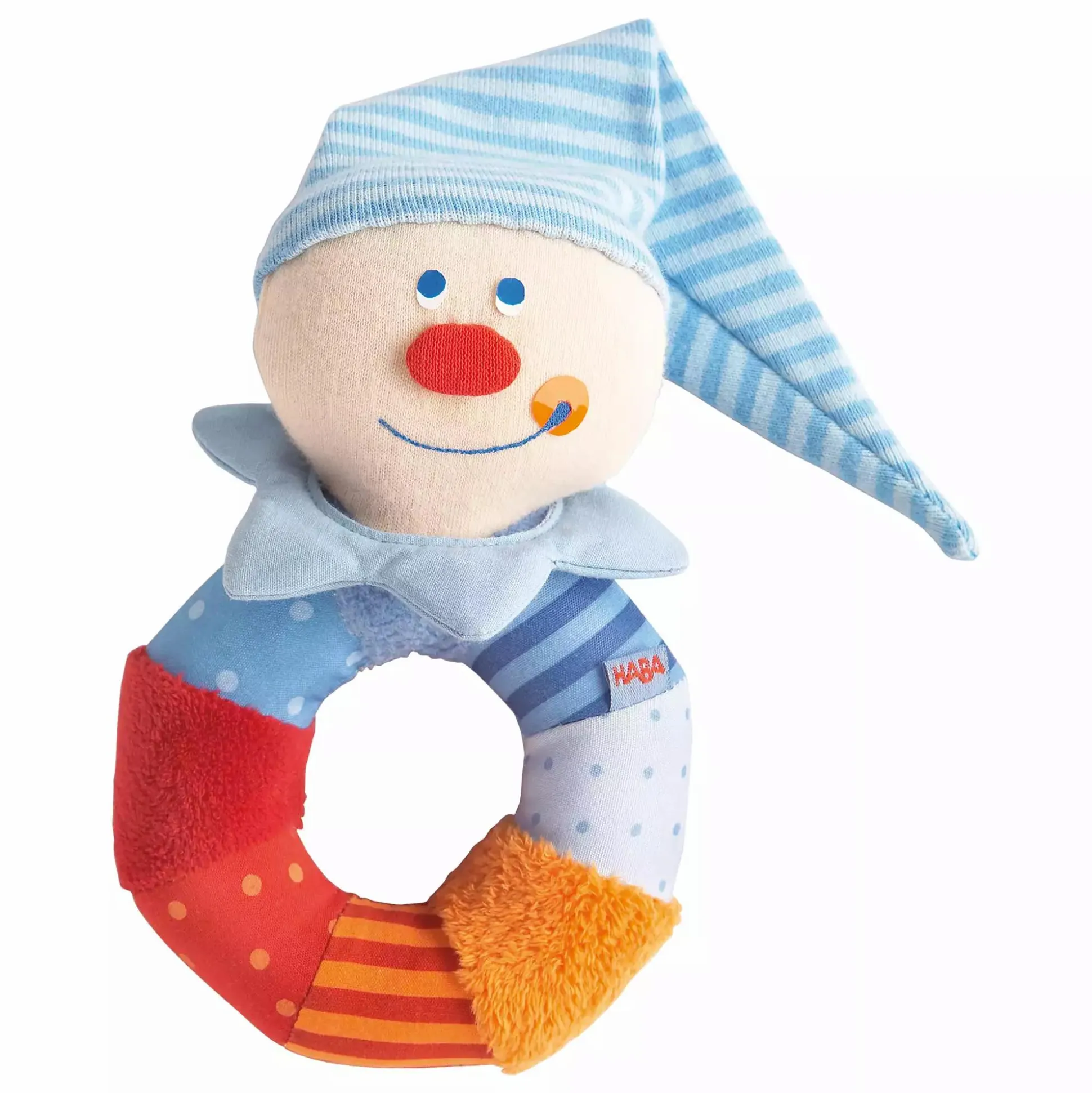 Der farbenfrohe HABA Greifling Kasper Ringel wird schnell zum besten Freund deines Babys von Geburt an – ob als Kuschel-Kasper beim Einschlafen oder als Spielzeug unterwegs. Dein kleiner Liebling wird das lustige Gesicht mit der roten Knubbelnase und Zipfelmütze lieben.
