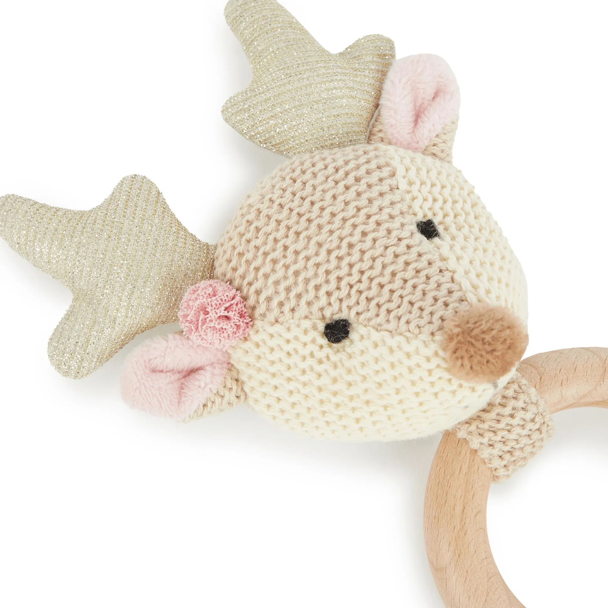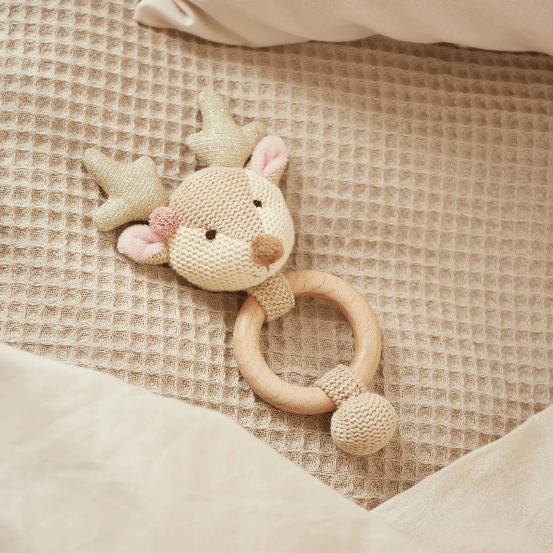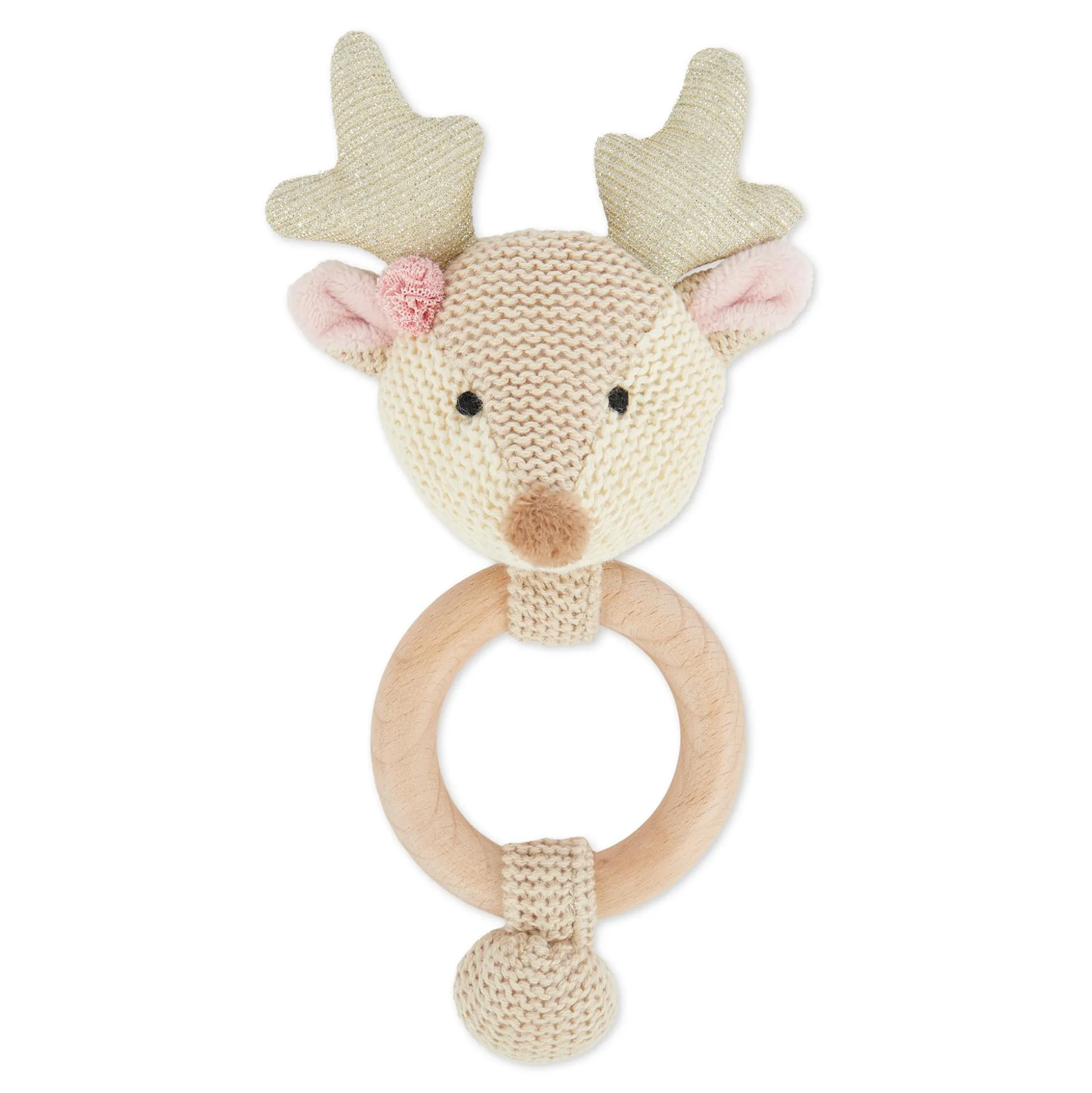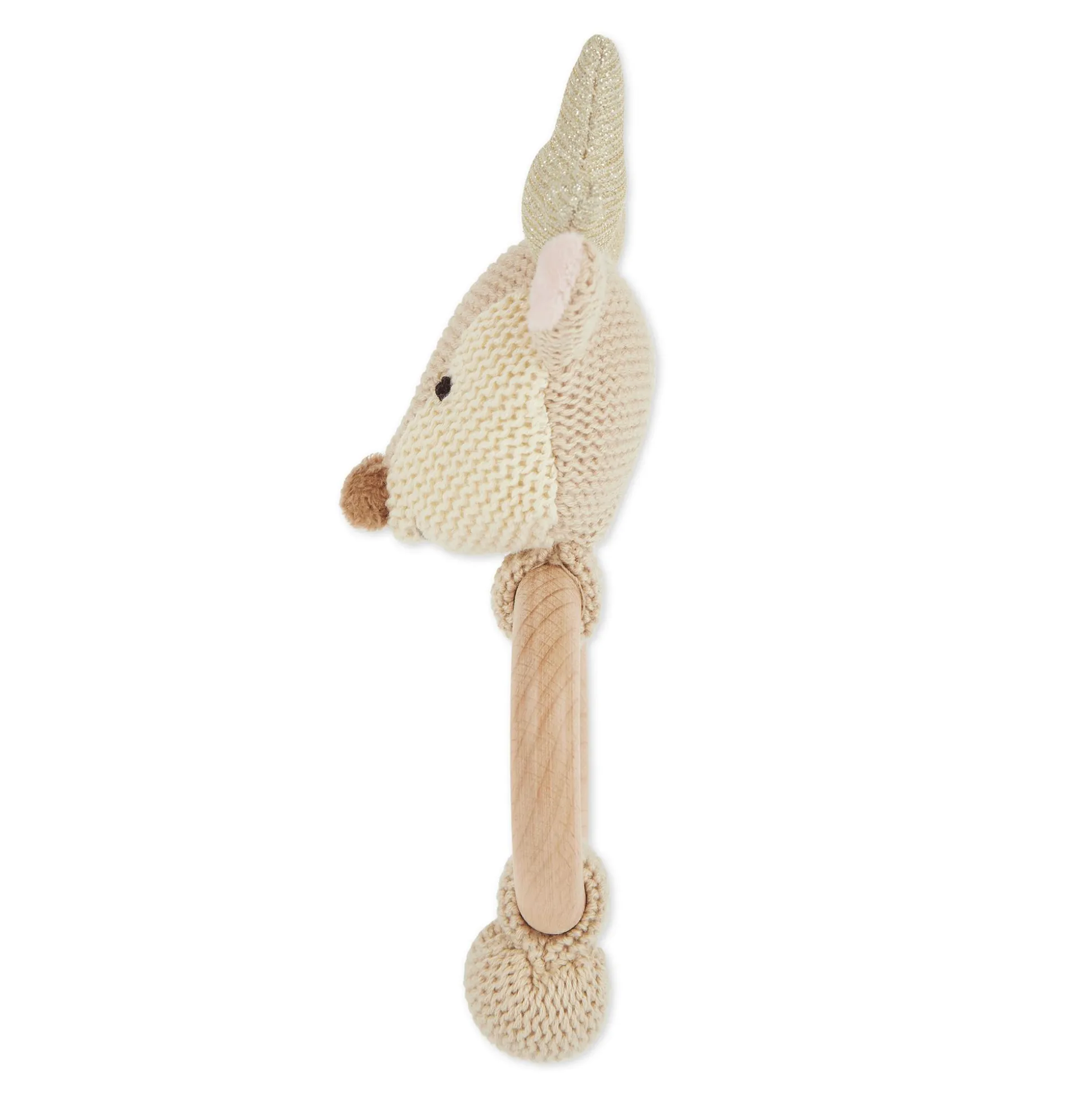Als Zahnungshilfe stärkt der Holzring den Gaumen deines Babys und hilft den Zahnungsschmerz zu lindern. Wenn das süße Reh geschüttelt wird, rasselt es fröhlich und fördert so spielerisch die Feinmotorik und den Gehörsinn deines Babys. Das dezente Design macht das Lernspielzeug zu einem stylischen Begleiter.