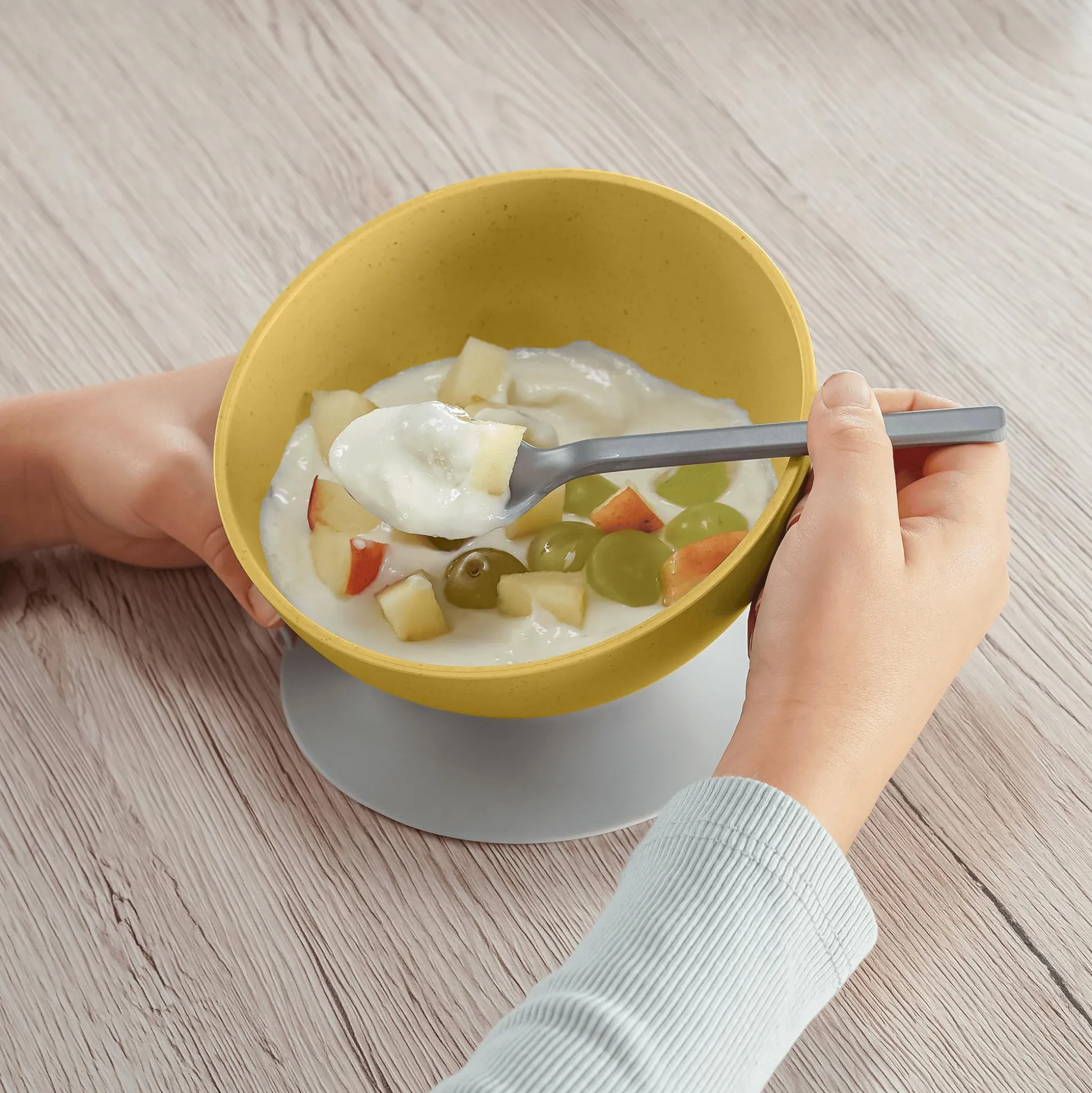 Die Schale ist besonders leicht und bruchsicher, sodass sie den Herausforderungen des Alltags problemlos standhält. Mit einem Material aus 80% nachwachsenden Rohstoffen wie Zucker und Holz aus Deutschland ist sie eine umweltfreundliche Wahl für bewusste Eltern.