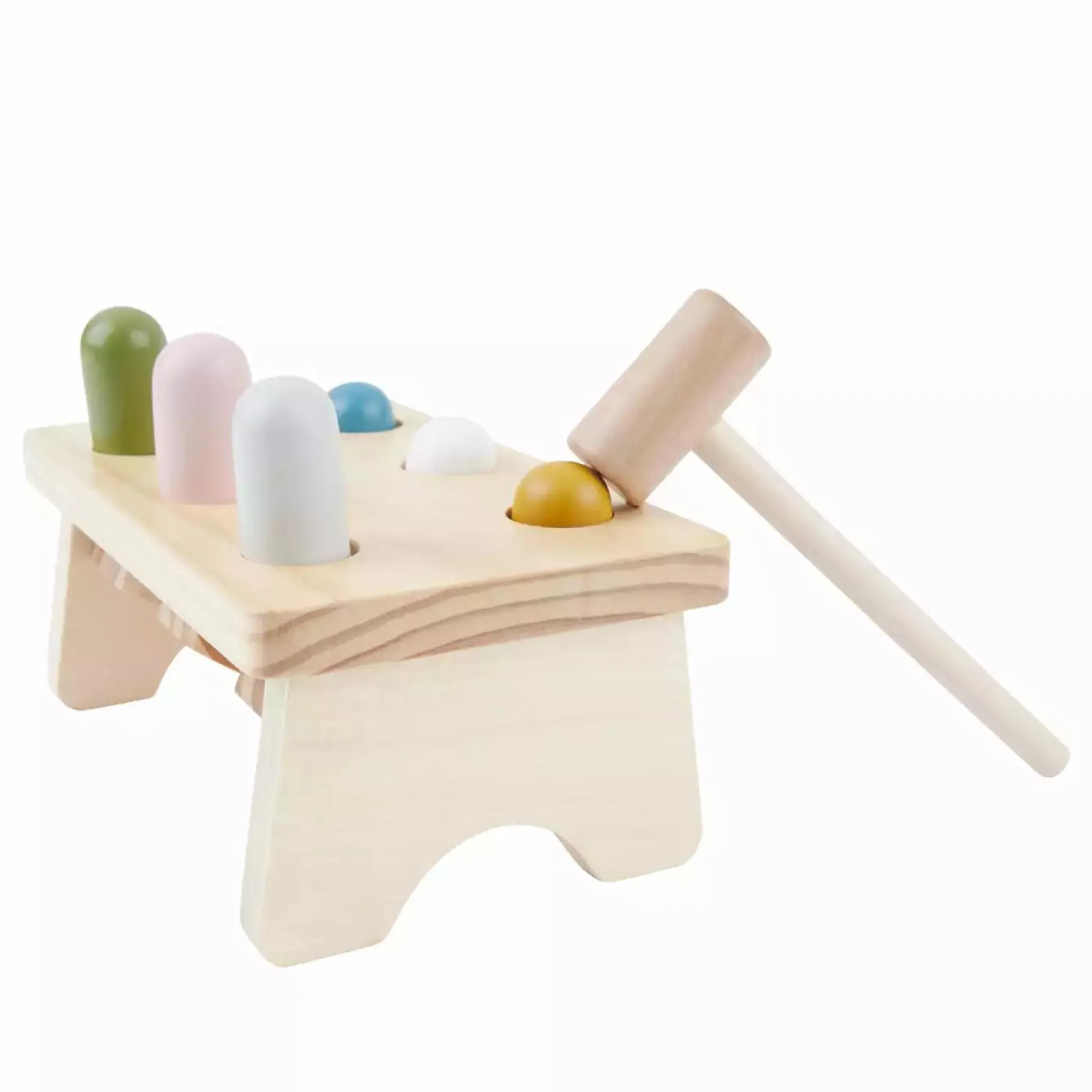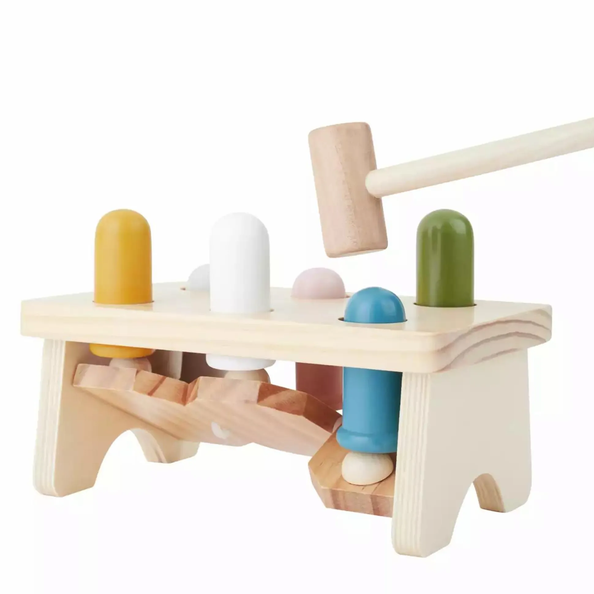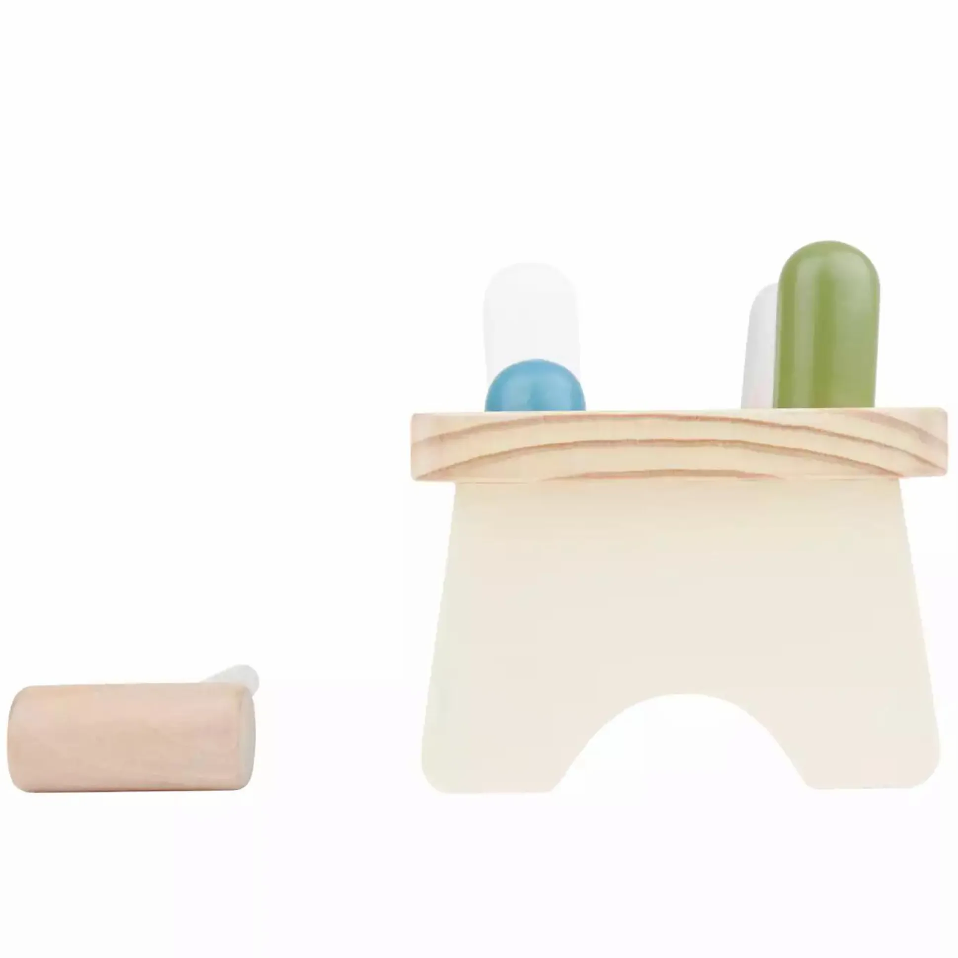 Mit der Hammerbank von Bieco kommt garantiert keine Langeweile auf! Klopft dein Kind mit dem Hammer auf die bunten Holzstifte, bewegen sich diese lustig auf und ab. Spielerisch werden so die Feinmotorik und Hand-Augen-Koordination deines Kindes gefördert. Je zwei Holzstifte sind durch Holzstege miteinander verbunden und bewegen sich gegensätzlich. Dein Kind lernt beim Hämmern somit, seine Kräfte einzuschätzen und Zusammenhänge zu erkennen. Das dezente Design in hübschen Scandi-Farben macht das pädagogisch wertvolle Lernspielzeug aus hochwertig verarbeitetem Holz zu einem stylischen Begleiter, der Eltern und Kind begeistert.