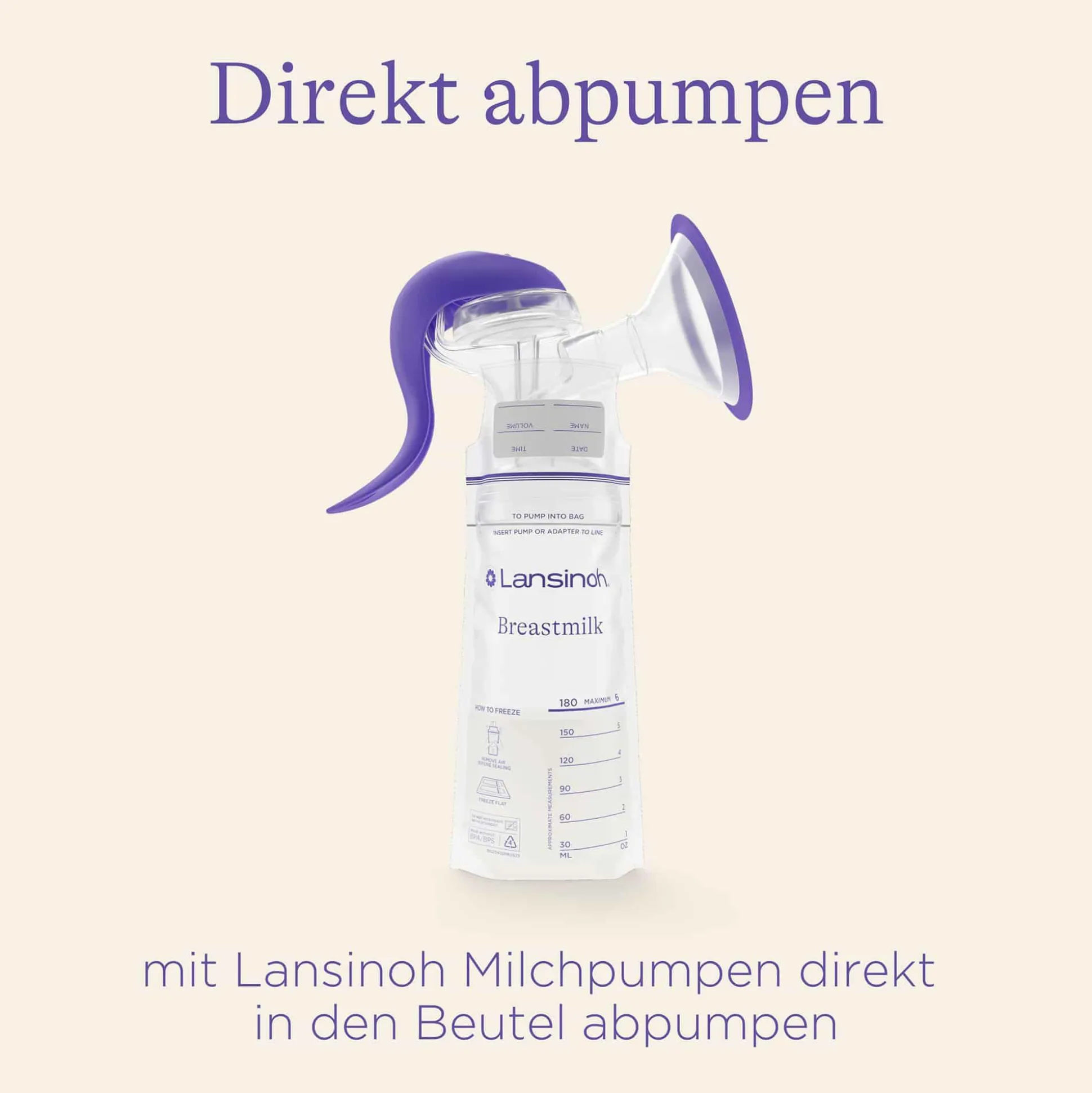 Natürlich ist die Handmilchpumpe kompatibel mit den Lansinoh® Weithalsflaschen und den NaturalWave® Saugern. Und mit den cleveren Muttermilchbeuteln kann direkt in den Beutel abgepumpt werden – ganz ohne Umfüllen und ohne dass ein Tropfen der wertvollen Milch verloren geht.