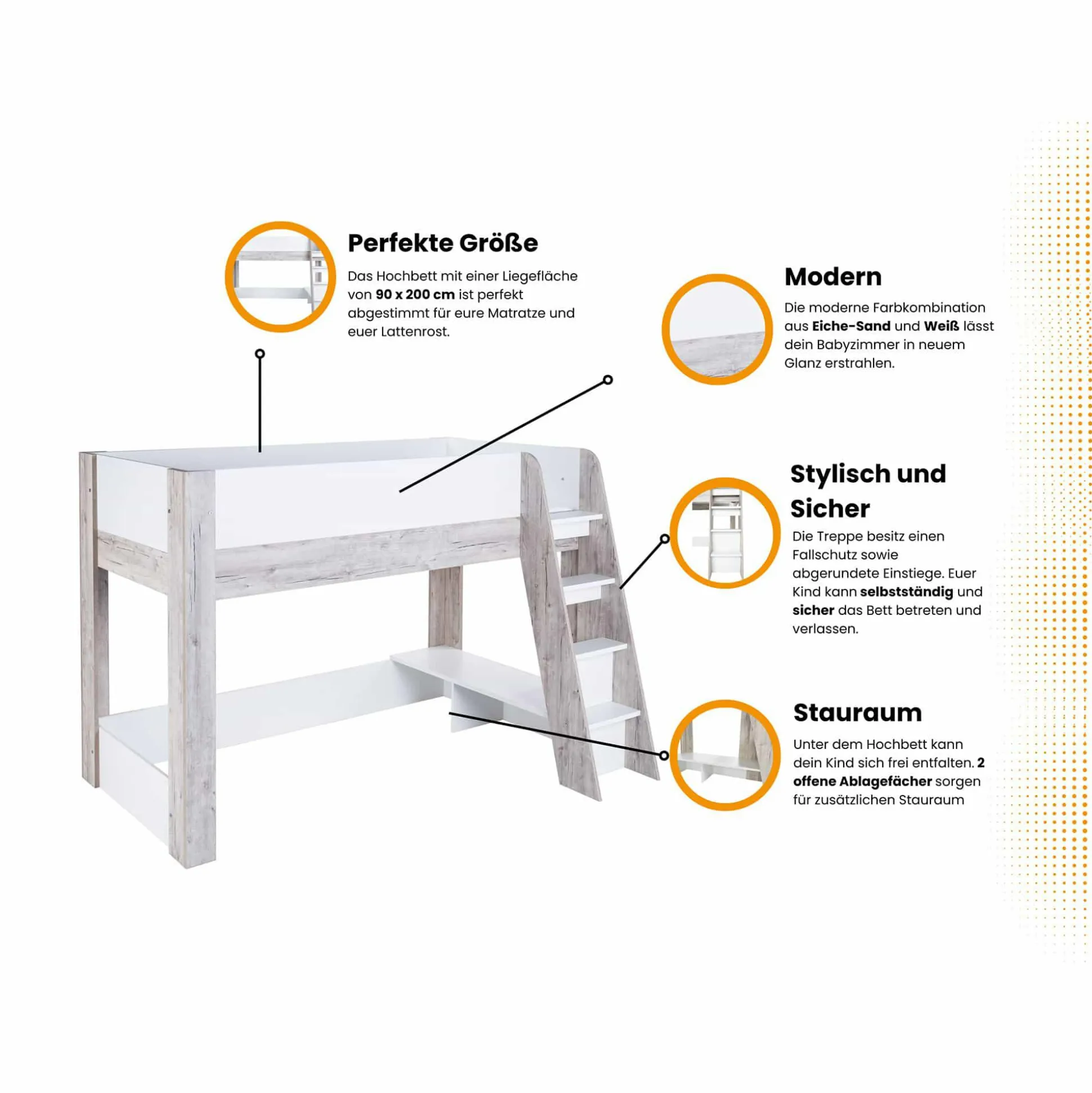 Das Bettgestell bietet den perfekten Ort für erholsame Nächte und wundervolle Träume. Doch der größte Pluspunkt, den so ein Hochbett mit sich bringt, ist der gewonnene Freiraum unter dem Bett, den dein Kind zusätzlich noch als Kuschel- oder Spielecke nutzen kann.