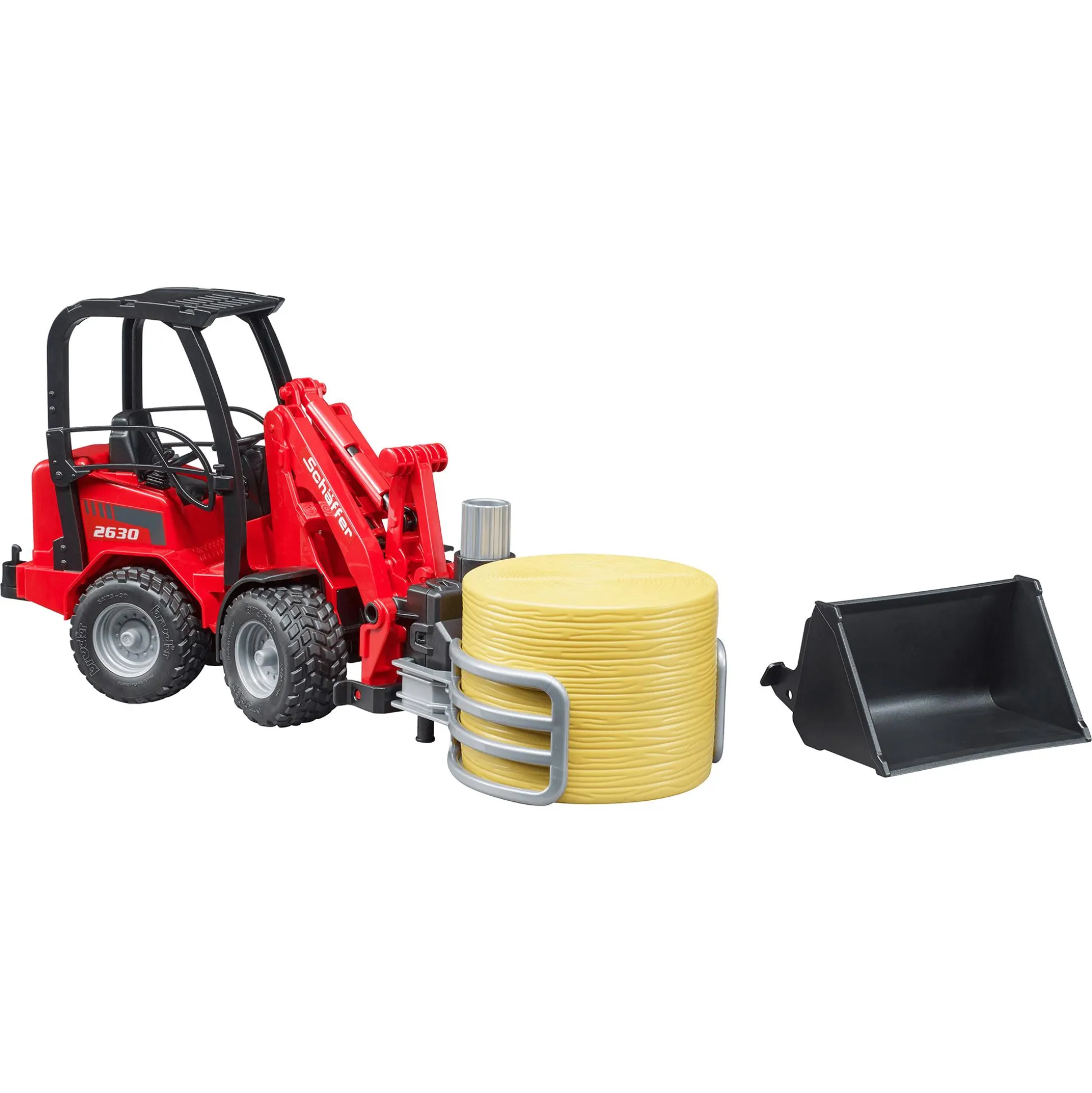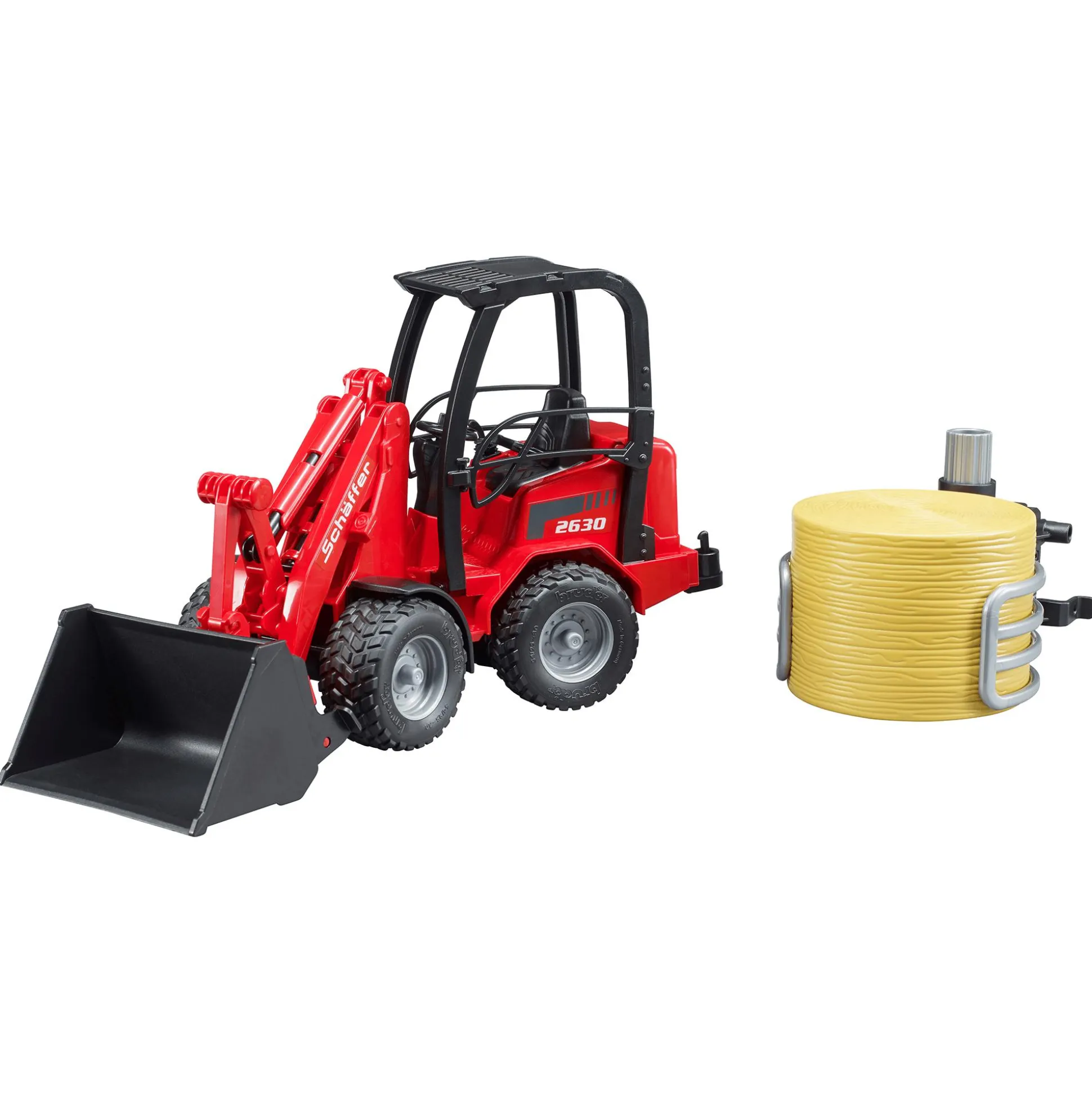 Der Hoflader ist mit einer funktionierenden Knicklenkung ausgestattet, die maximale Wendigkeit auf engem Raum ermöglicht – genau wie beim Original. Der bewegliche Ladearm und die Ballengreifzange lassen sich präzise steuern: Die Greifzange öffnet und schließt sich durch einfaches Drehen am oberen Stellrad und ermöglicht das Greifen und Transportieren des mitgelieferten Rundballens. Der massive Überrollbügel sorgt dafür, dass eine B-World Figur (nicht im Lieferumfang enthalten) sicher im Fahrersitz Platz nehmen kann.