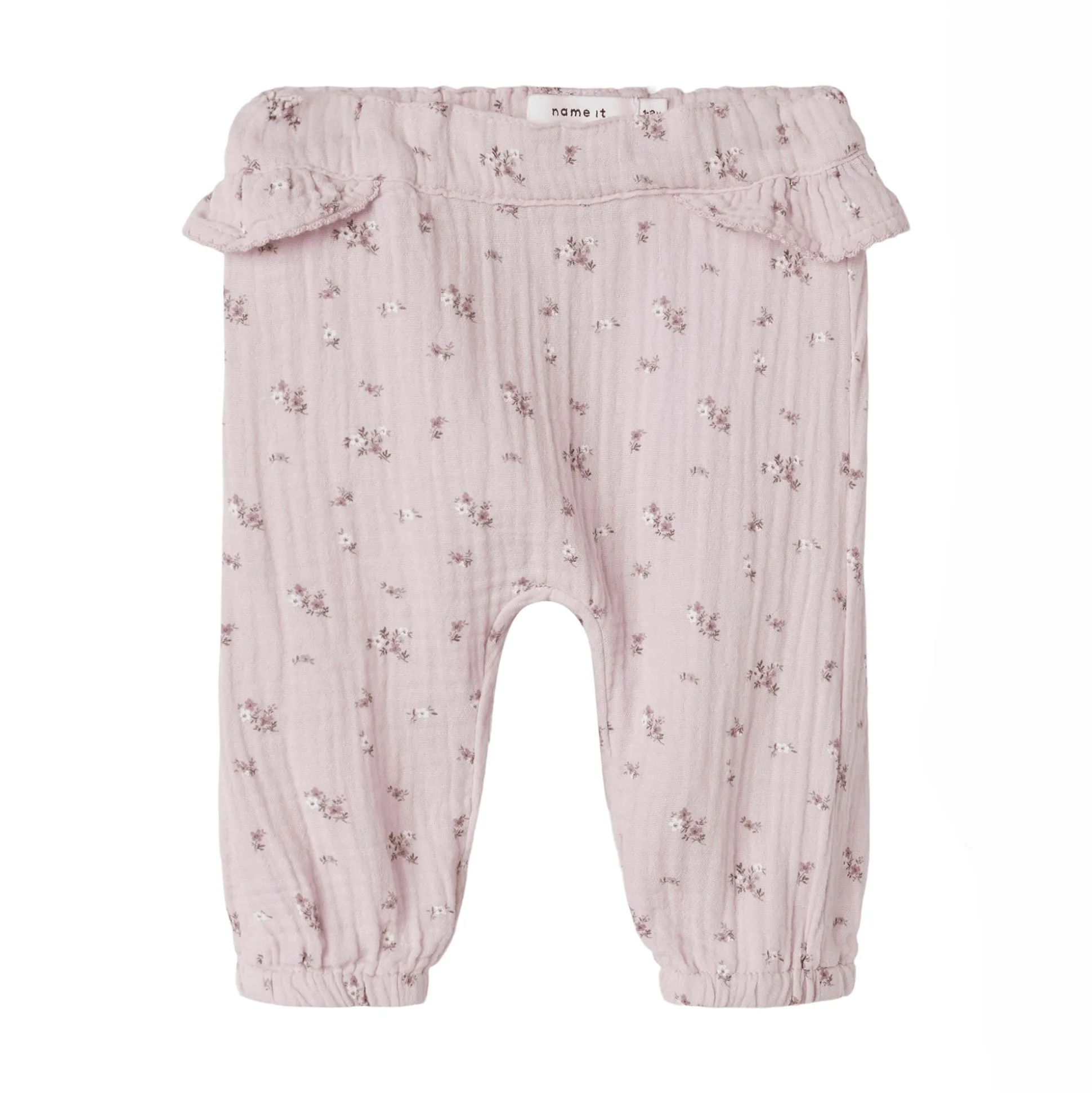 Diese süße Hose aus weichem Musselin-Stoff von name it besticht durch ihr niedliches Design und ihren hohen Tragekomfort. Dazu kann durch den verstellbaren, elastischen Hosenbund die Passform individuell angepasst werden.Die elastischen Bündchen an den Beinabschlüssen sorgen für einen sicheren Sitz, während die verspielten Rüschen an der Taille einen charmanten Akzent setzen.
