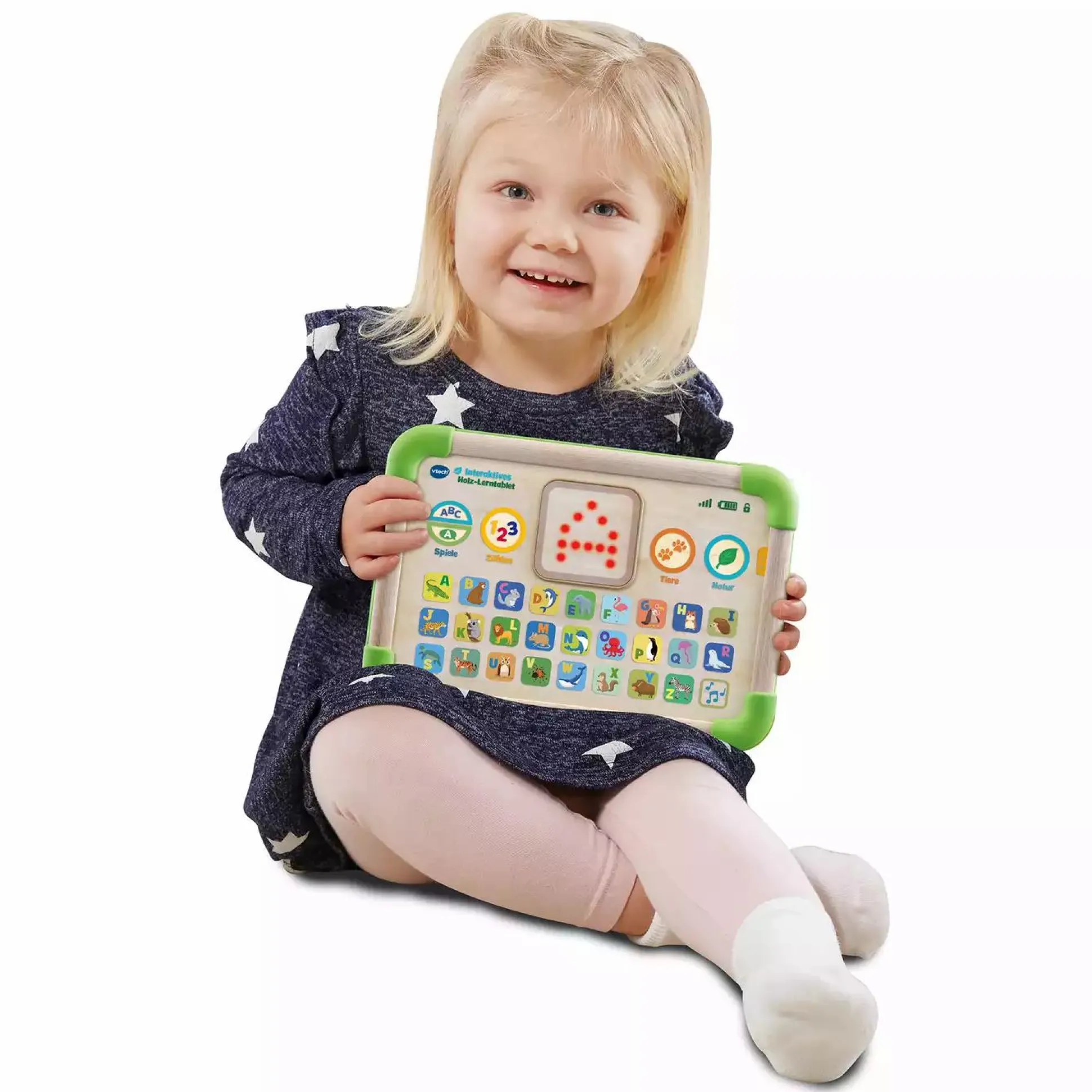 Mit dem interaktiven Holz-Lerntablet von vtech aus nachhaltigen Materialien kann dein Liebling spielerisch Buchstaben, Zahlen, Tiere und die Natur kennenlernen. Werden die Tasten auf dem Tablet gedrückt, werden passende Animationen auf dem leuchtenden Display angezeigt. In verschiedenen Spielmodi kann dein kleiner Schatz spielerisch mit Musik und Tiergeräuschen einen großen Lernspaß erleben.