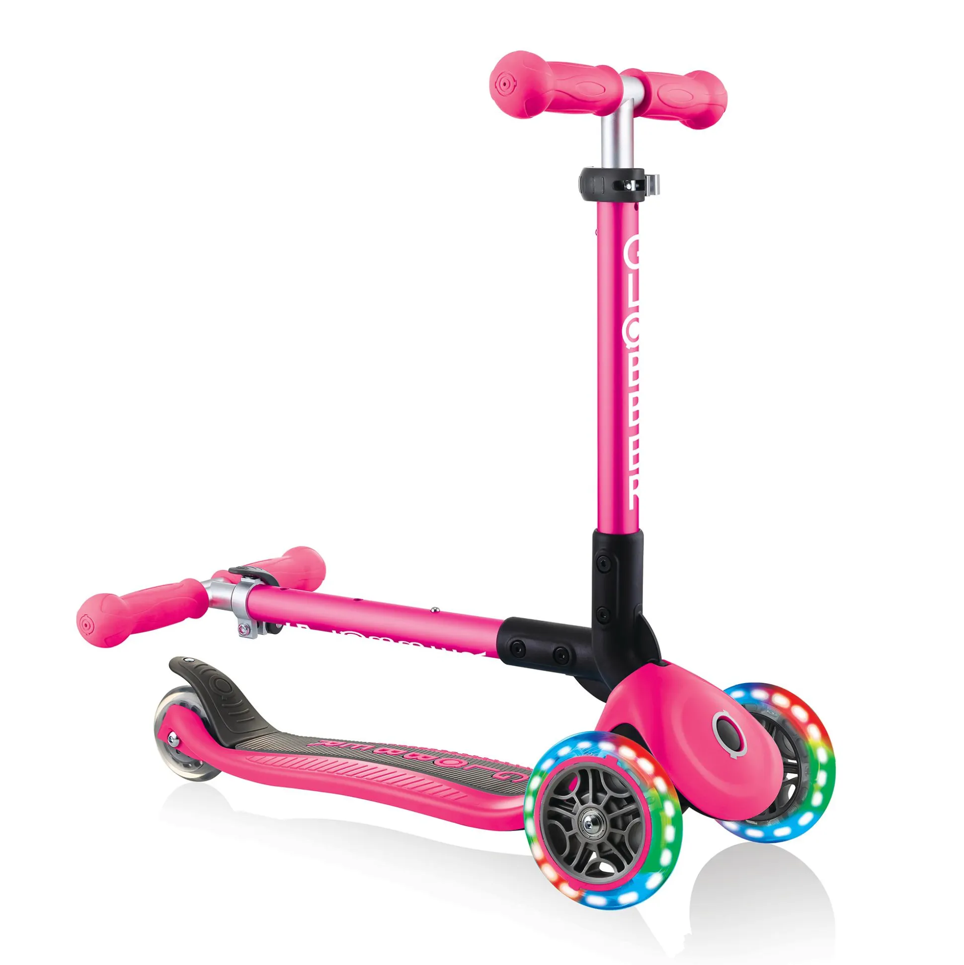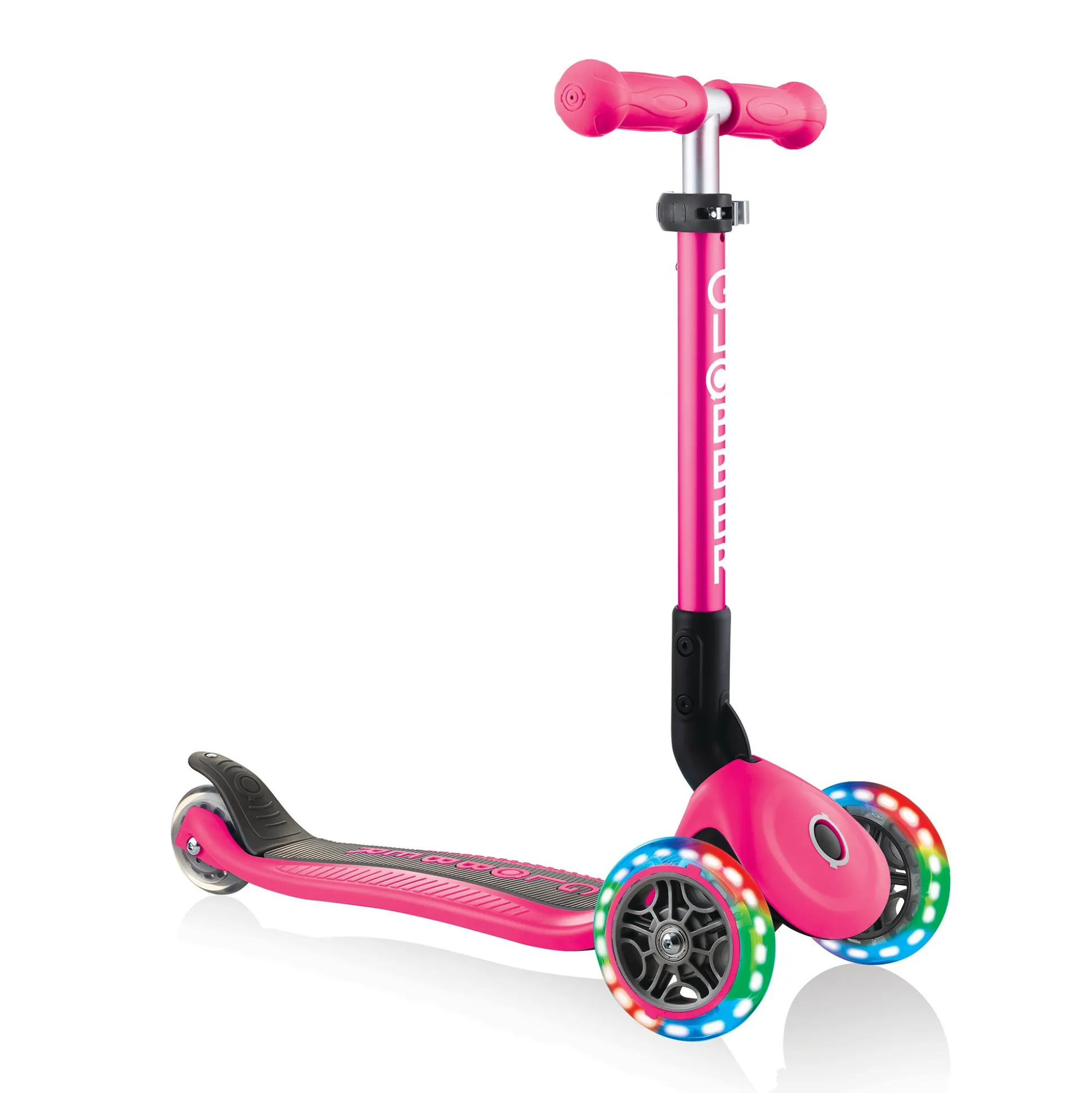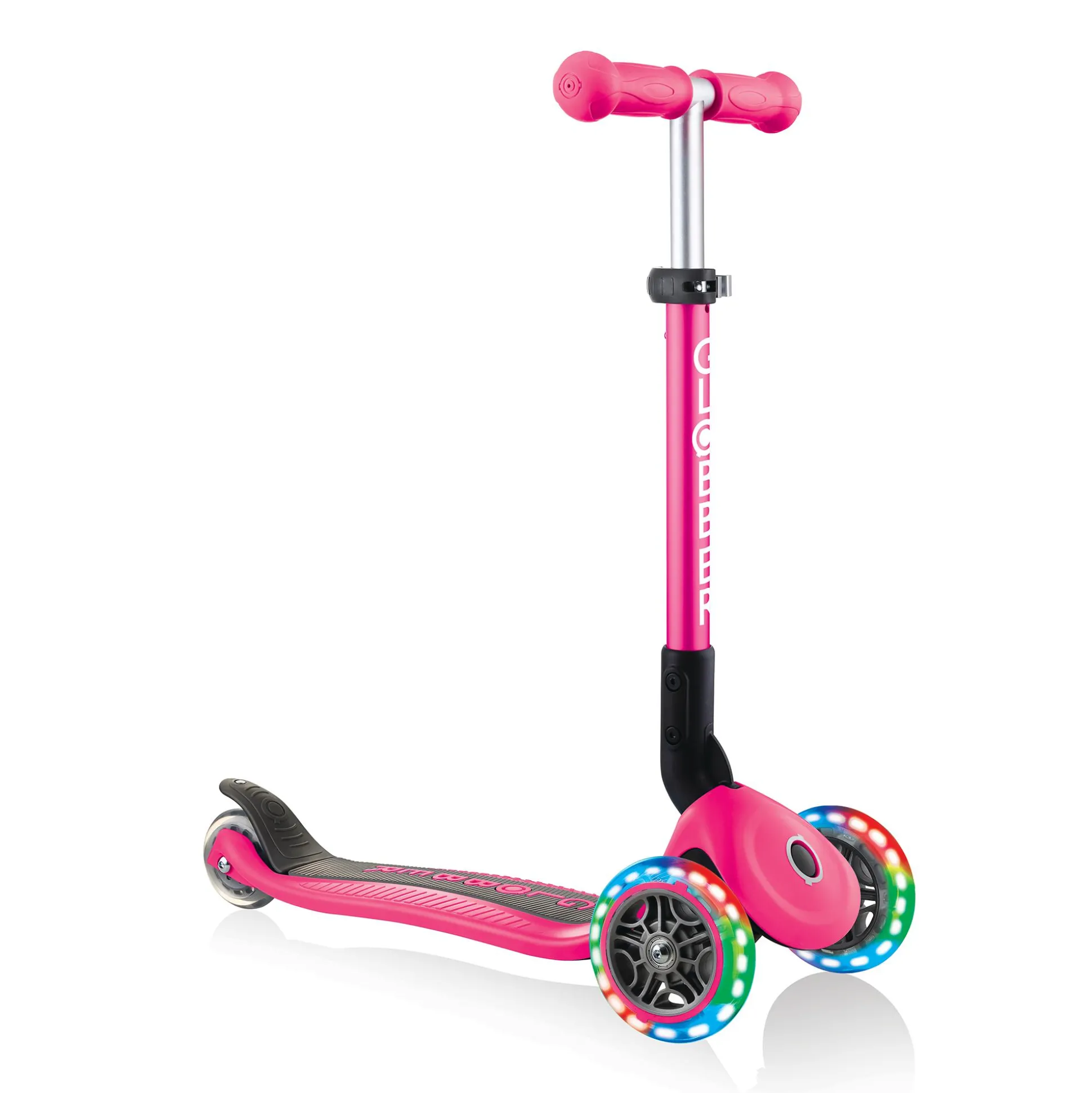 Der Globber Junior Foldable ist dank der bunten Leuchtrollen ein richtiger Hingucker. Das verstärkte Deck ist besonders stabil und sorgt für eine optimale Kontrolle. Durch den patentierten Klappmechanismus wird dir außerdem ein einfaches und schnelles Zusammenklappen in einen Trolley-Modus ermöglicht.Für eine optimale Steuerung und höheren Komfort beim Fahren bietet der Roller ein Fahrwerk mit Kugellager und einen Speichenschutz. Der Lenker ist zusätzlich 3-fach höhenverstellbar und kann so optimal an dein Kind angepasst werden. Das maximale Benutzergewicht beläuft sich auf ca. 50 kg.
