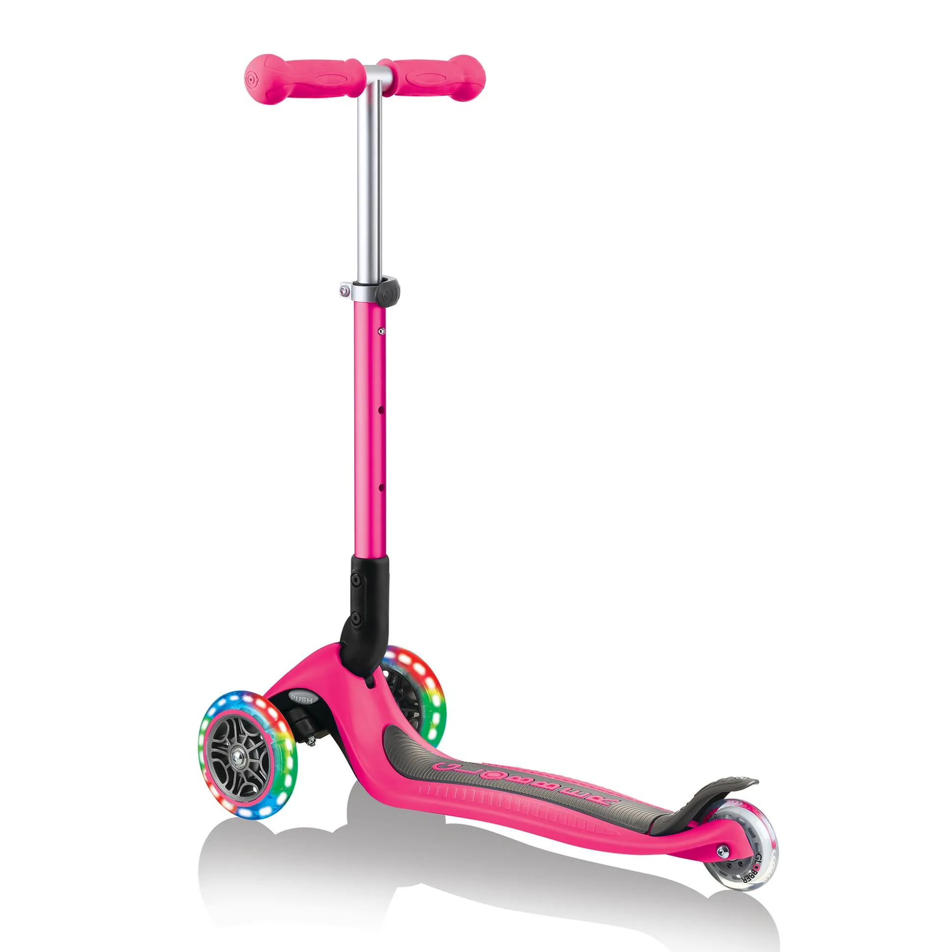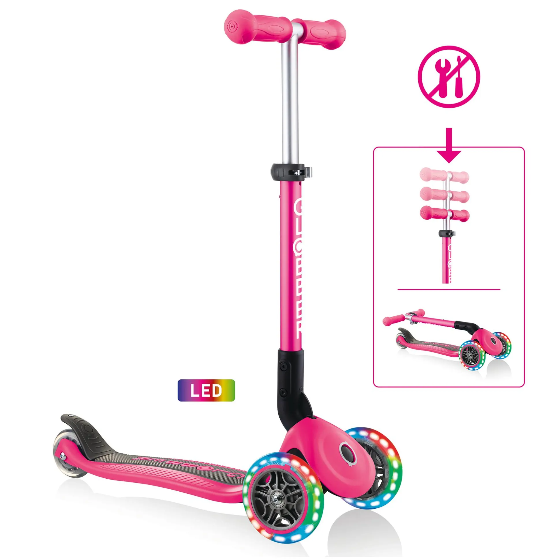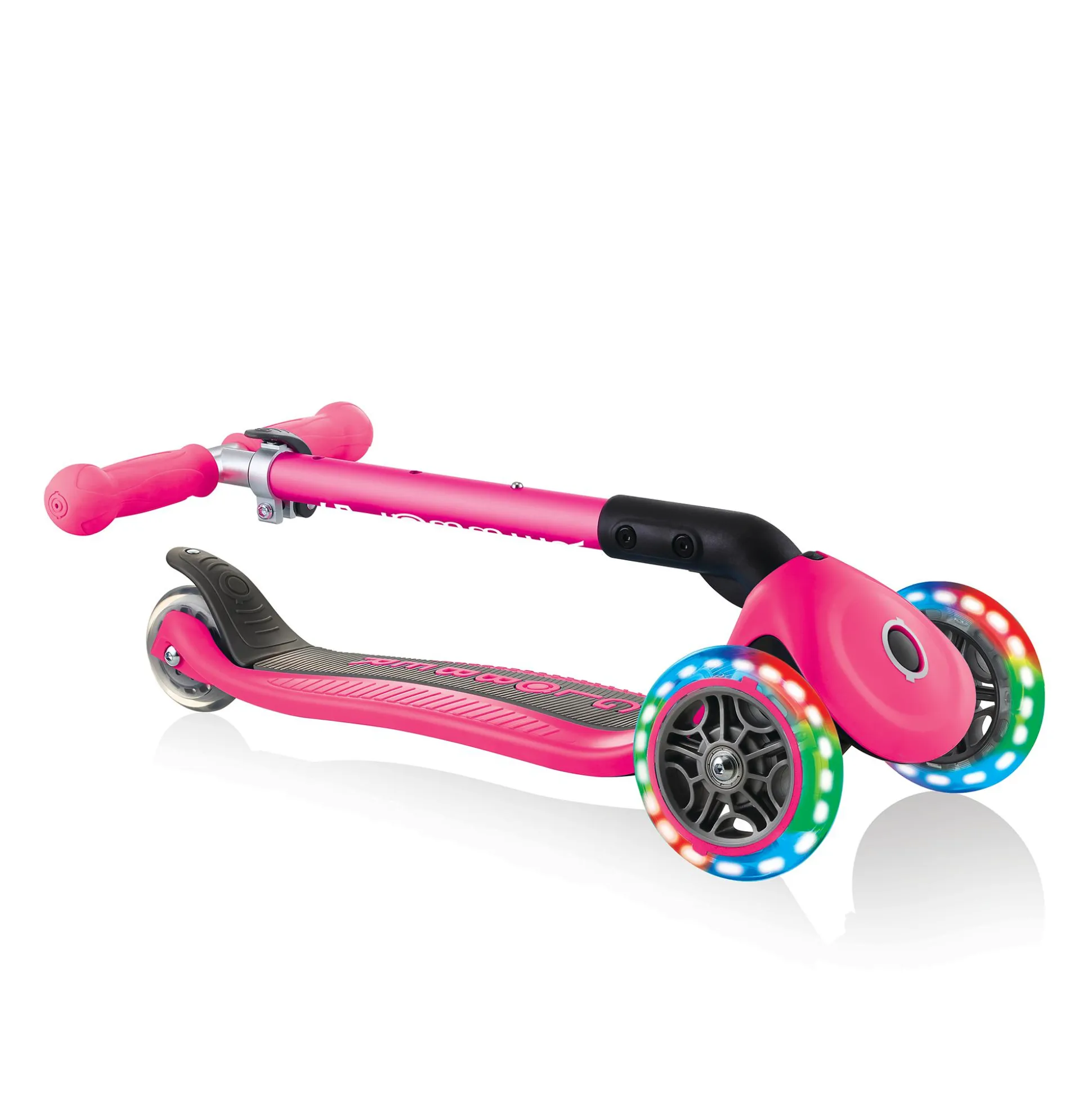 Der Globber Junior Foldable ist dank der bunten Leuchtrollen ein richtiger Hingucker. Das verstärkte Deck ist besonders stabil und sorgt für eine optimale Kontrolle. Durch den patentierten Klappmechanismus wird dir außerdem ein einfaches und schnelles Zusammenklappen in einen Trolley-Modus ermöglicht.Für eine optimale Steuerung und höheren Komfort beim Fahren bietet der Roller ein Fahrwerk mit Kugellager und einen Speichenschutz. Der Lenker ist zusätzlich 3-fach höhenverstellbar und kann so optimal an dein Kind angepasst werden. Das maximale Benutzergewicht beläuft sich auf ca. 50 kg.