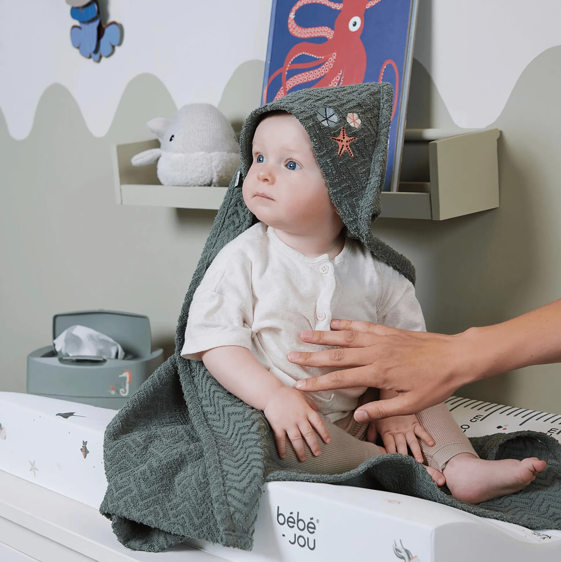 Mit dem Kapuzentuch „Ocean Vibes“ von bébé-jou findet die Badezeit einen gemütlichen Abschluss. Nach dem Baden kannst du deine kleine Wasserratte sicher und warm in das große Kapuzentuch einwickeln. Doch nicht nur das Design überzeugt, auch das Material des Frotteeartikels ist erwähnenswert. Es besteht zu 100% aus Baumwolle und ist damit besonders weich und saugstark.